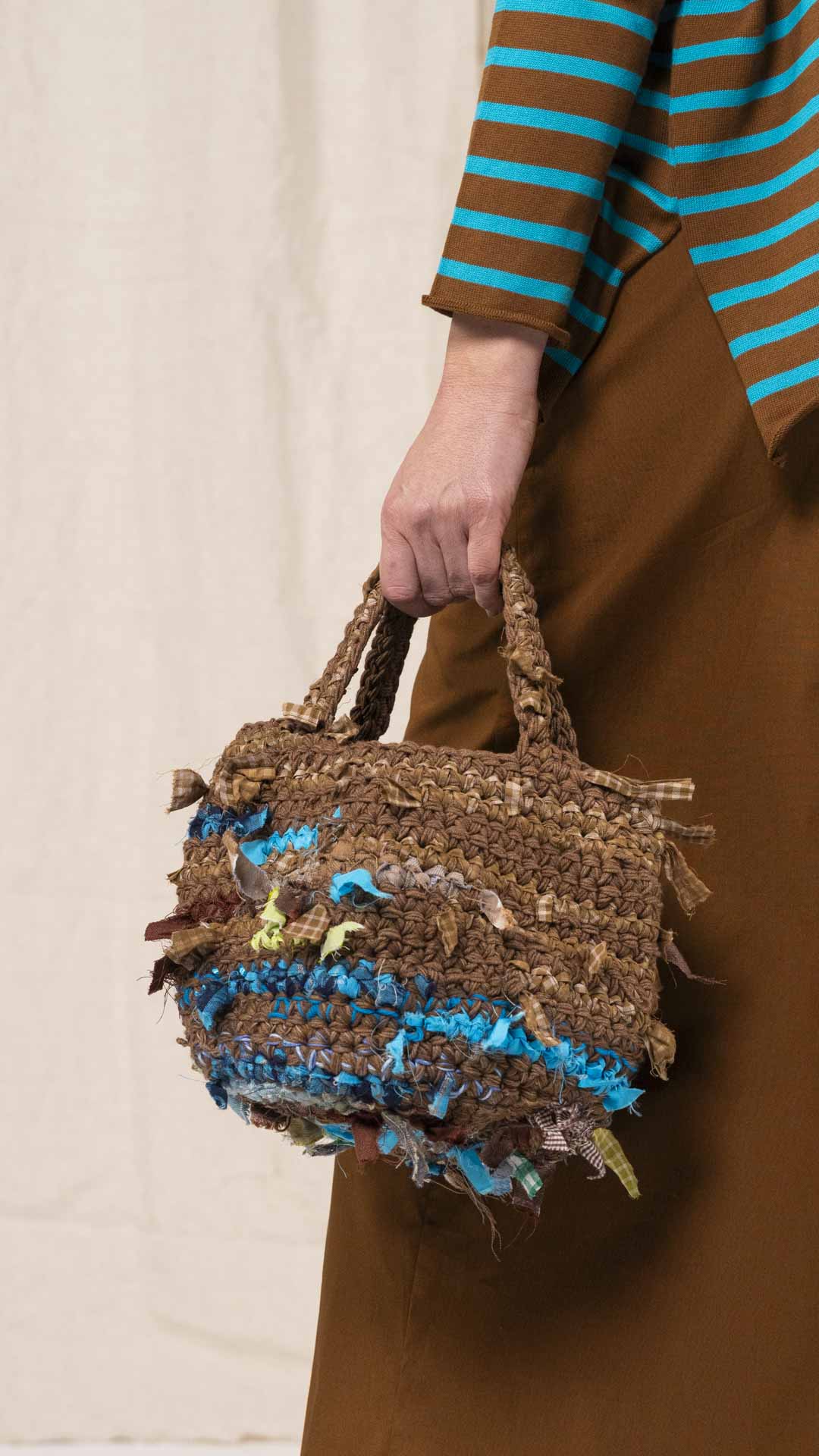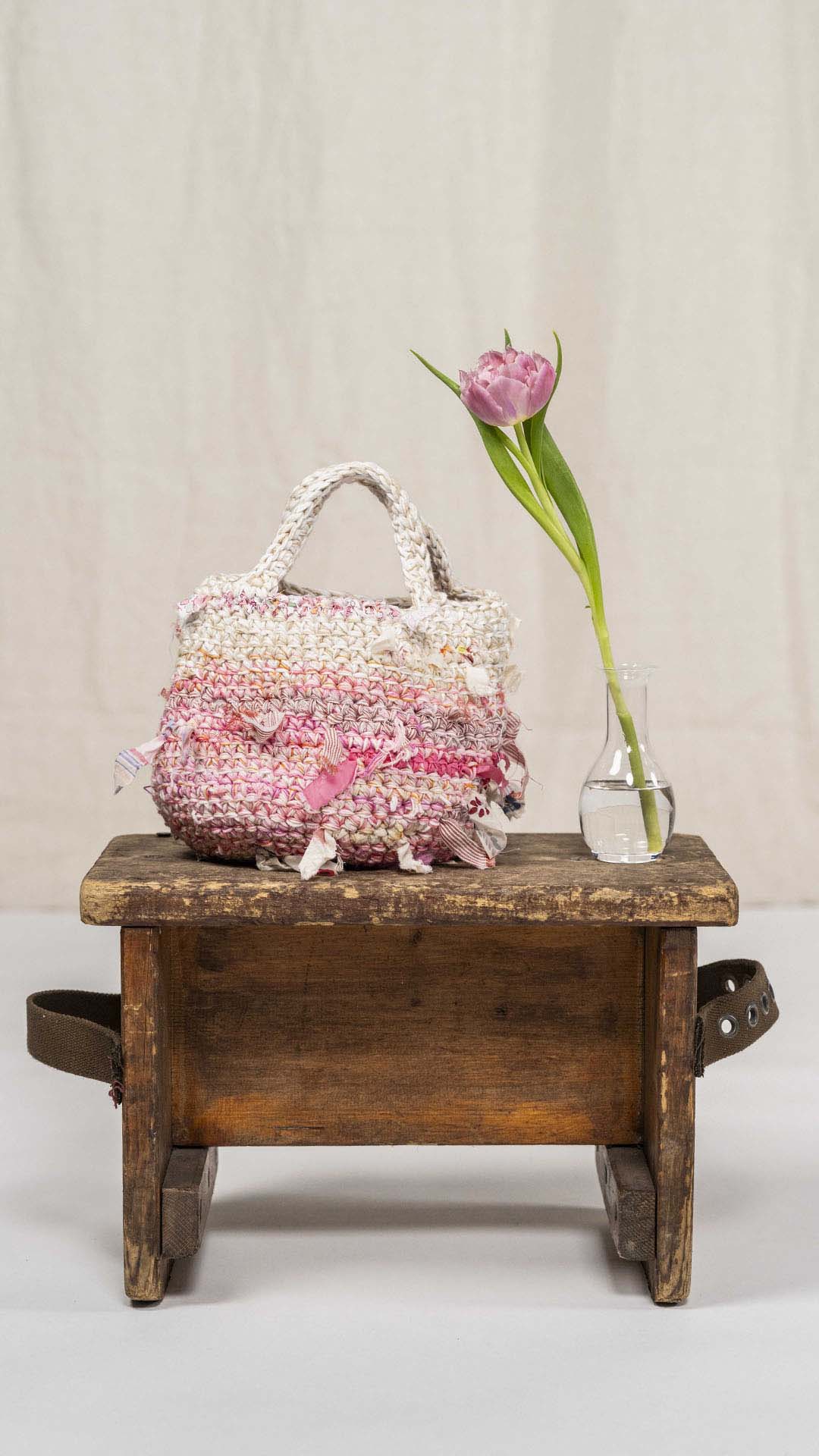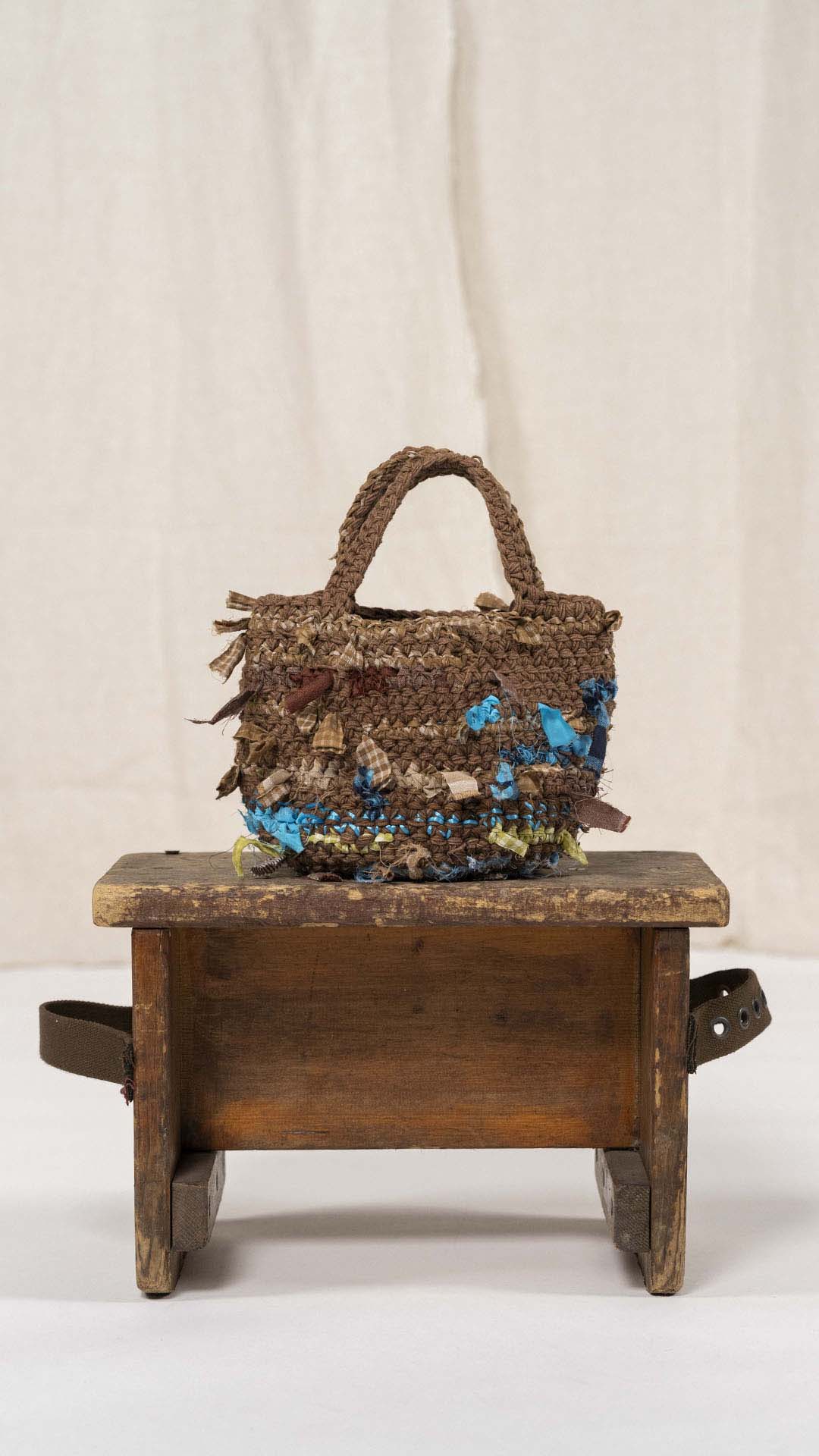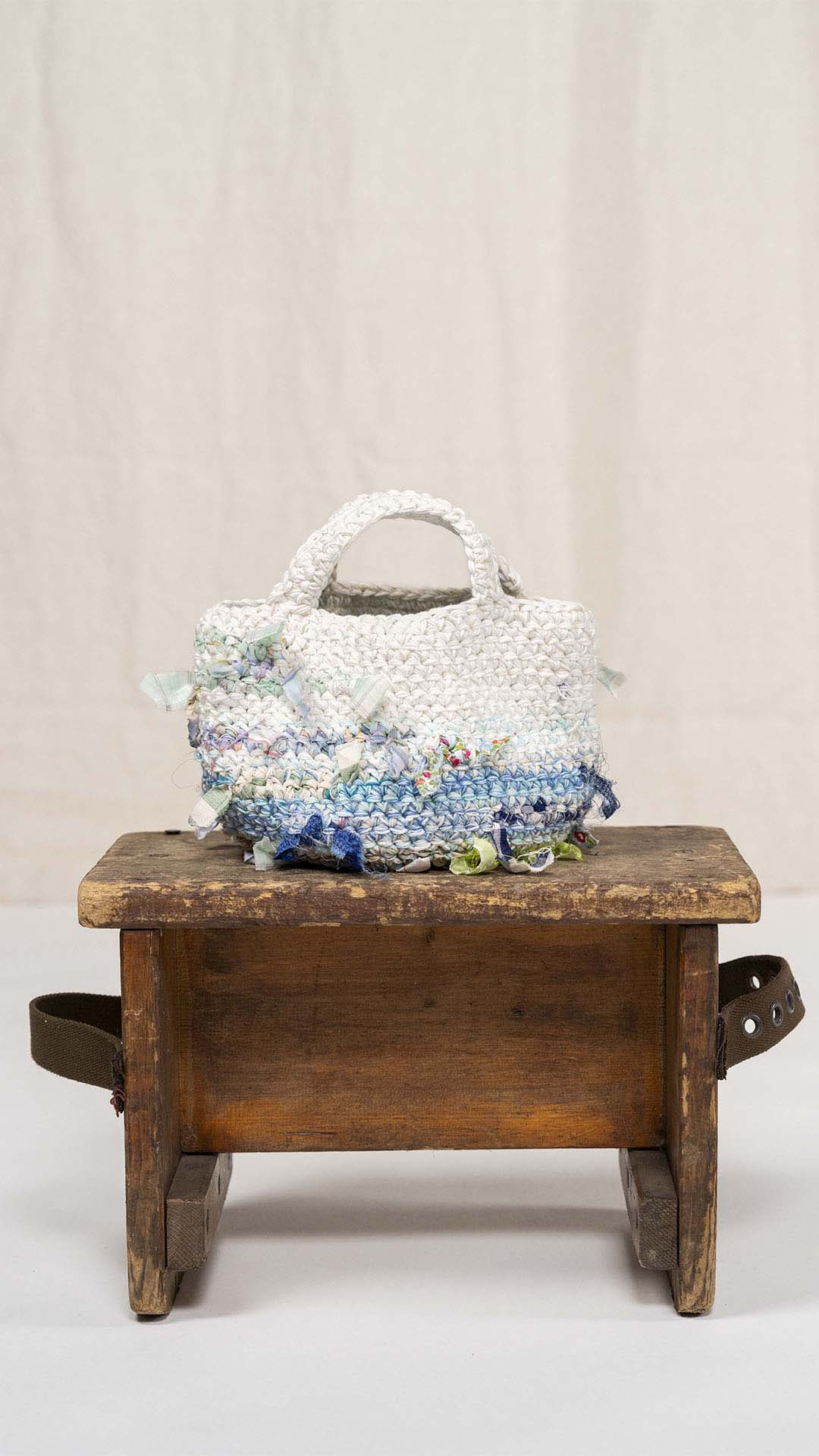Borsa lavorata a uncinetto, con inserti di tessuto che seguono le gradazioni dei fili, come se fossero filati intrecciati tra loro. Ogni esemplare è unico nella sua composizione e nei dettagli.