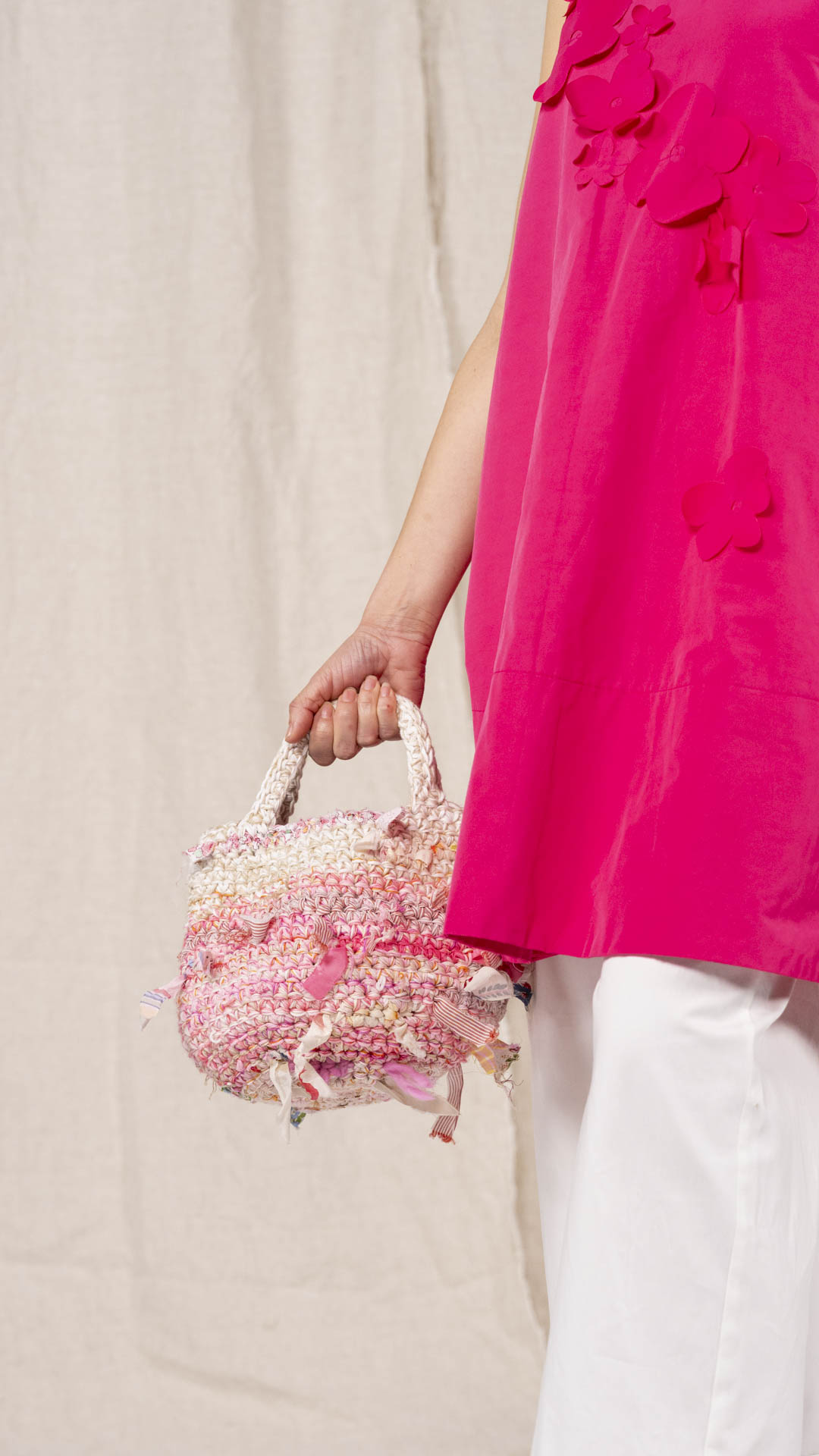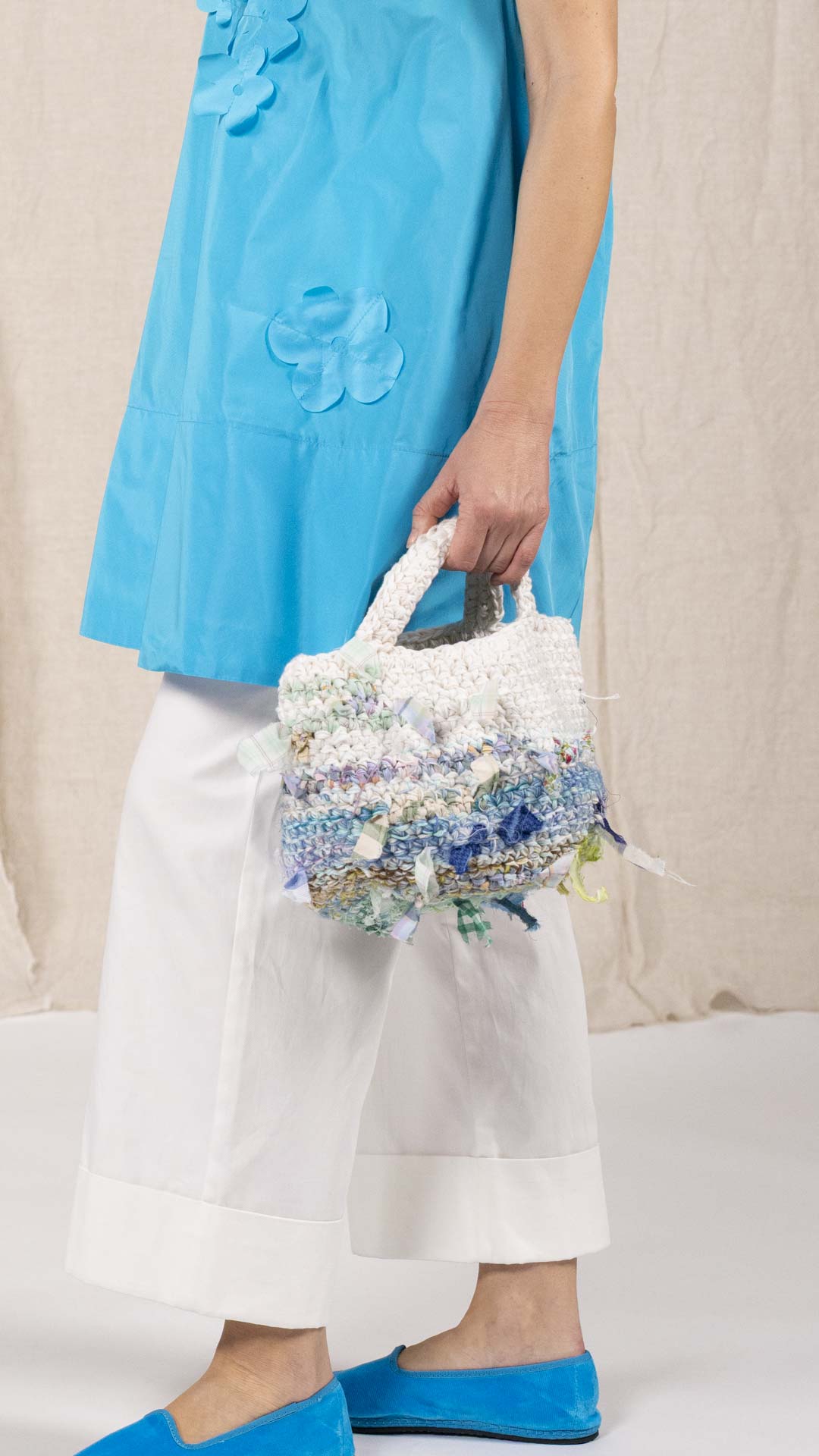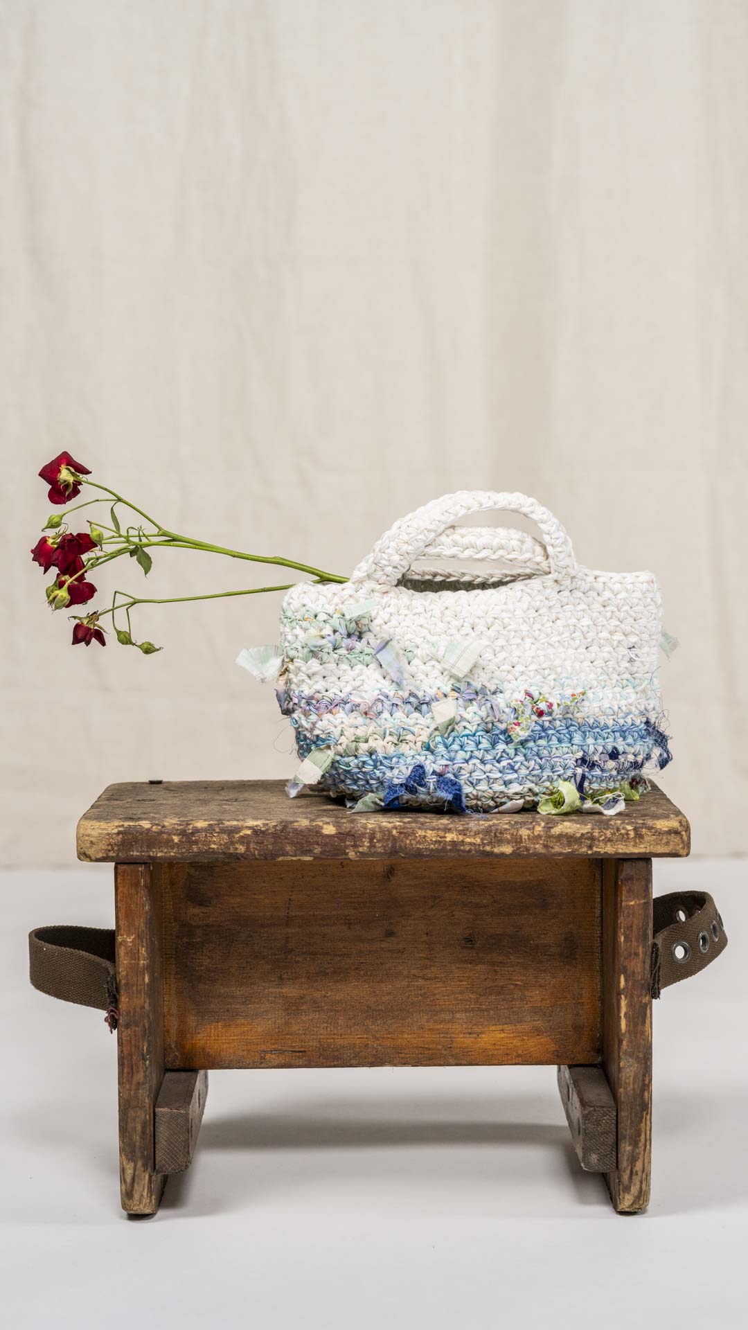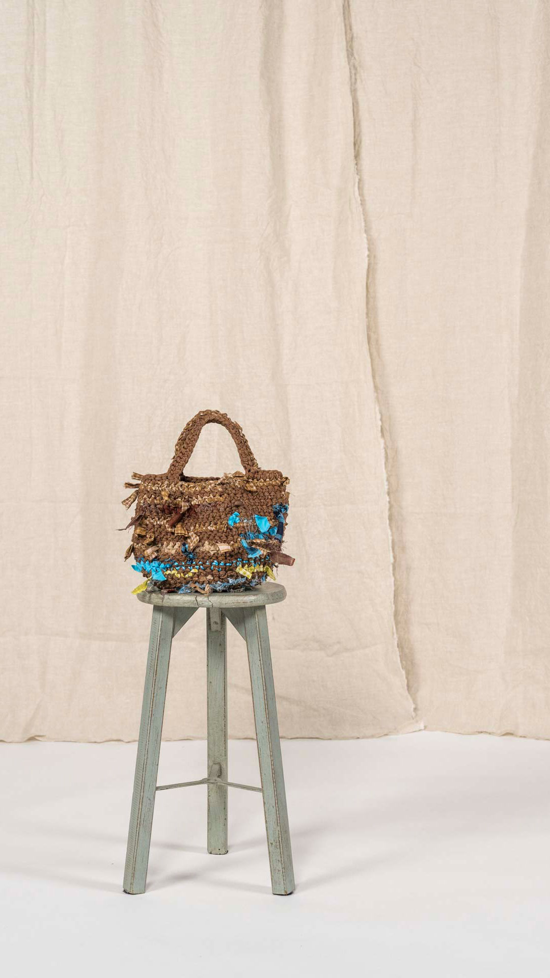 Borsa lavorata a uncinetto, con inserti di tessuto che seguono le gradazioni dei fili, come se fossero filati intrecciati tra loro. Ogni esemplare è unico nella sua composizione e nei dettagli.