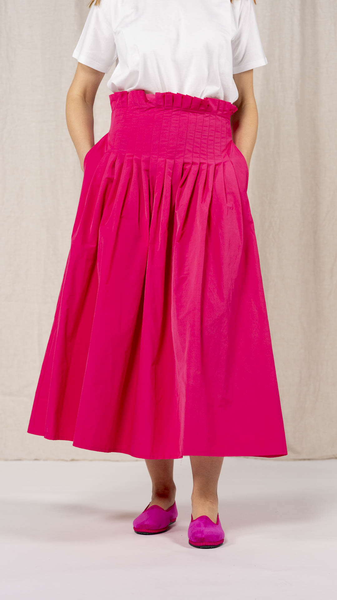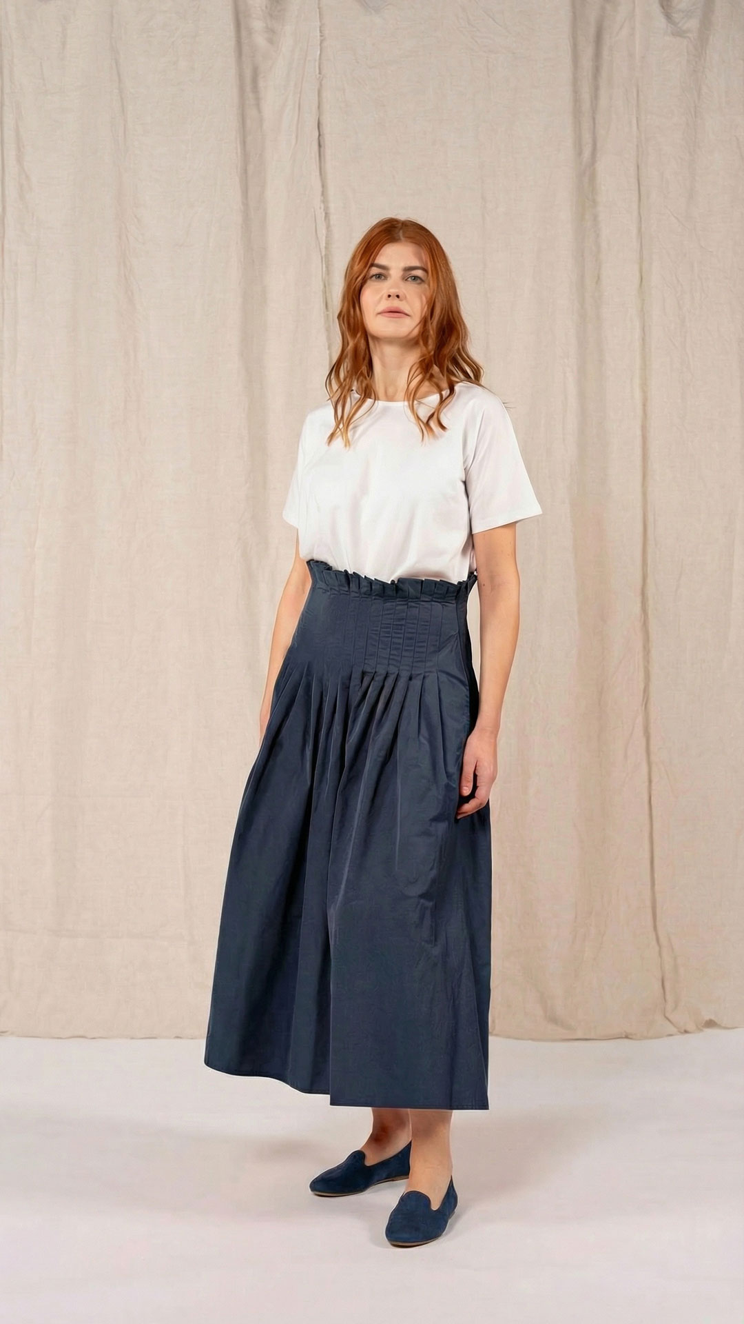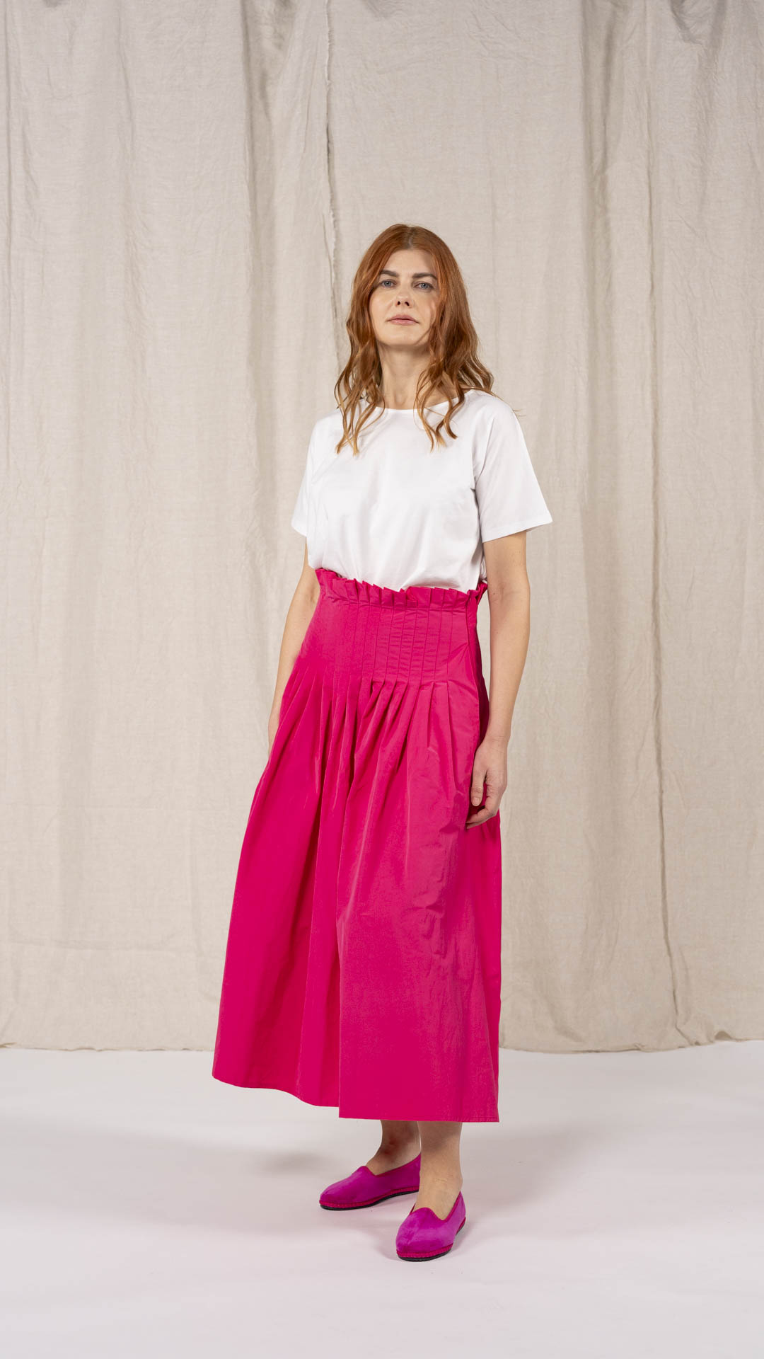 Gonna con baschina interamente plissettata, arricchita da una pratica cerniera laterale. Versatile e facile da abbinare, si presta sia a look casual con una scarpa da ginnastica, sia a outfit più ricercati, completando con stile capi come la maglia Aurora.