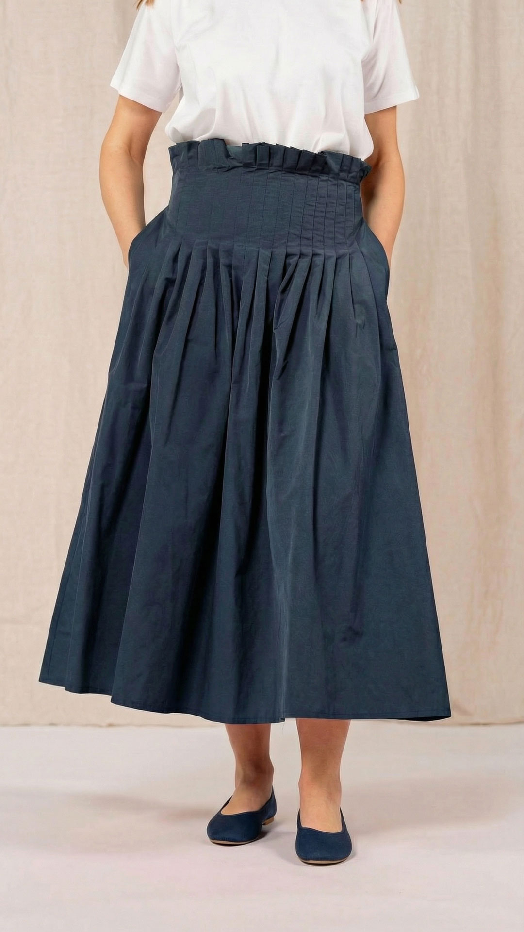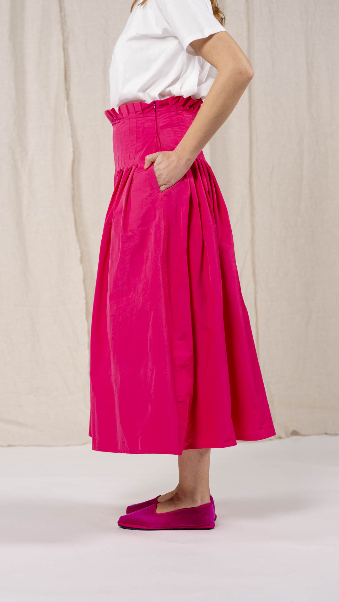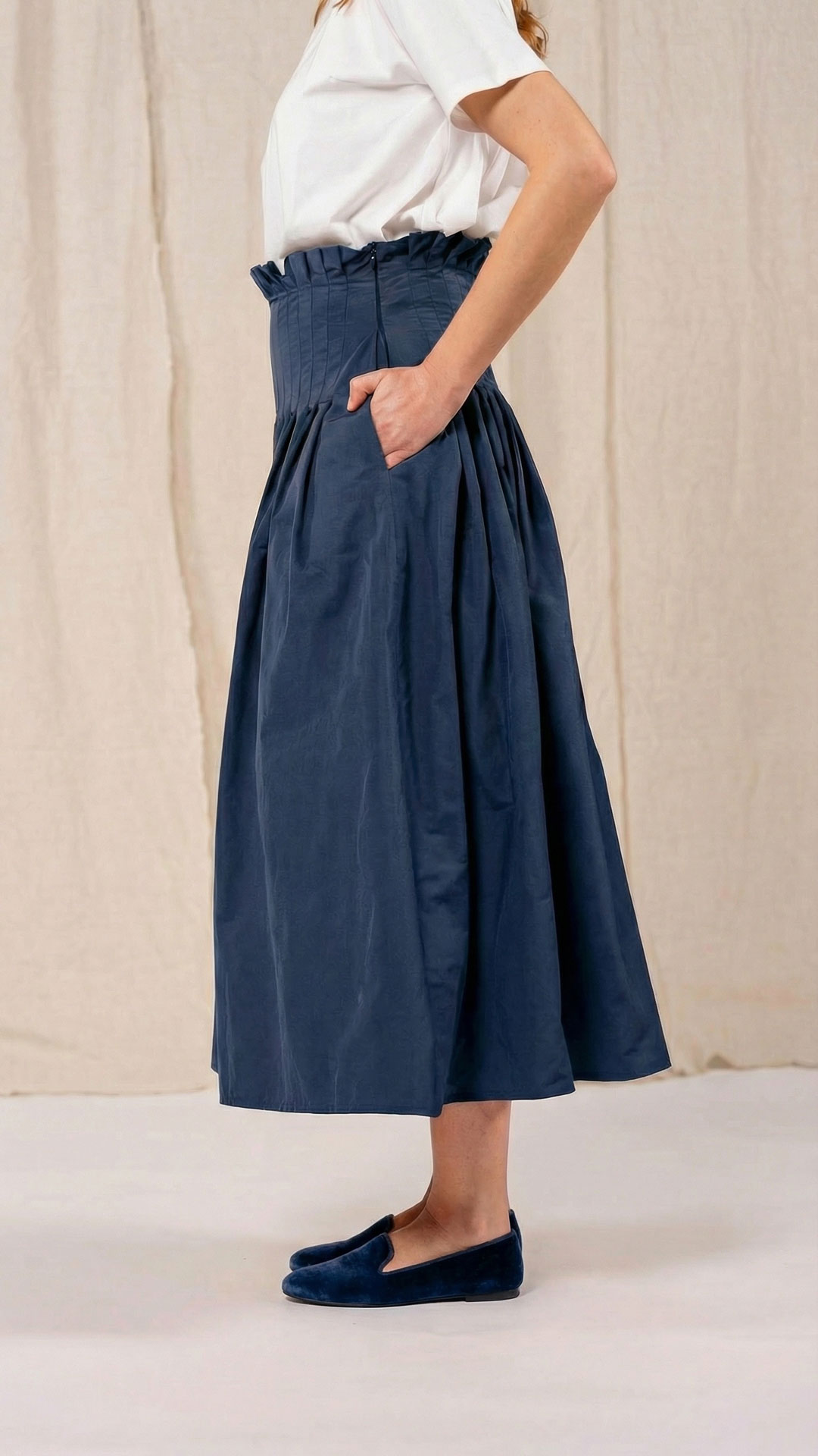 Gonna con baschina interamente plissettata, arricchita da una pratica cerniera laterale. Versatile e facile da abbinare, si presta sia a look casual con una scarpa da ginnastica, sia a outfit più ricercati, completando con stile capi come la maglia Aurora.