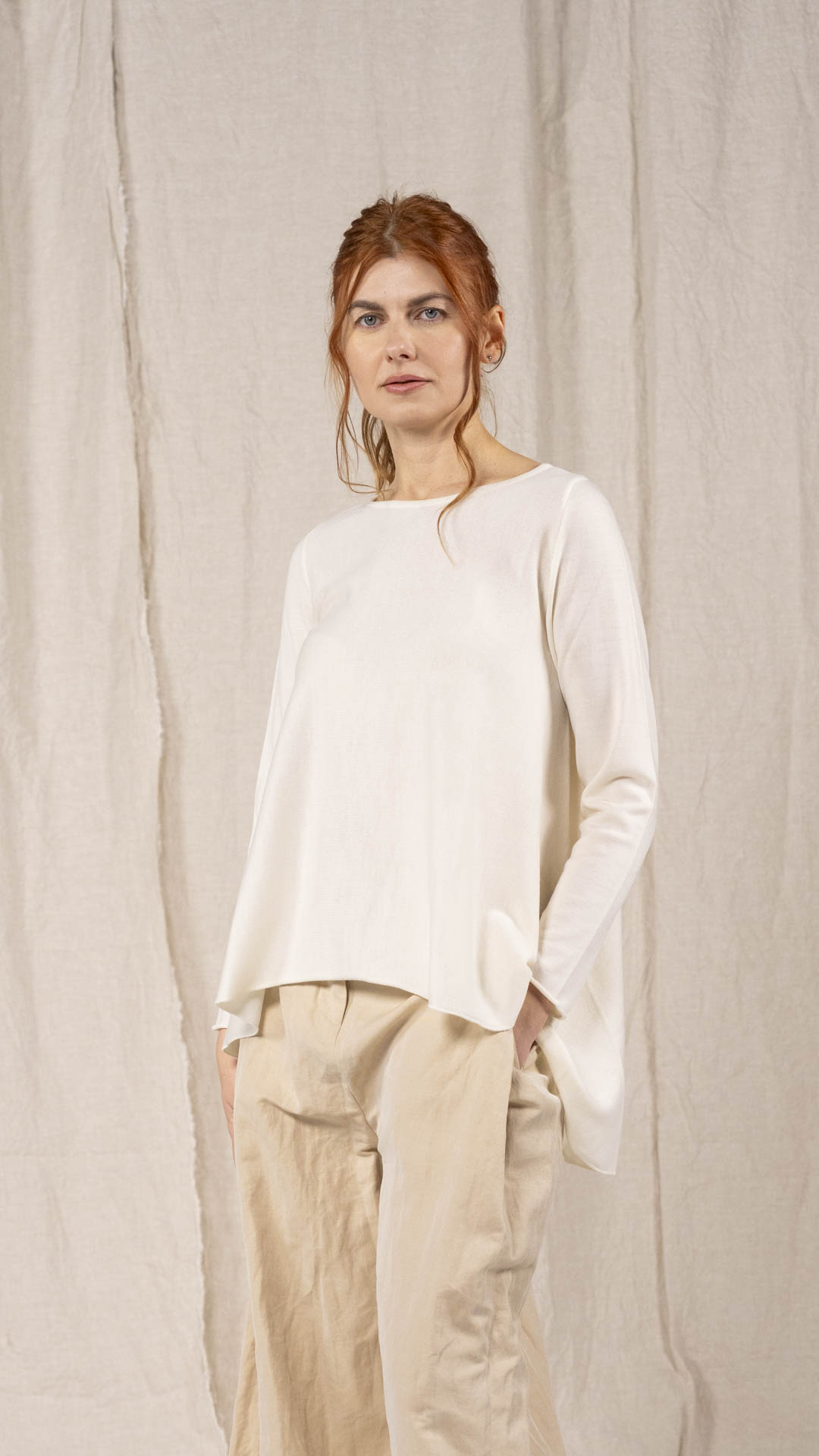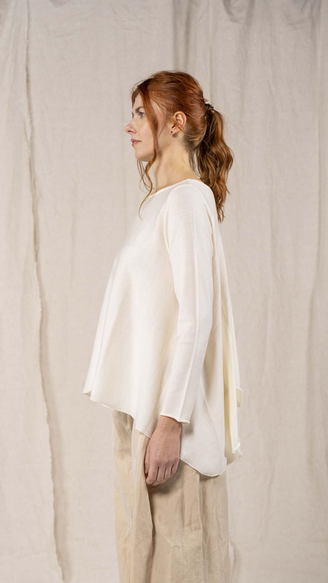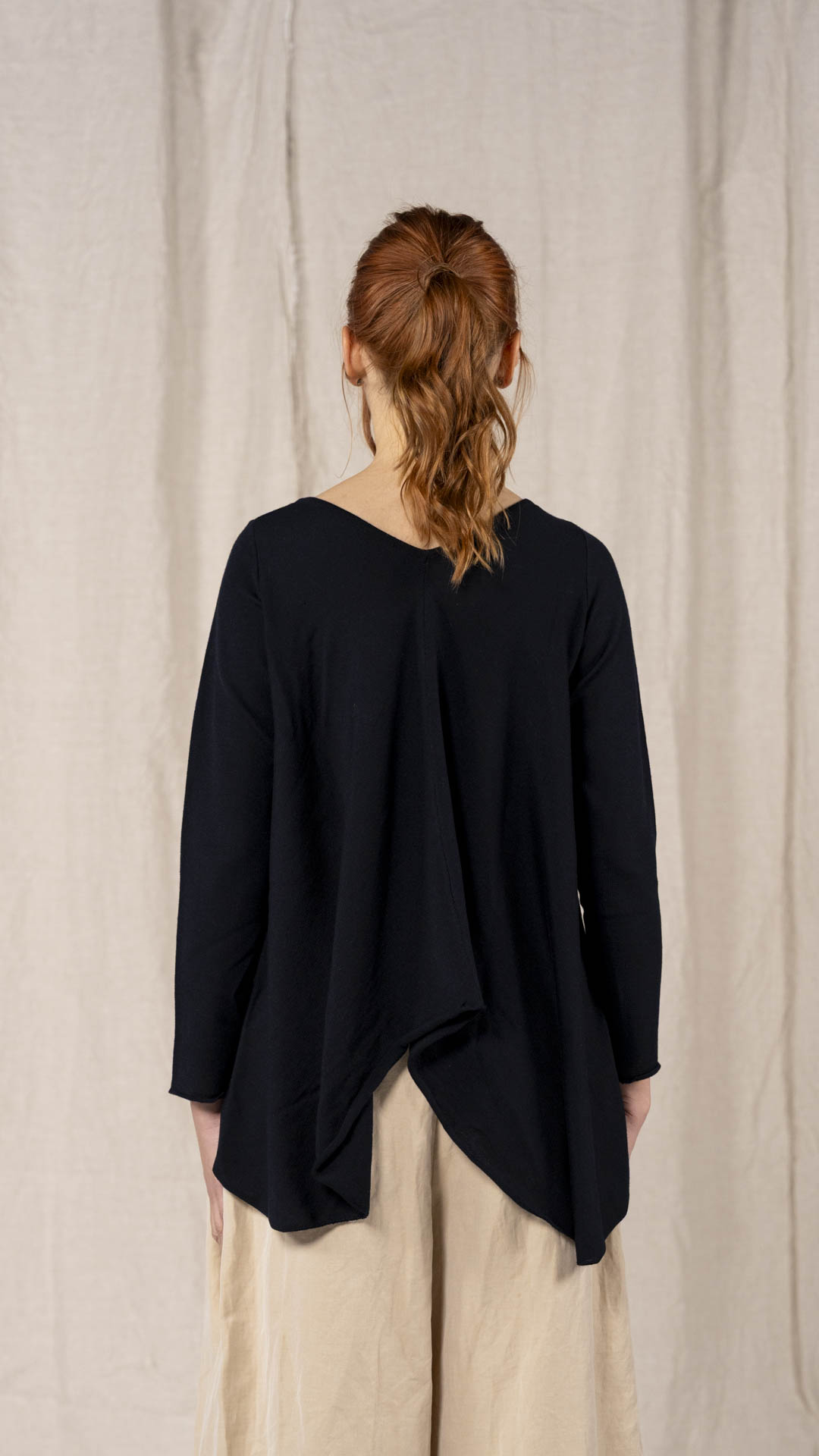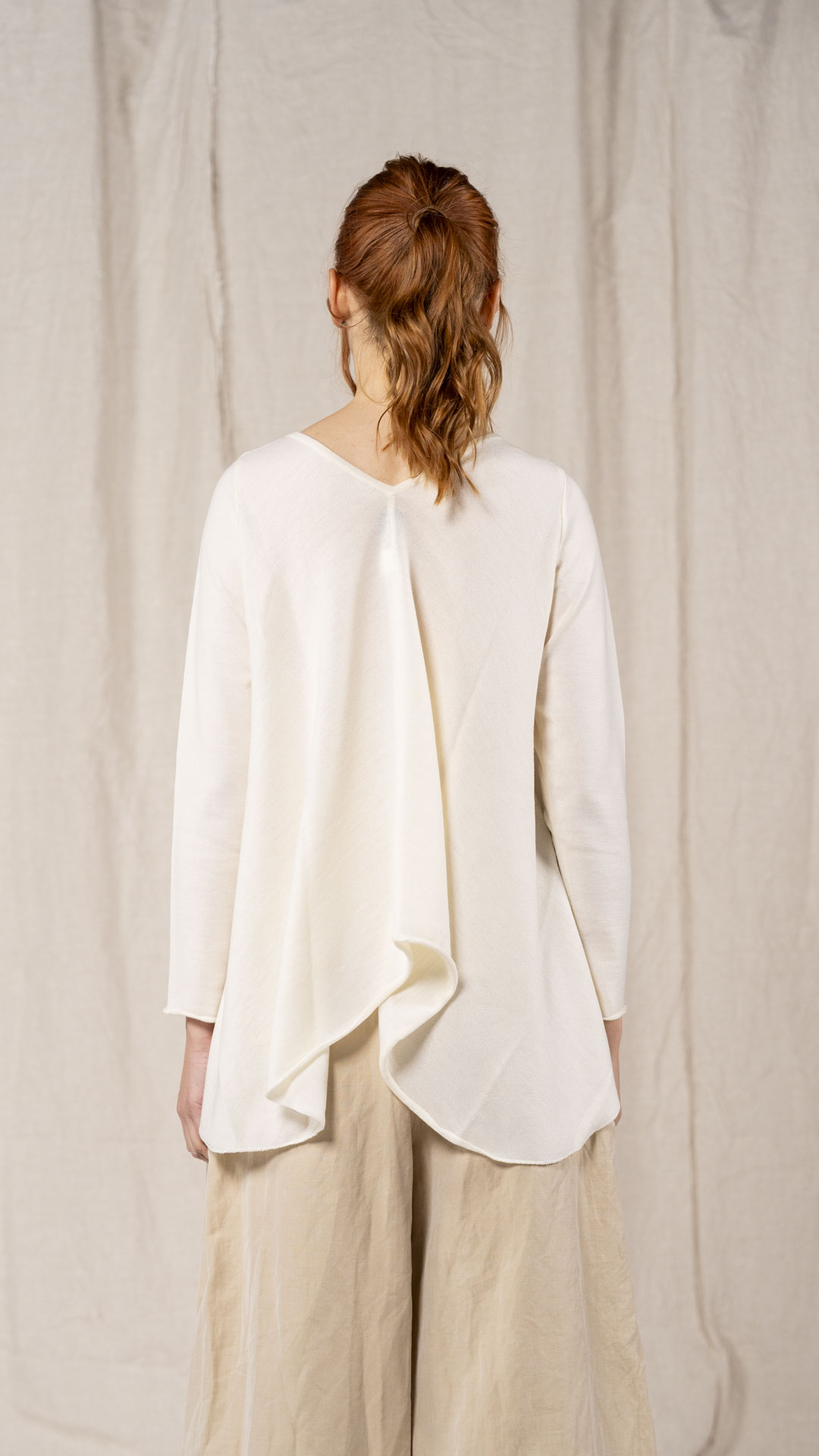 Maglia caratterizzata da una cucitura lungo la schiena che dona morbidezza e genera due leggere “code”, aggiungendo movimento al capo. Può essere indossata in chiave sportiva o abbinata a tessuti più sofisticati, come il taffetà, per un look raffinato e contemporaneo.