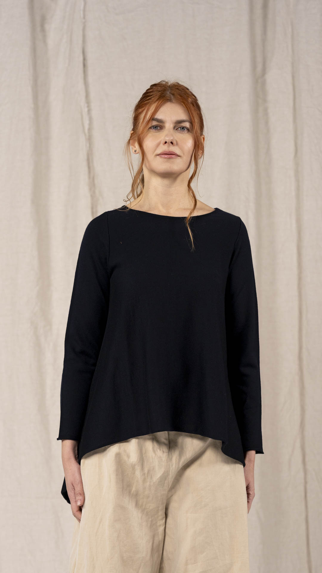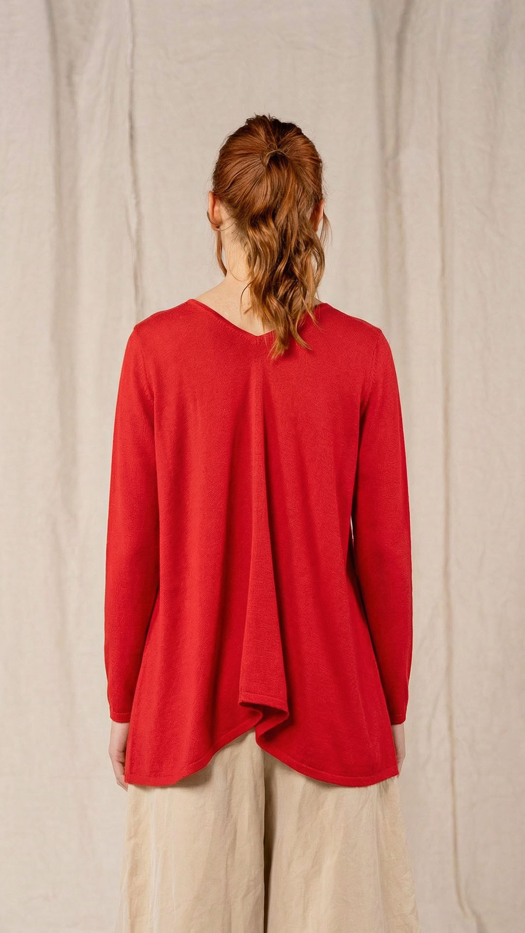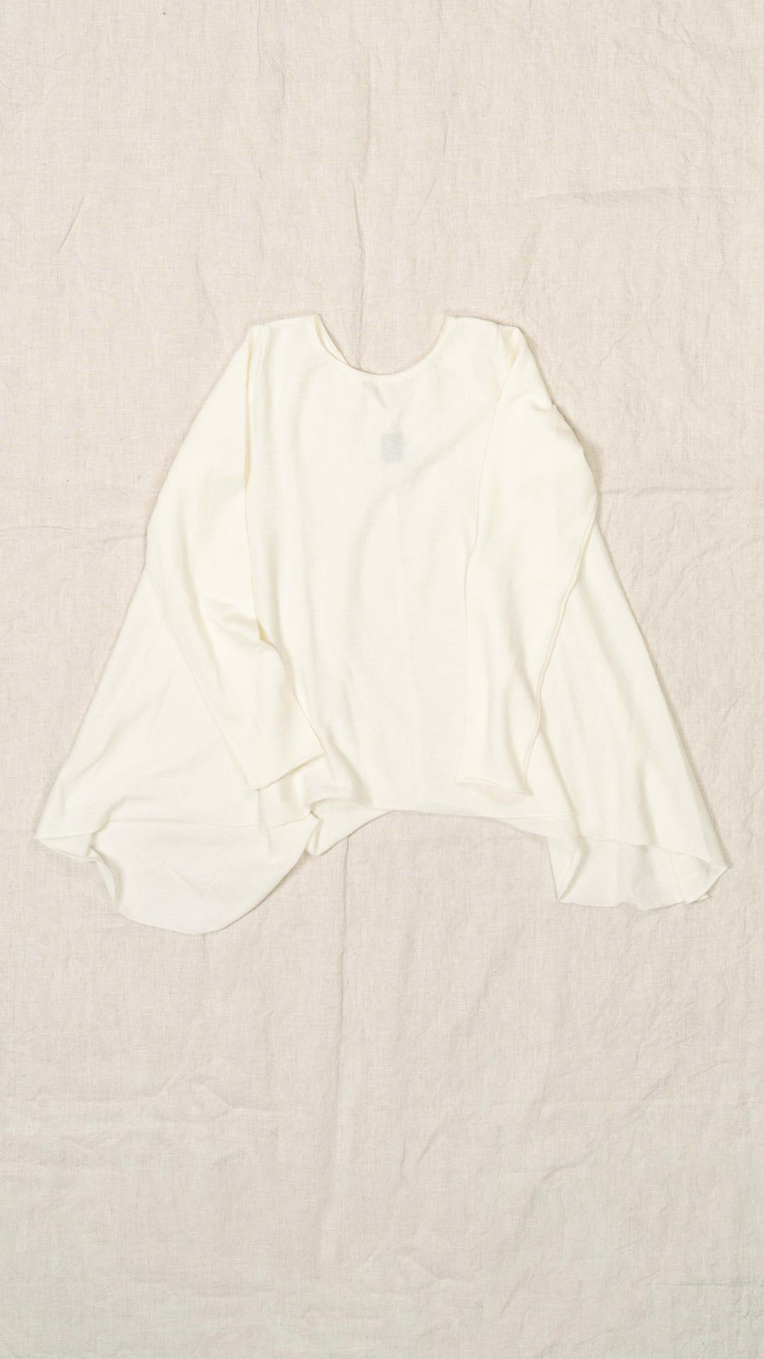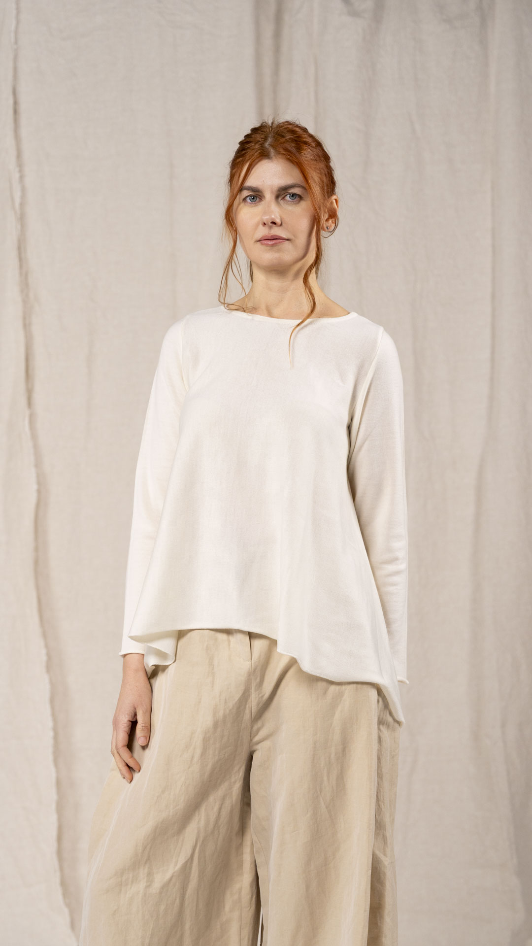 Maglia caratterizzata da una cucitura lungo la schiena che dona morbidezza e genera due leggere “code”, aggiungendo movimento al capo. Può essere indossata in chiave sportiva o abbinata a tessuti più sofisticati, come il taffetà, per un look raffinato e contemporaneo.