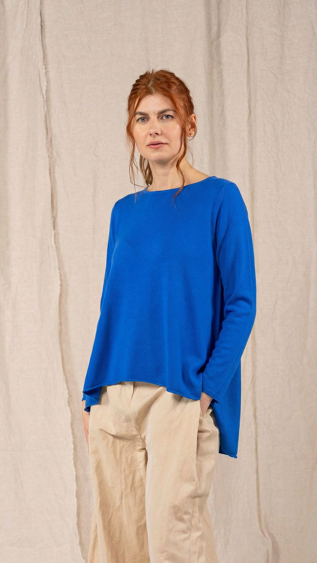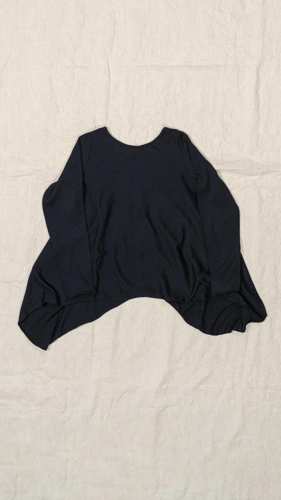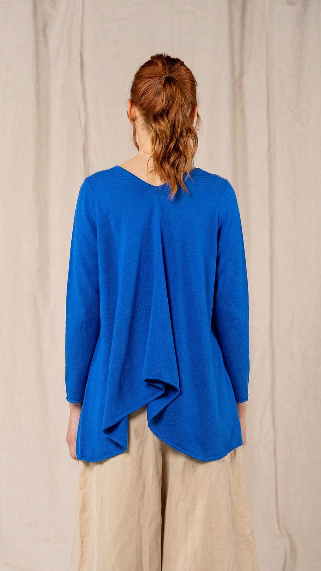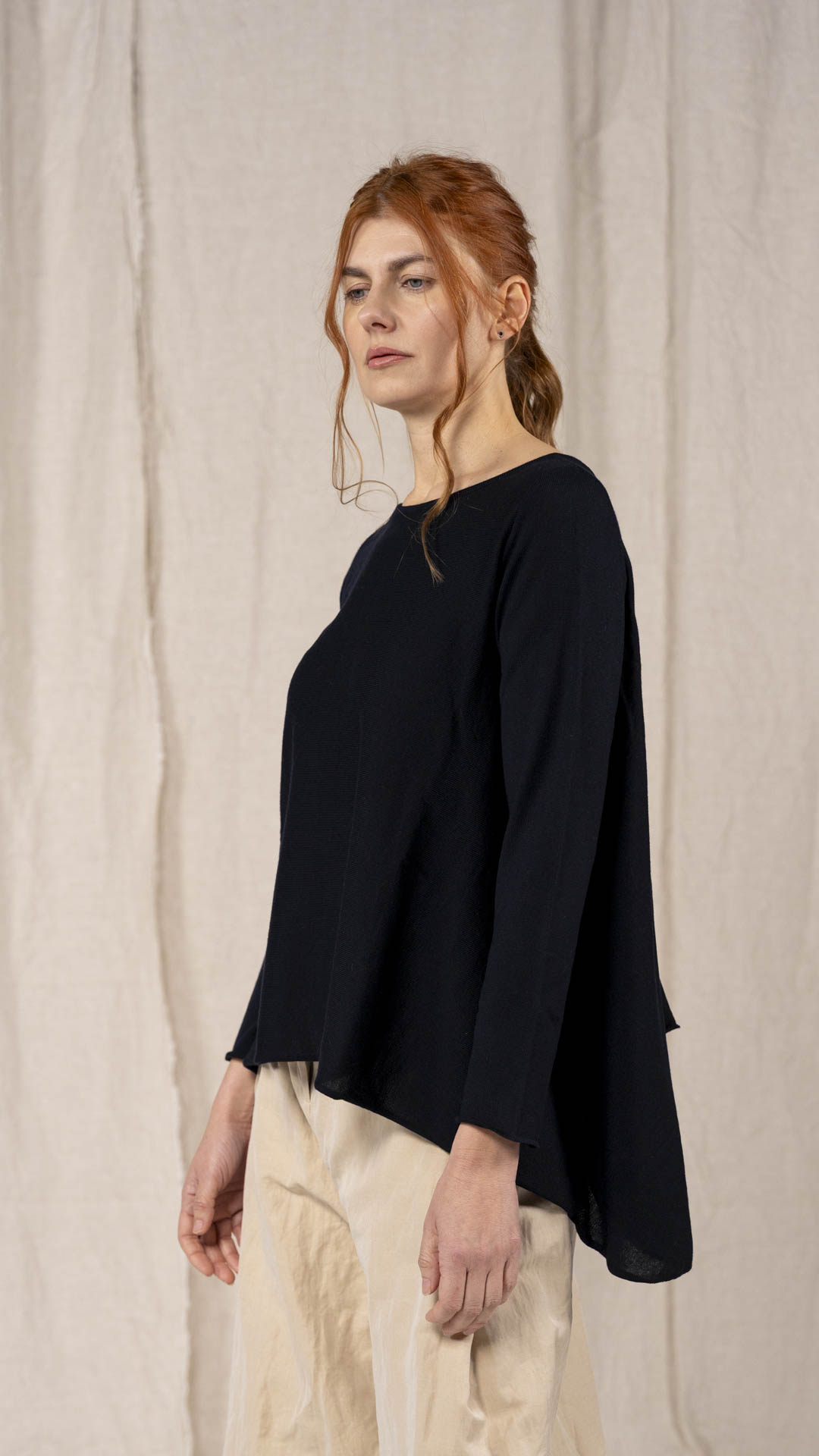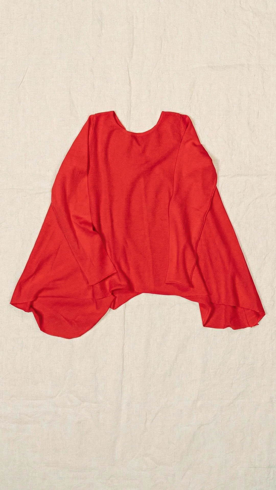 Maglia caratterizzata da una cucitura lungo la schiena che dona morbidezza e genera due leggere “code”, aggiungendo movimento al capo. Può essere indossata in chiave sportiva o abbinata a tessuti più sofisticati, come il taffetà, per un look raffinato e contemporaneo.