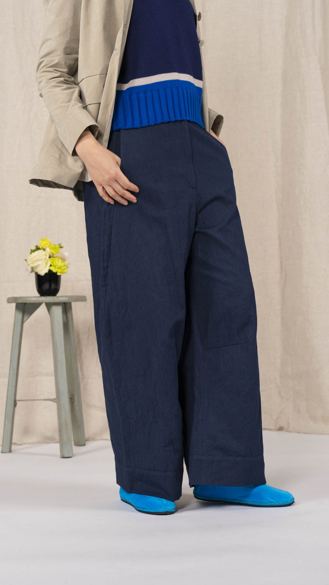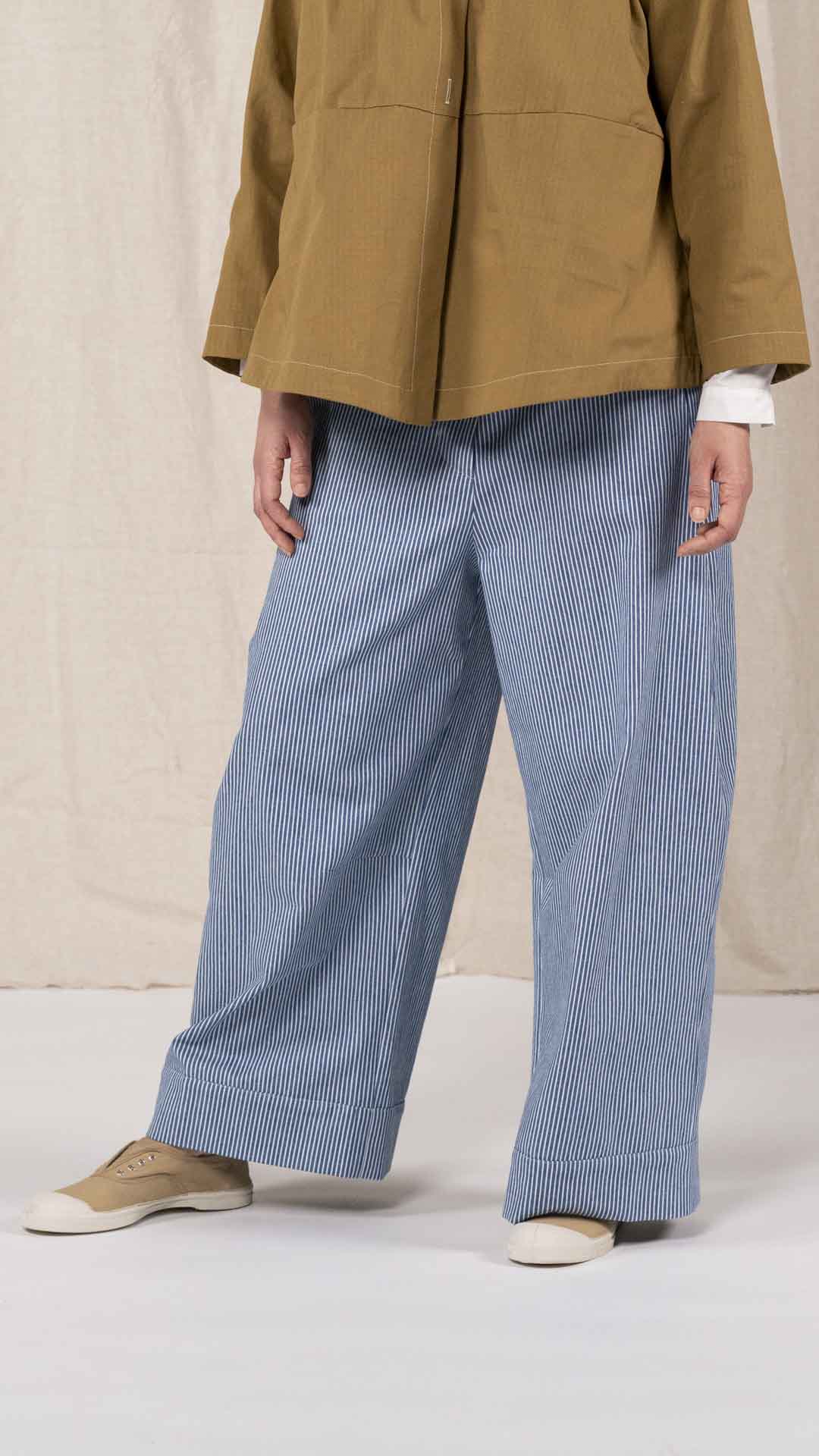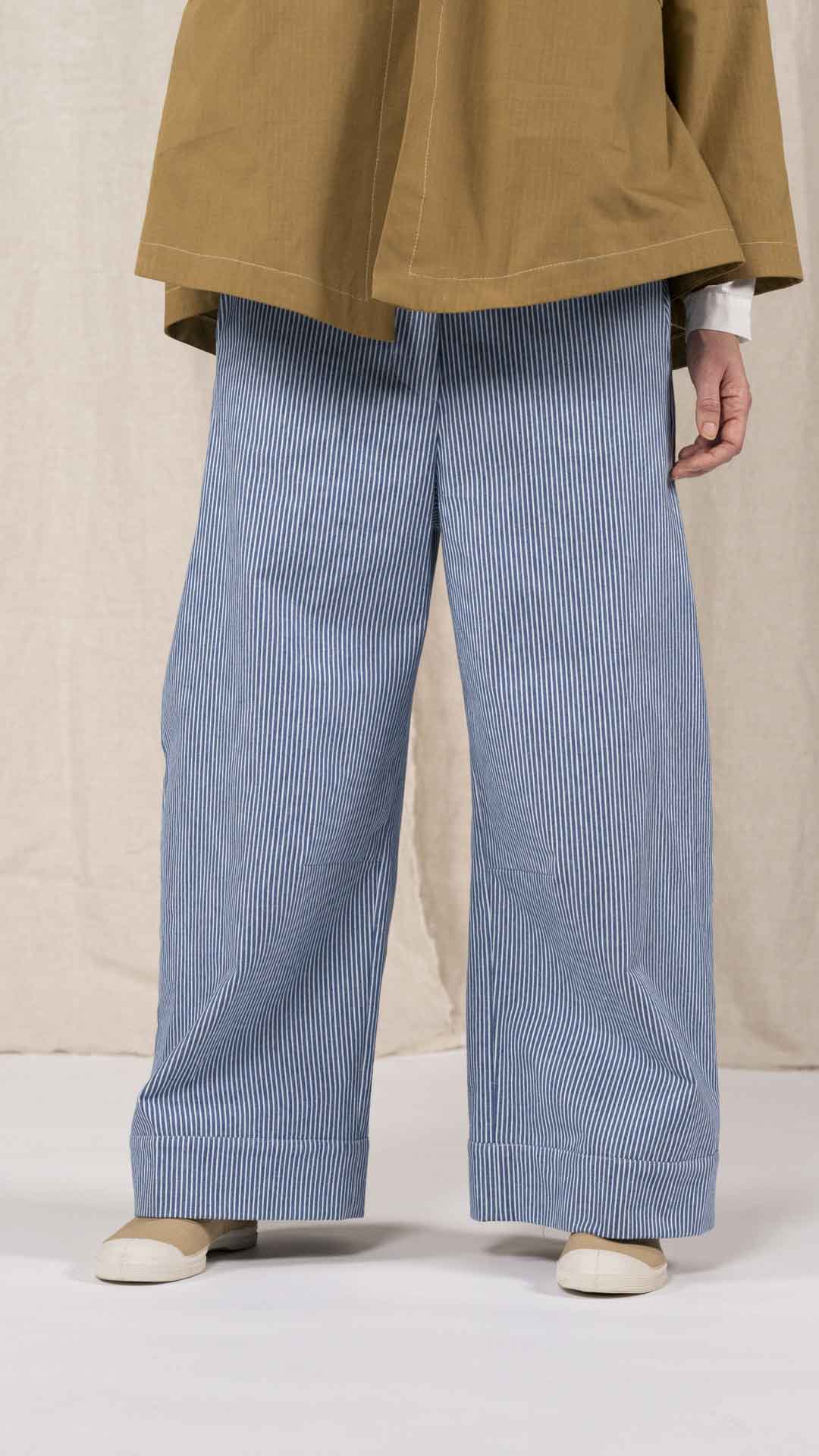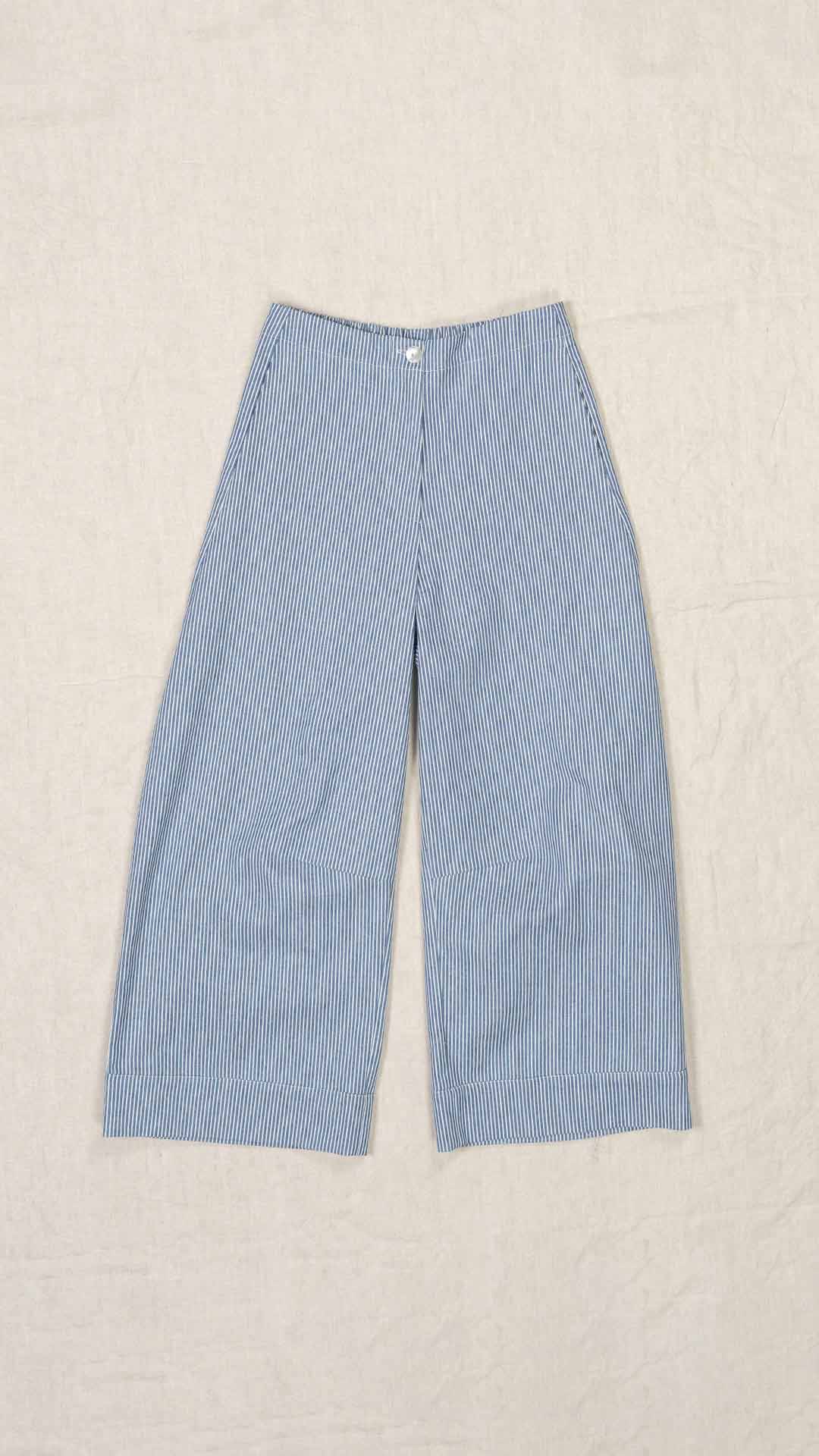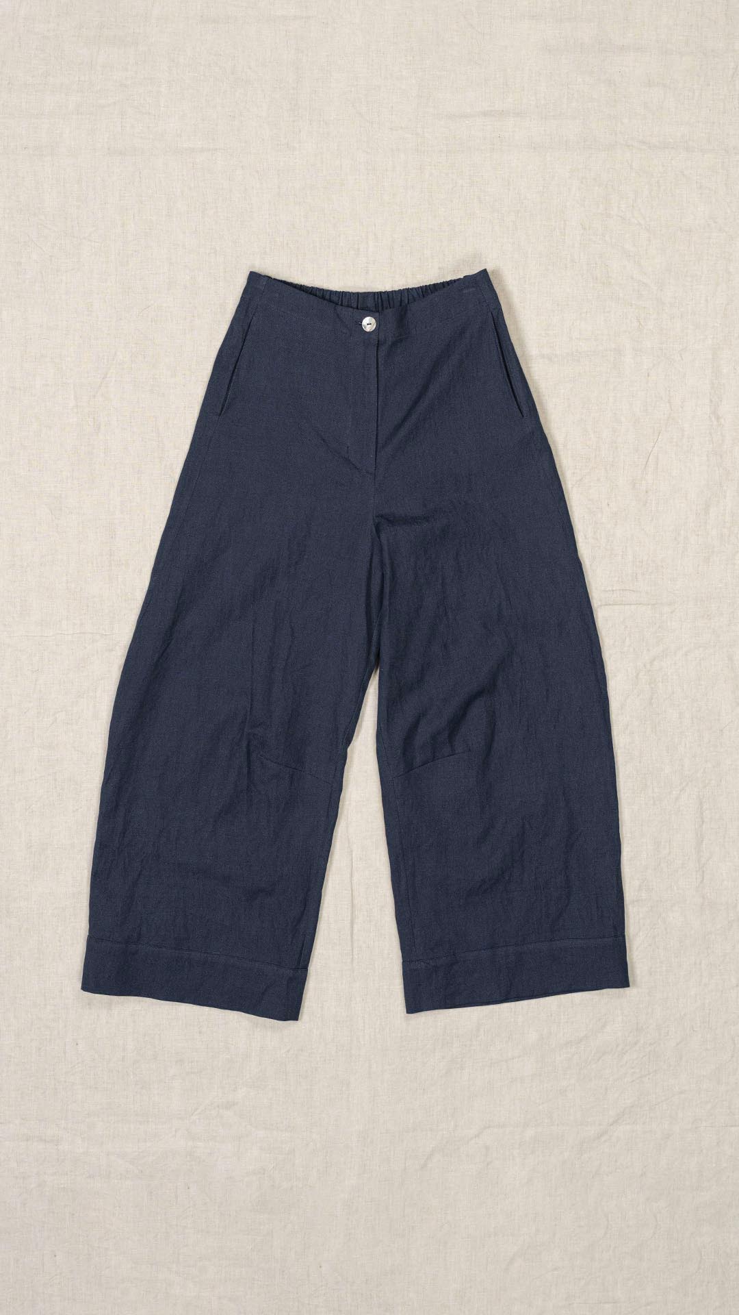 Pantalone con elastico dietro e abbottonatura davanti con bottone e cerniera. Tasche laterali, gamba ampia con finto risvolto sul fondo.