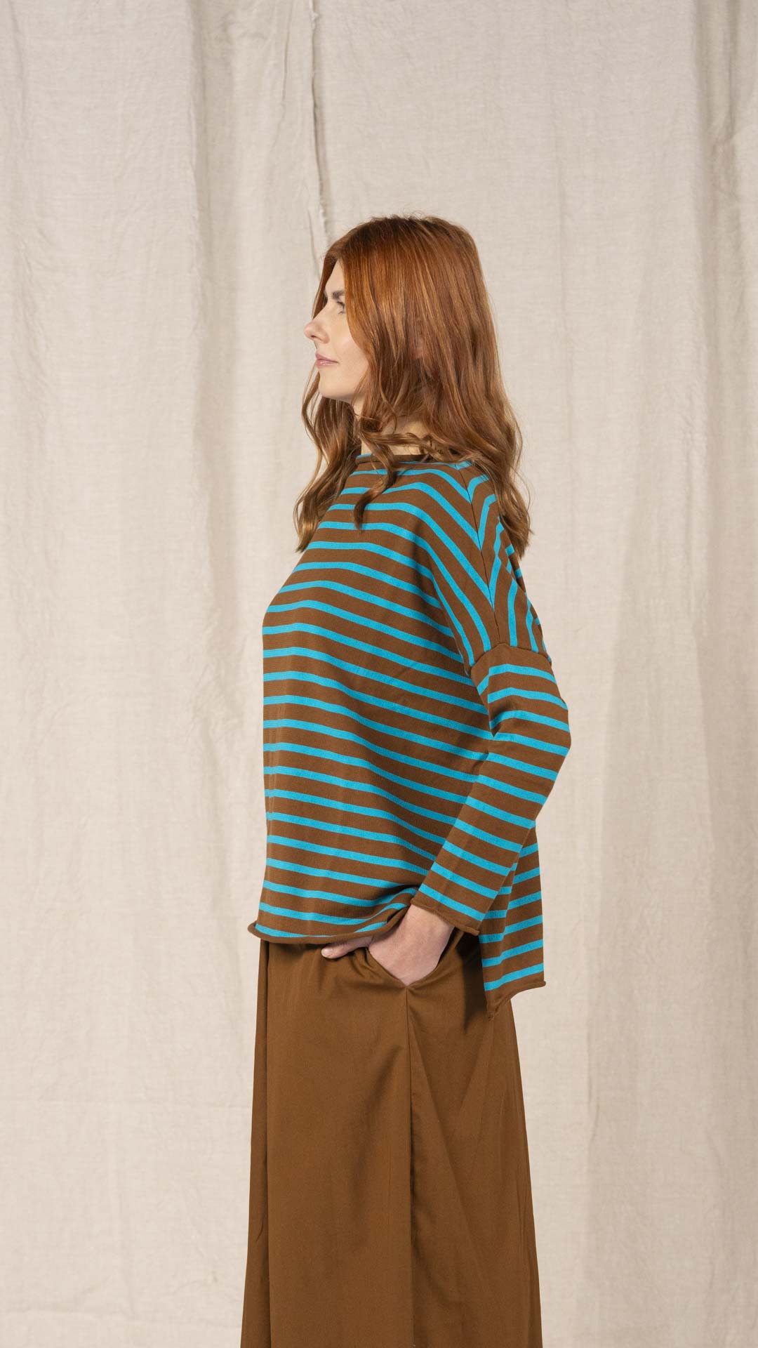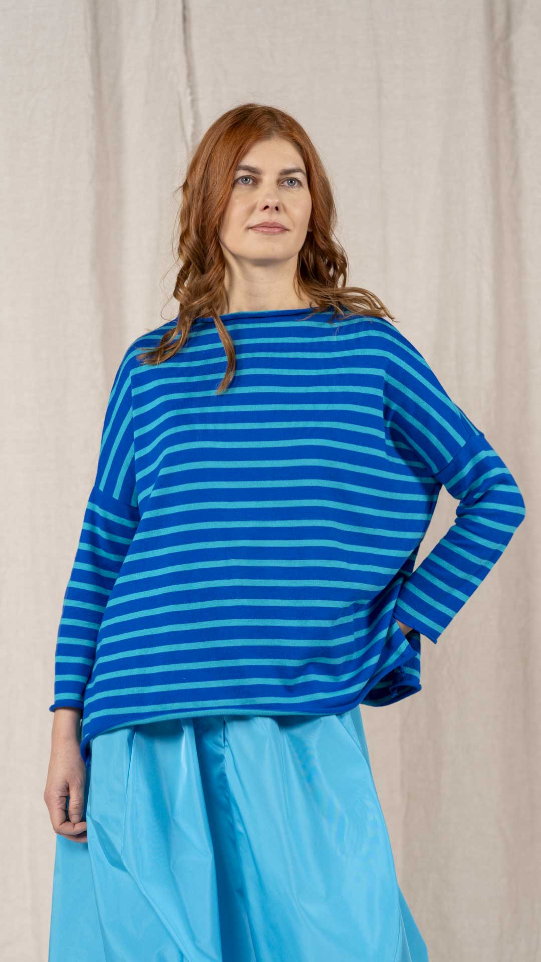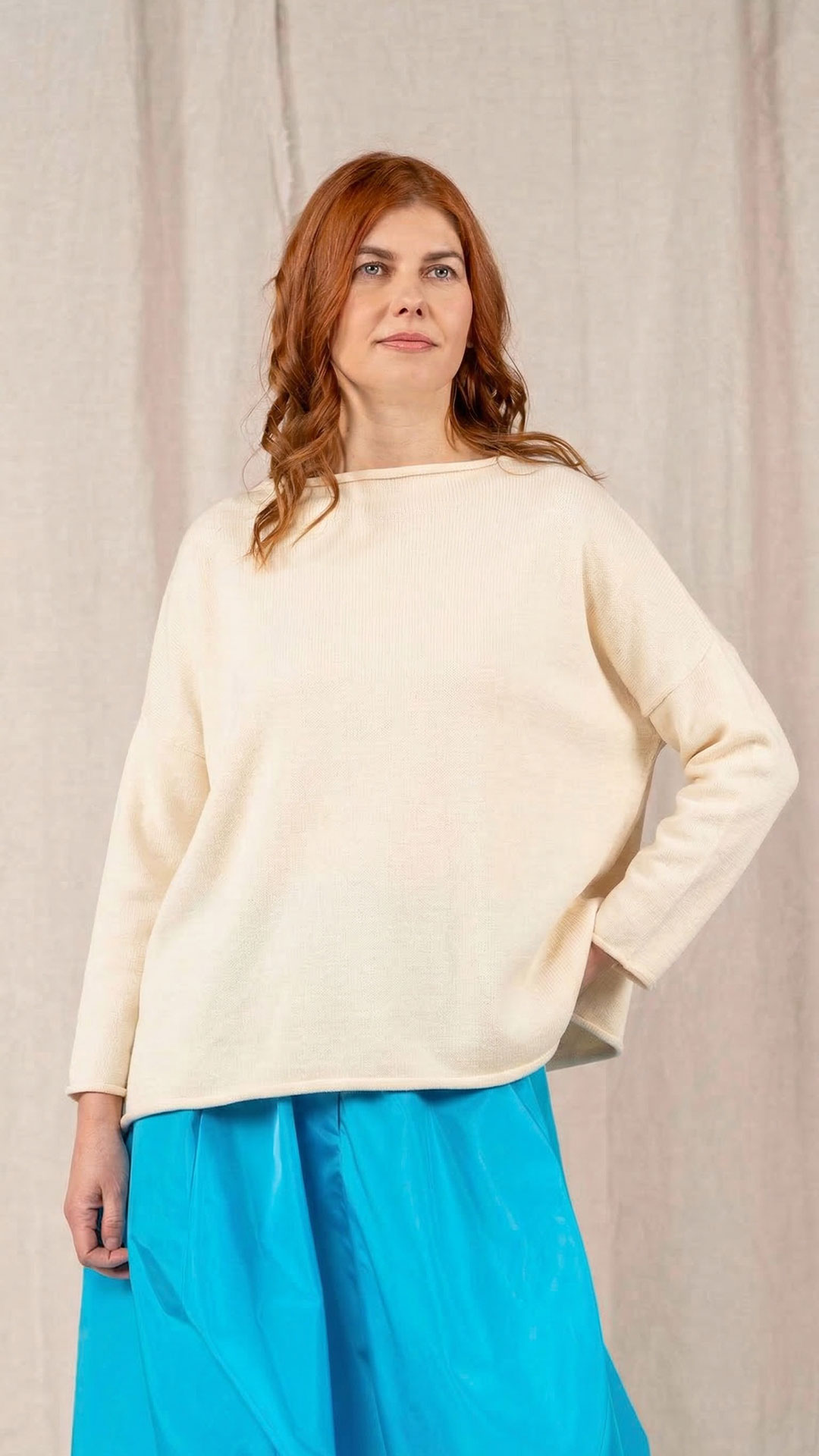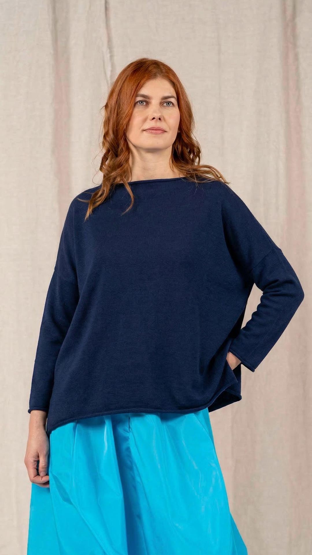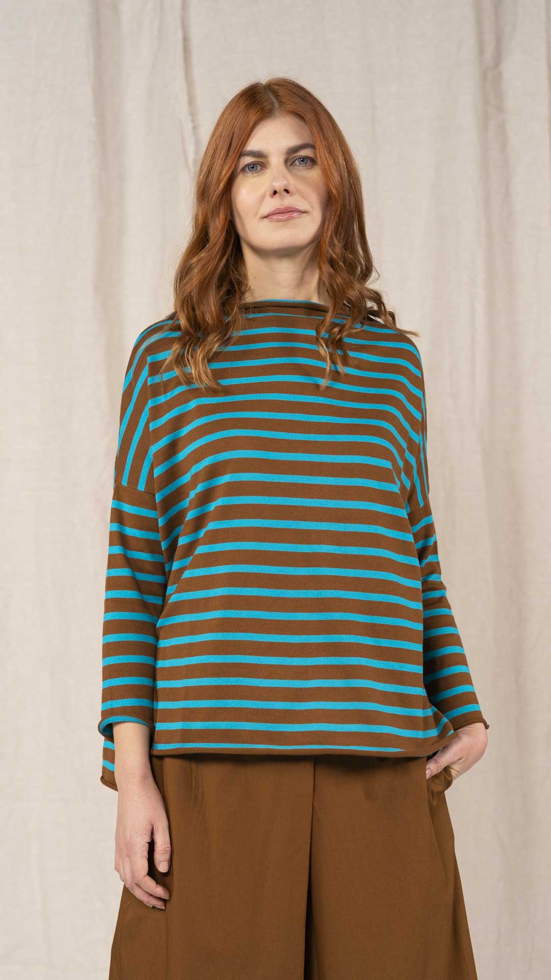 Maglia over con scollo a barca, spacchi laterali e manica scesa. Molto facile da abbinare grazie alla sua forma versatile. Perfetta anche con un jeans o un pantalone più stretto.
