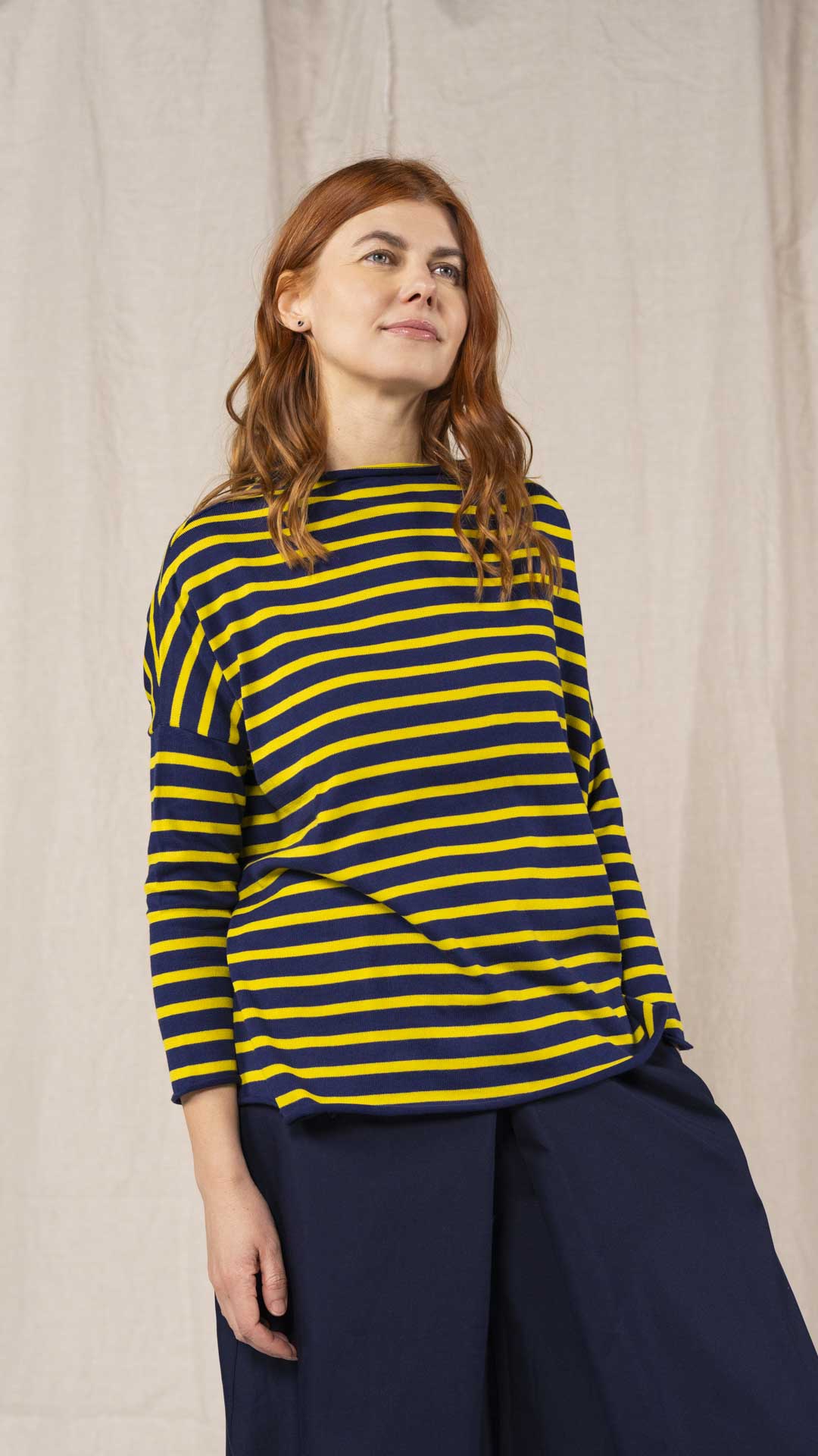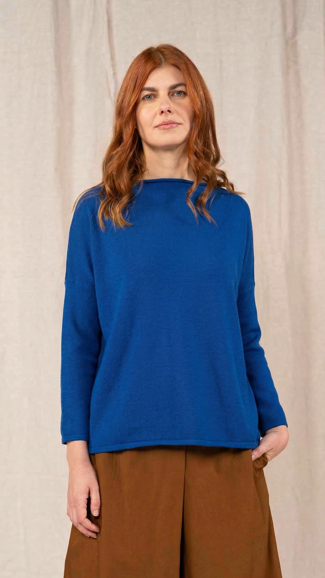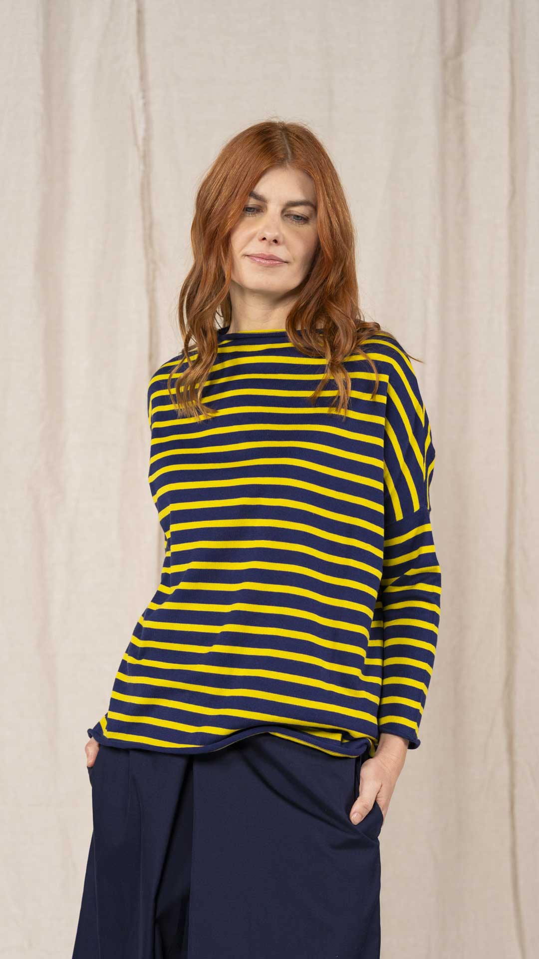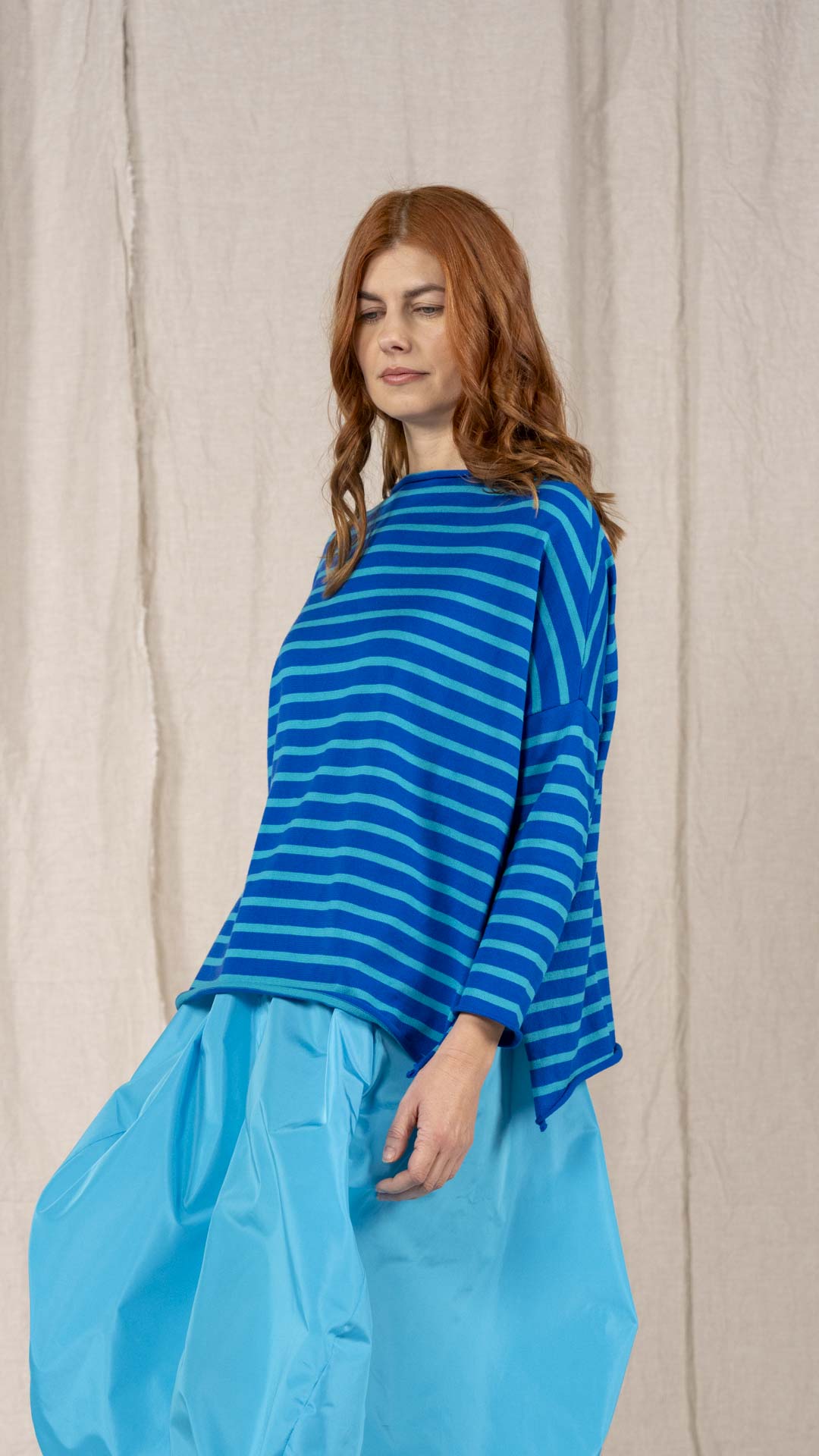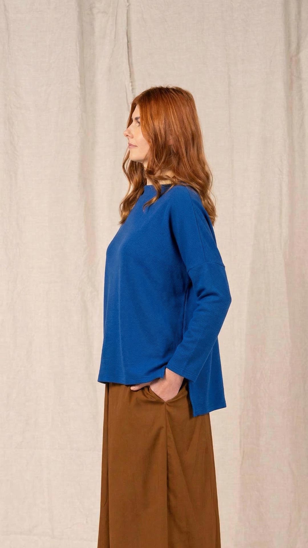 Maglia over con scollo a barca, spacchi laterali e manica scesa. Molto facile da abbinare grazie alla sua forma versatile. Perfetta anche con un jeans o un pantalone più stretto.