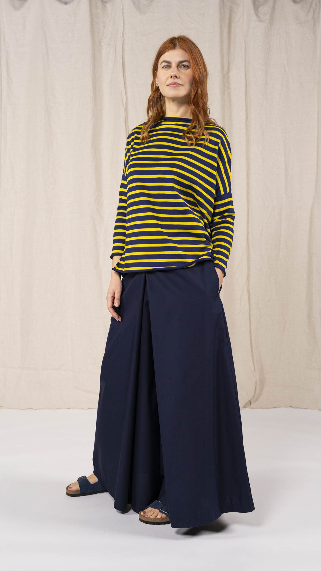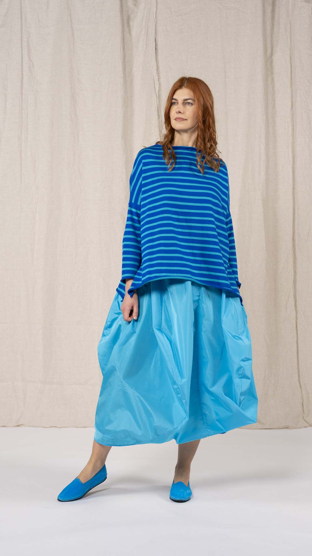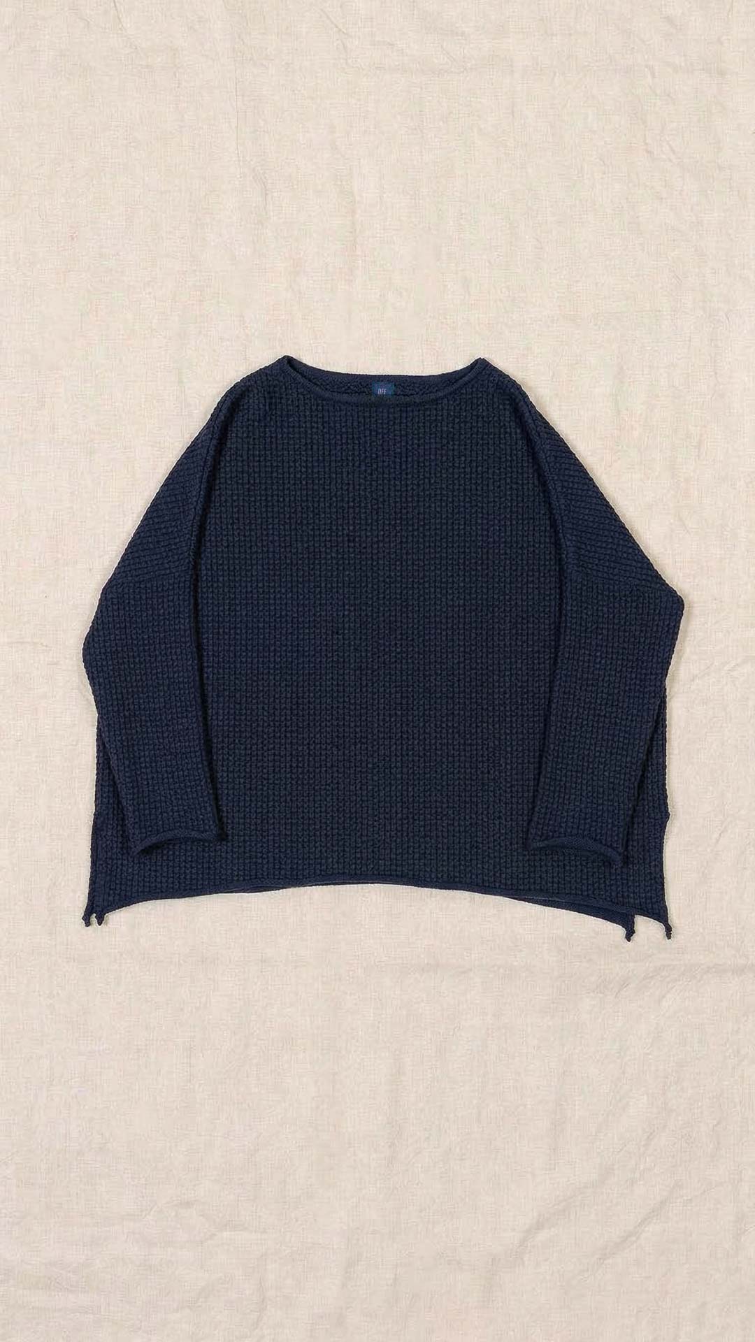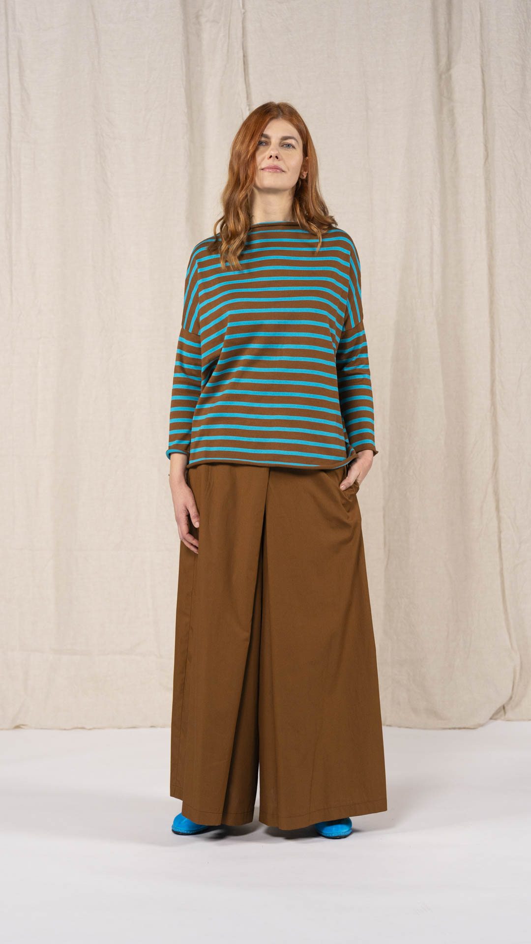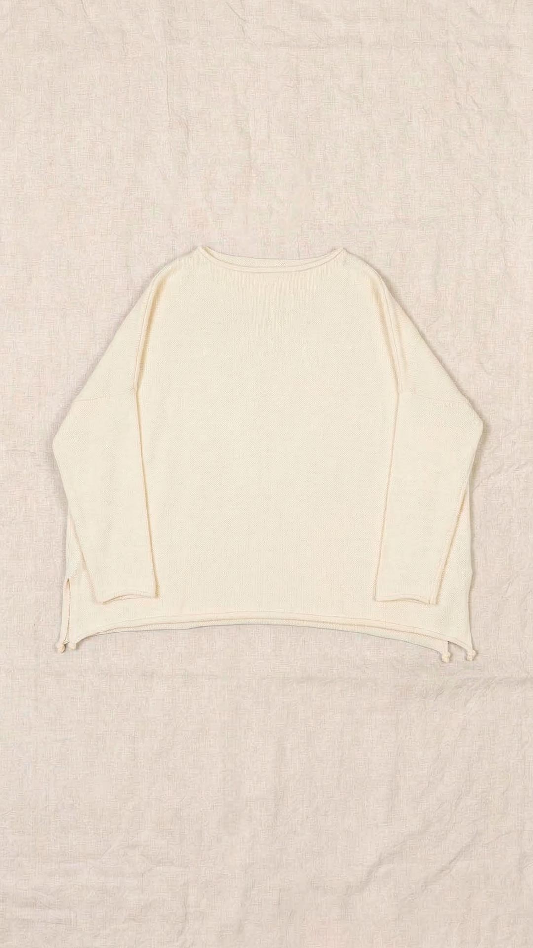 Maglia over con scollo a barca, spacchi laterali e manica scesa. Molto facile da abbinare grazie alla sua forma versatile. Perfetta anche con un jeans o un pantalone più stretto.