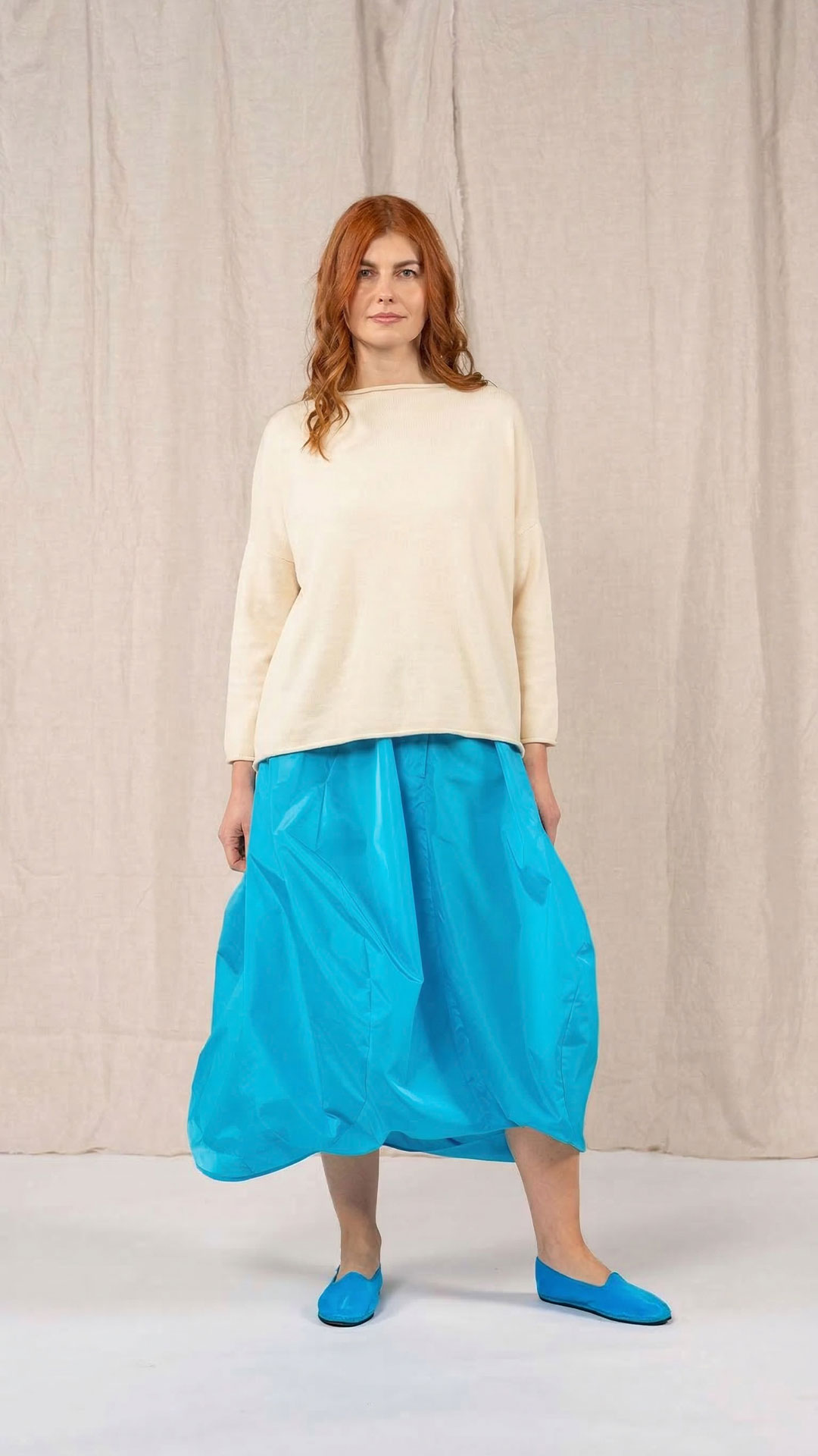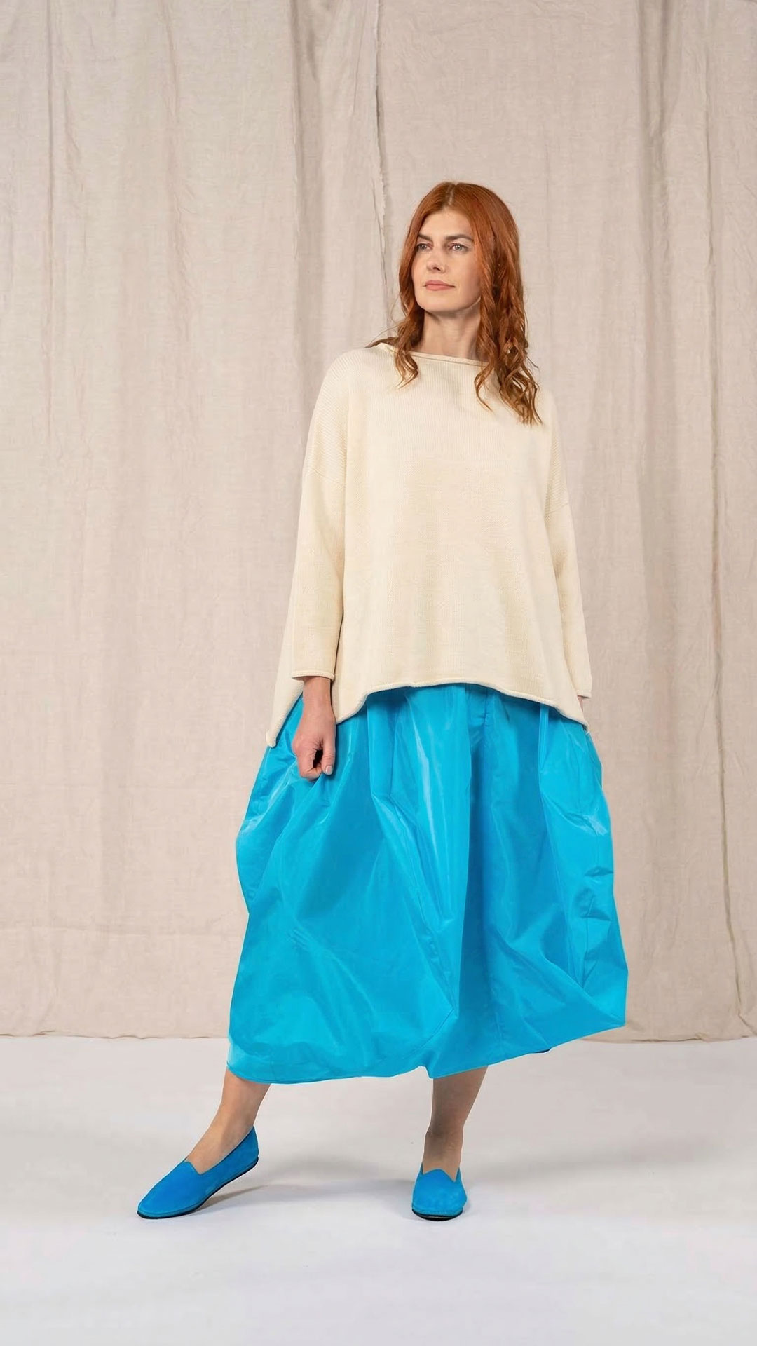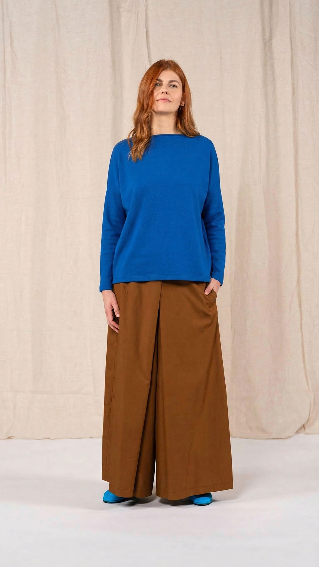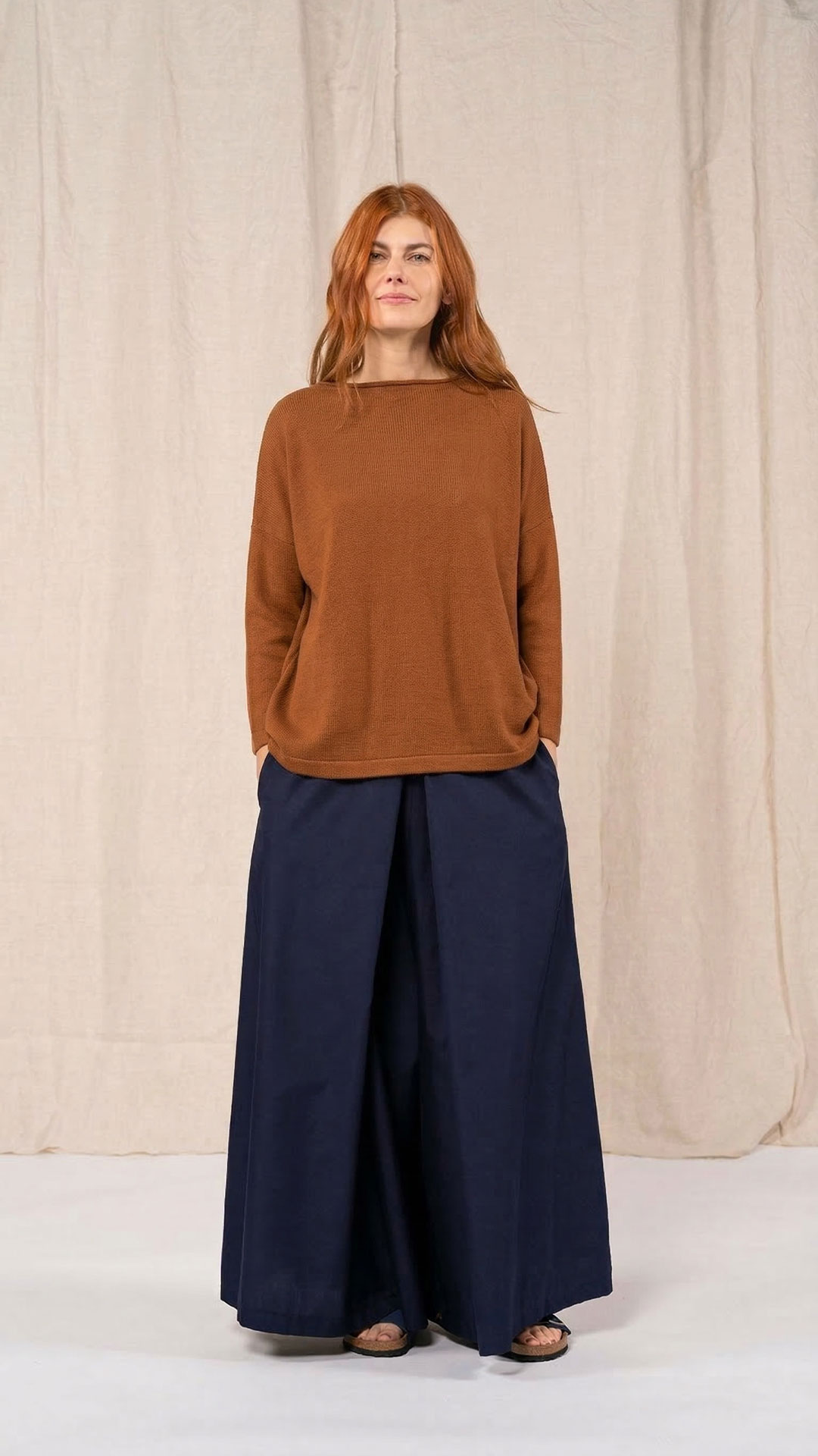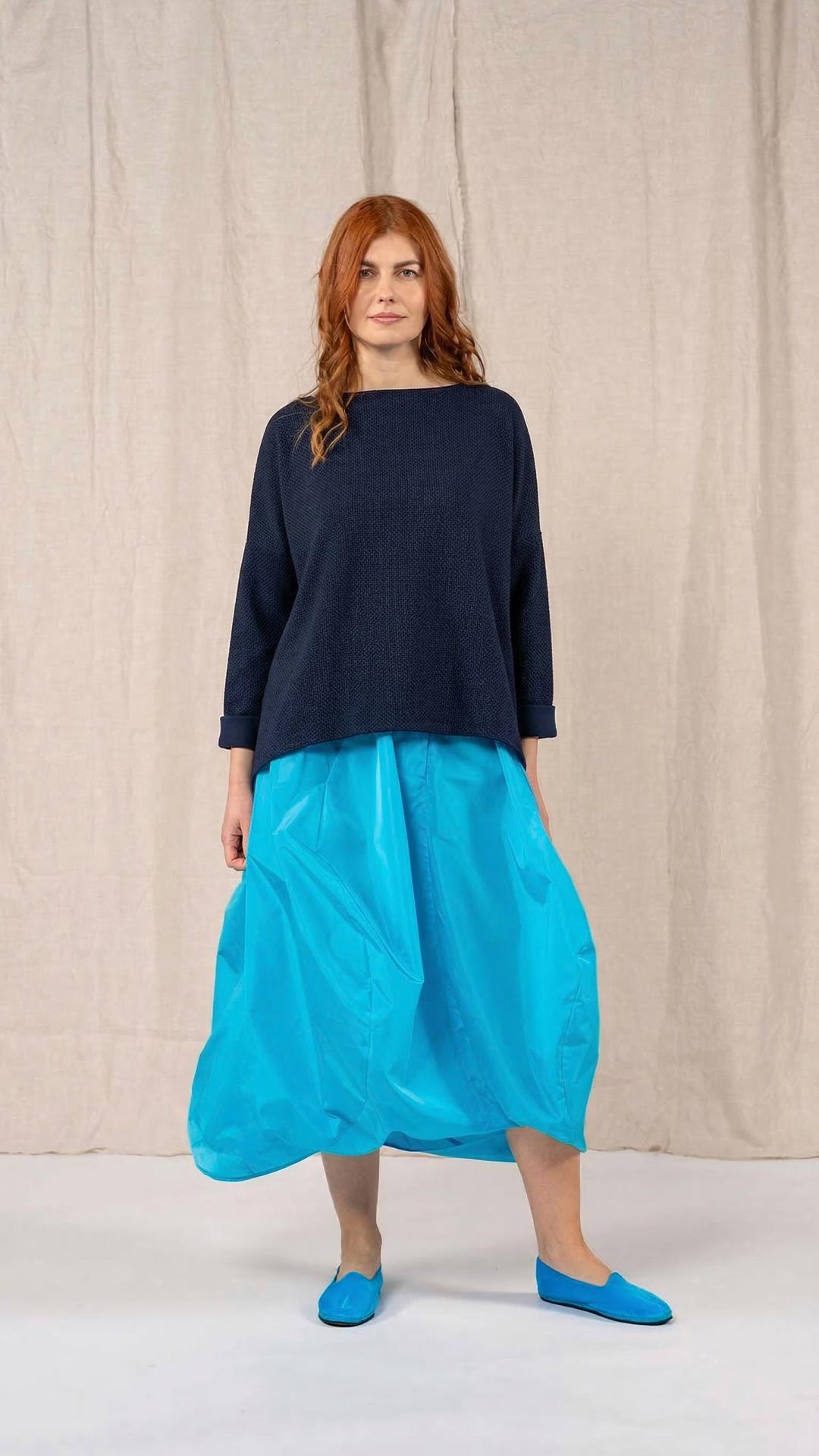 Maglia over con scollo a barca, spacchi laterali e manica scesa. Molto facile da abbinare grazie alla sua forma versatile. Perfetta anche con un jeans o un pantalone più stretto.