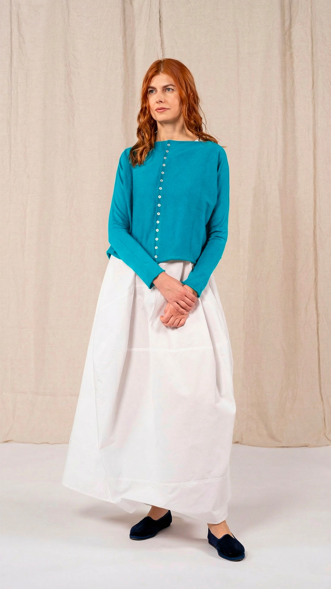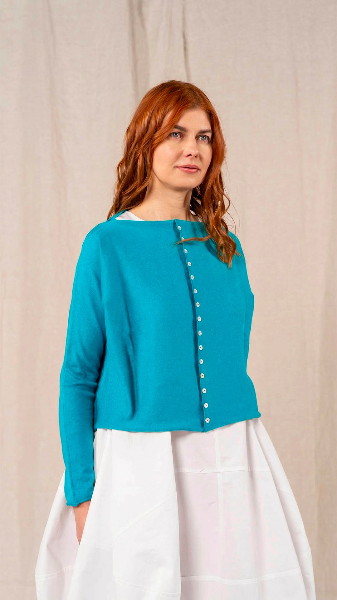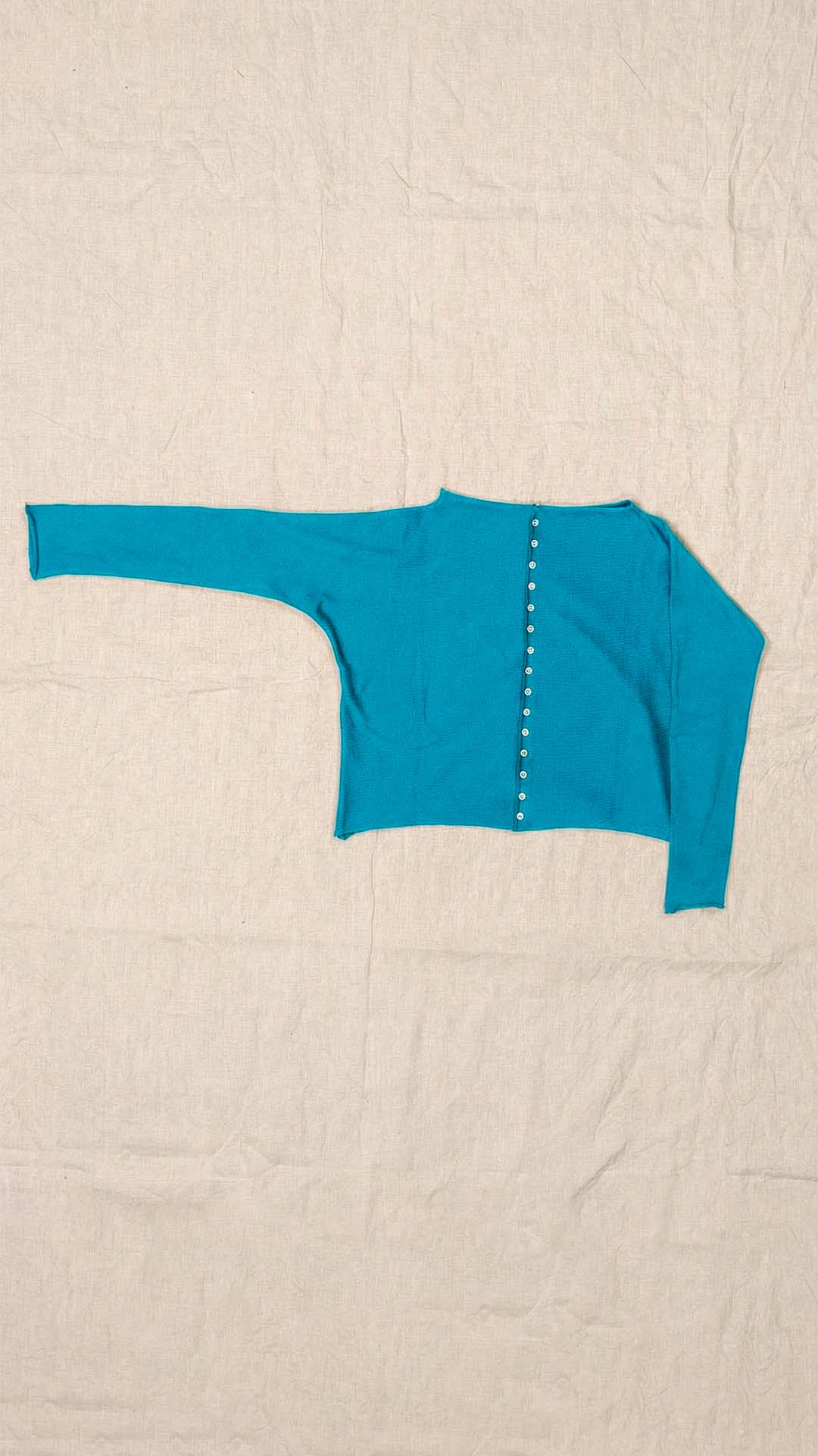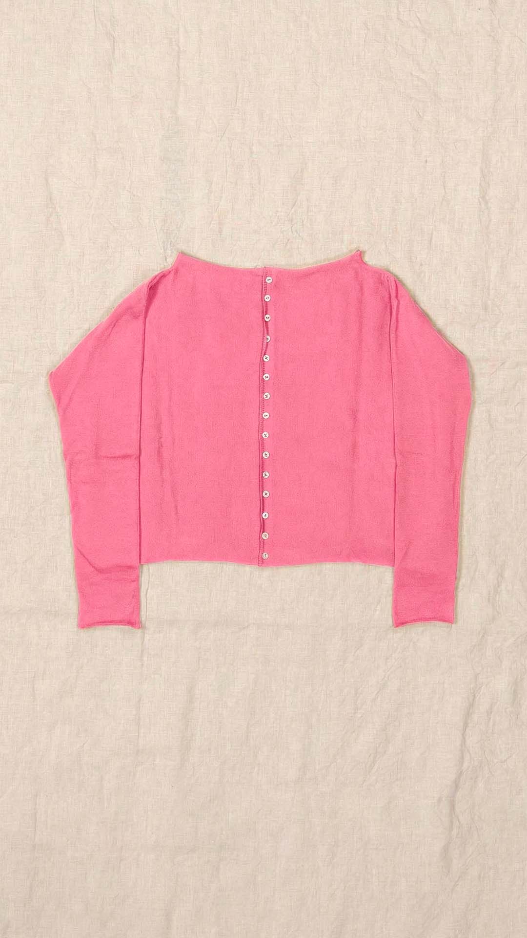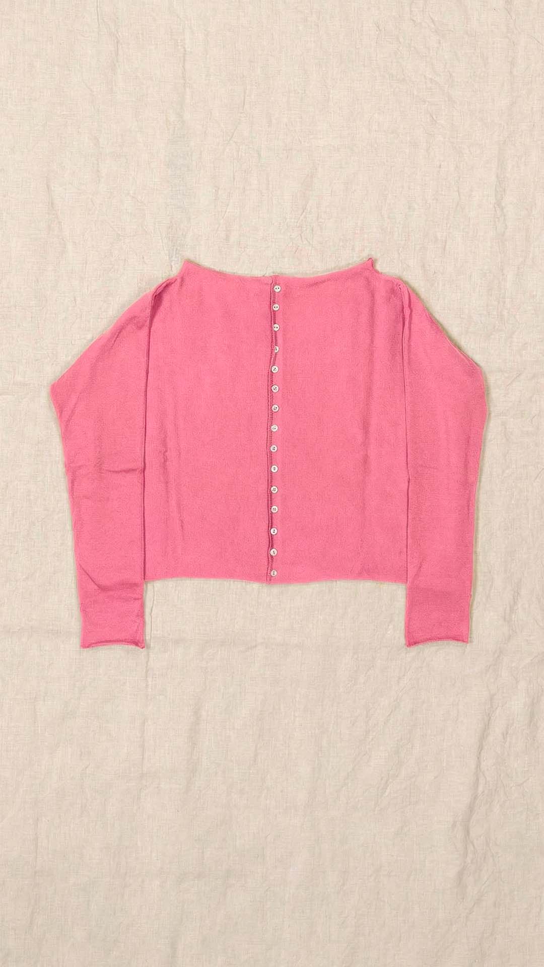 Maglia “Kimono” con scollo a barca e una fila di quindici bottoncini in madreperla. Il capo, lavorato a partire dalla manica, è reversibile e può essere indossato con l’abbottonatura sul davanti o sul retro. Un modello iconico della collezione Officinae.