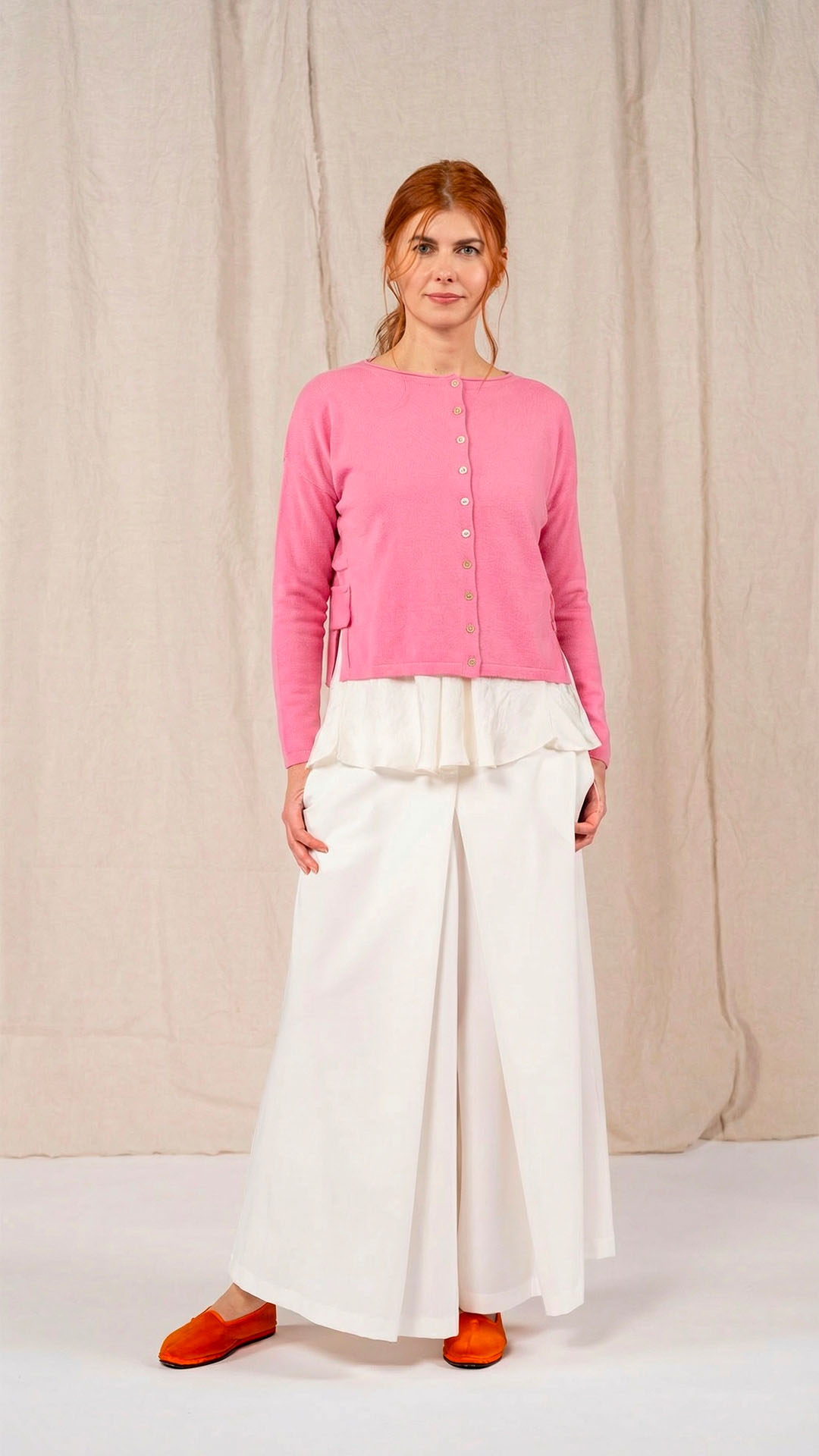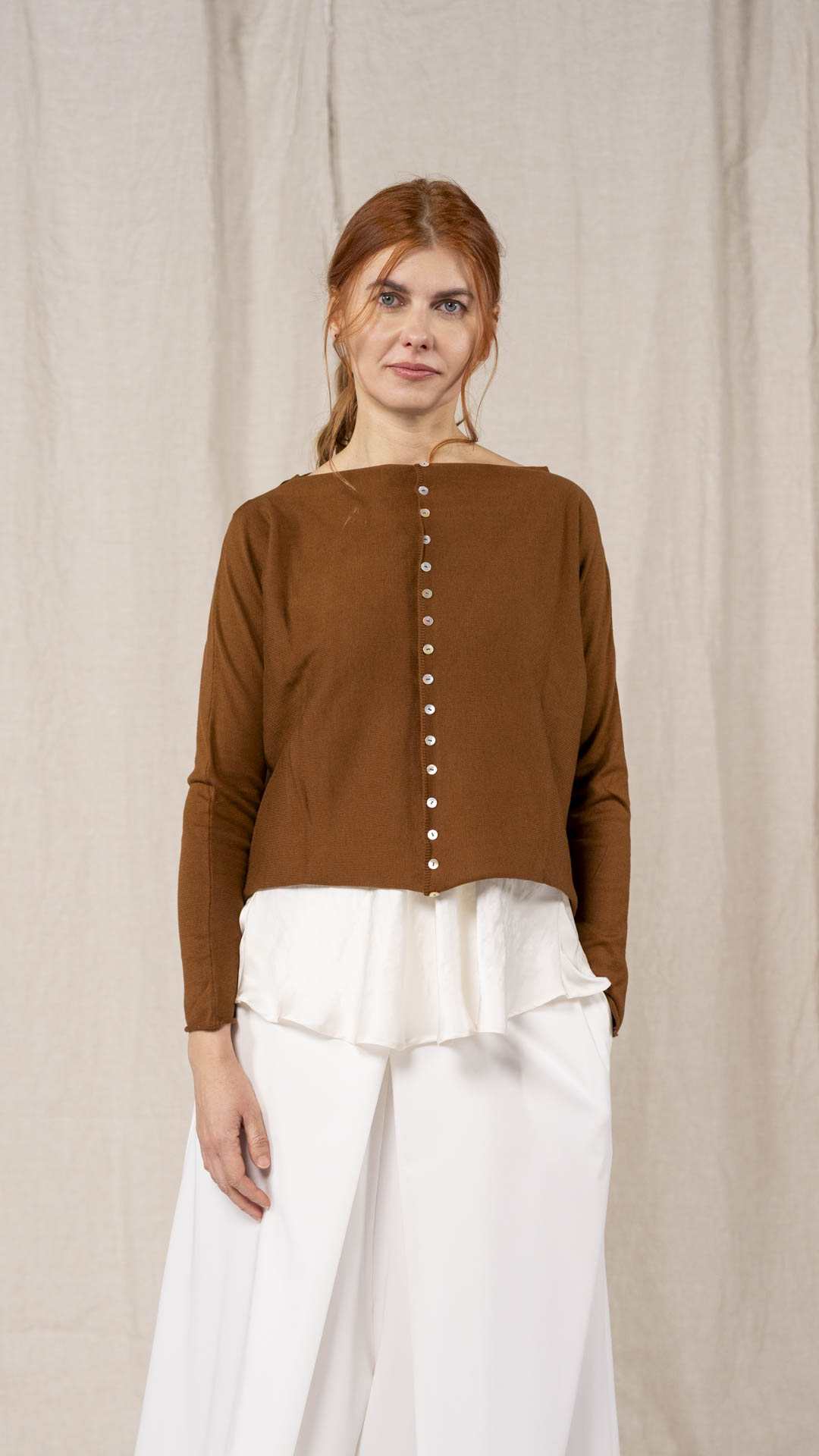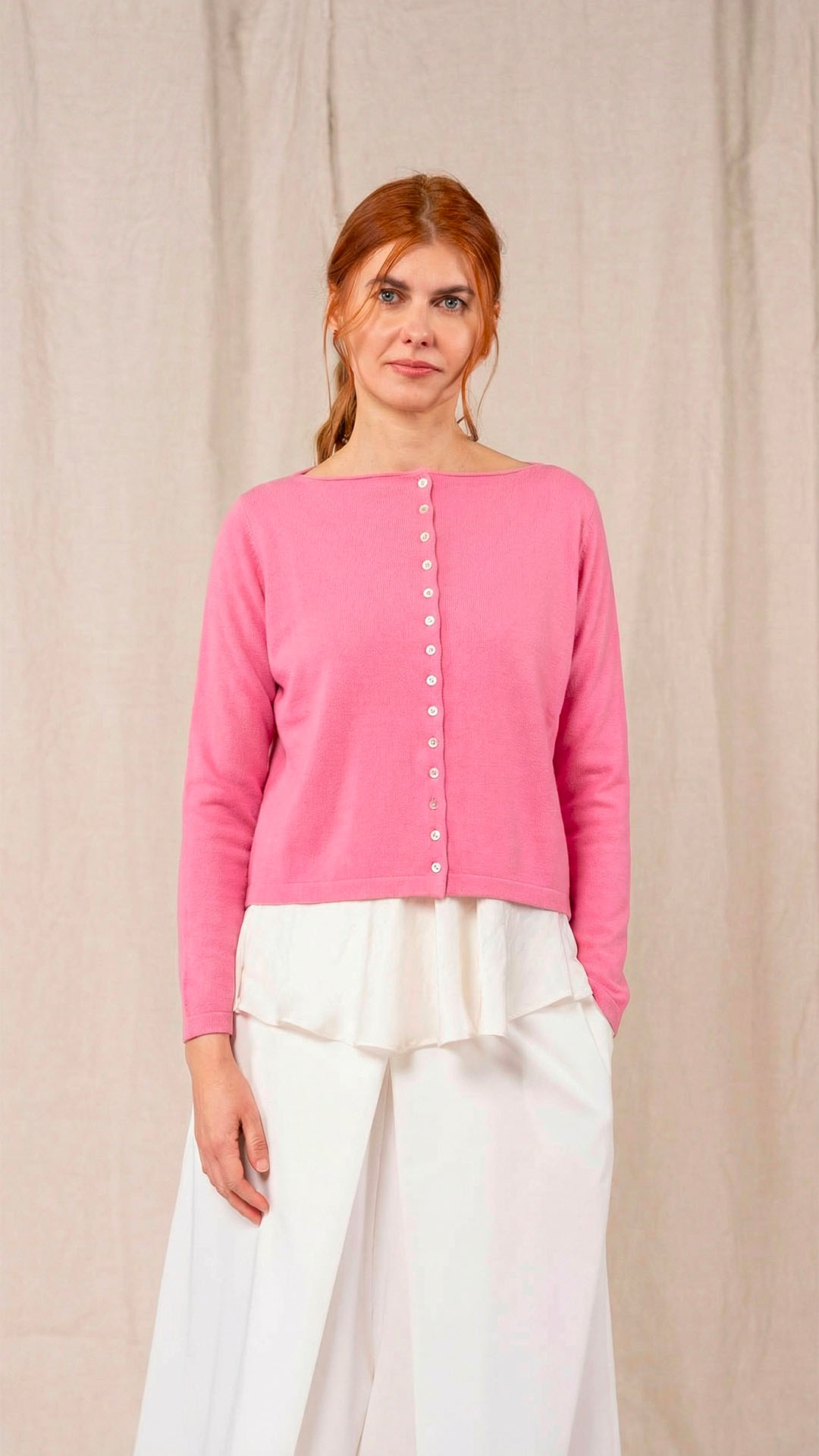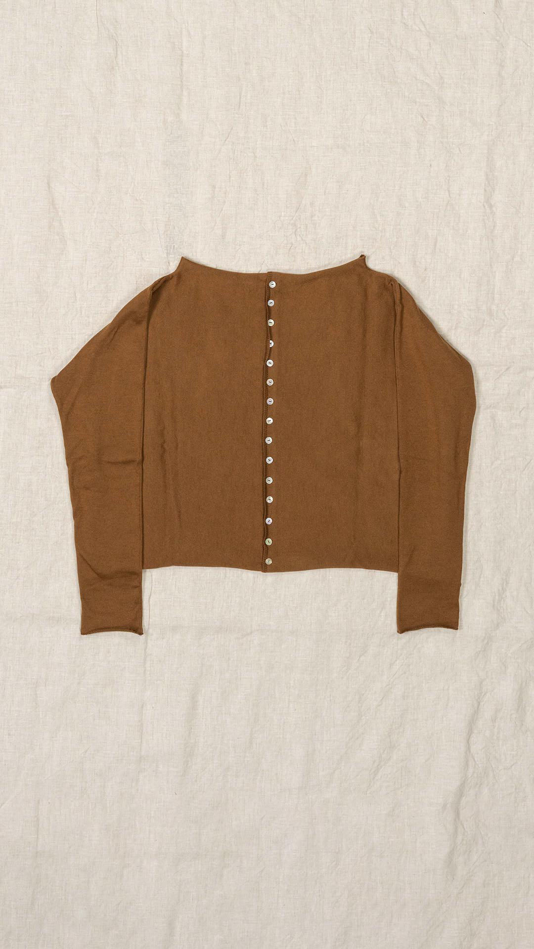 Maglia “Kimono” con scollo a barca e una fila di quindici bottoncini in madreperla. Il capo, lavorato a partire dalla manica, è reversibile e può essere indossato con l’abbottonatura sul davanti o sul retro. Un modello iconico della collezione Officinae.