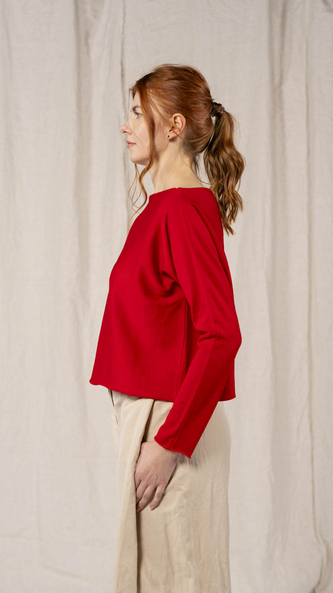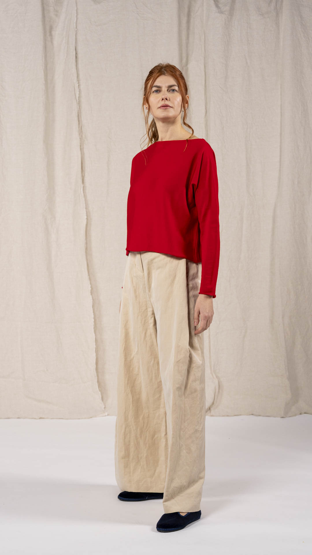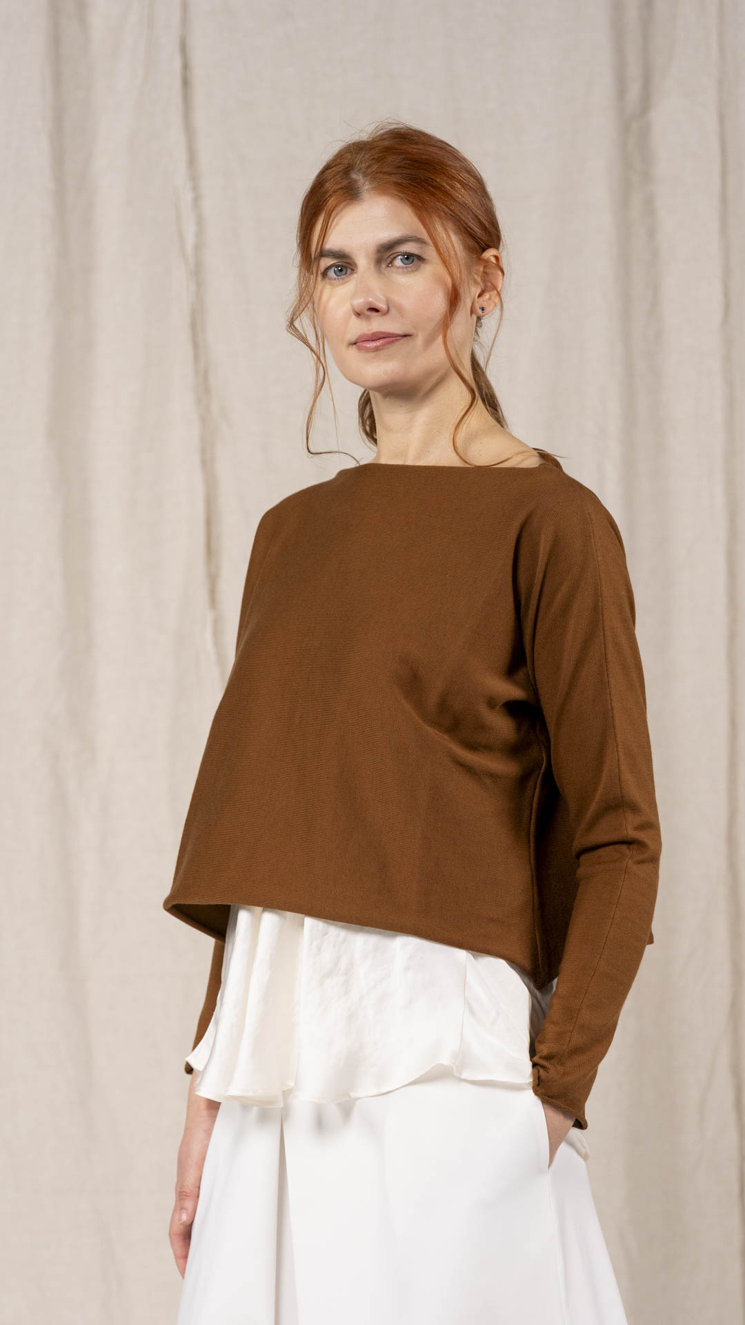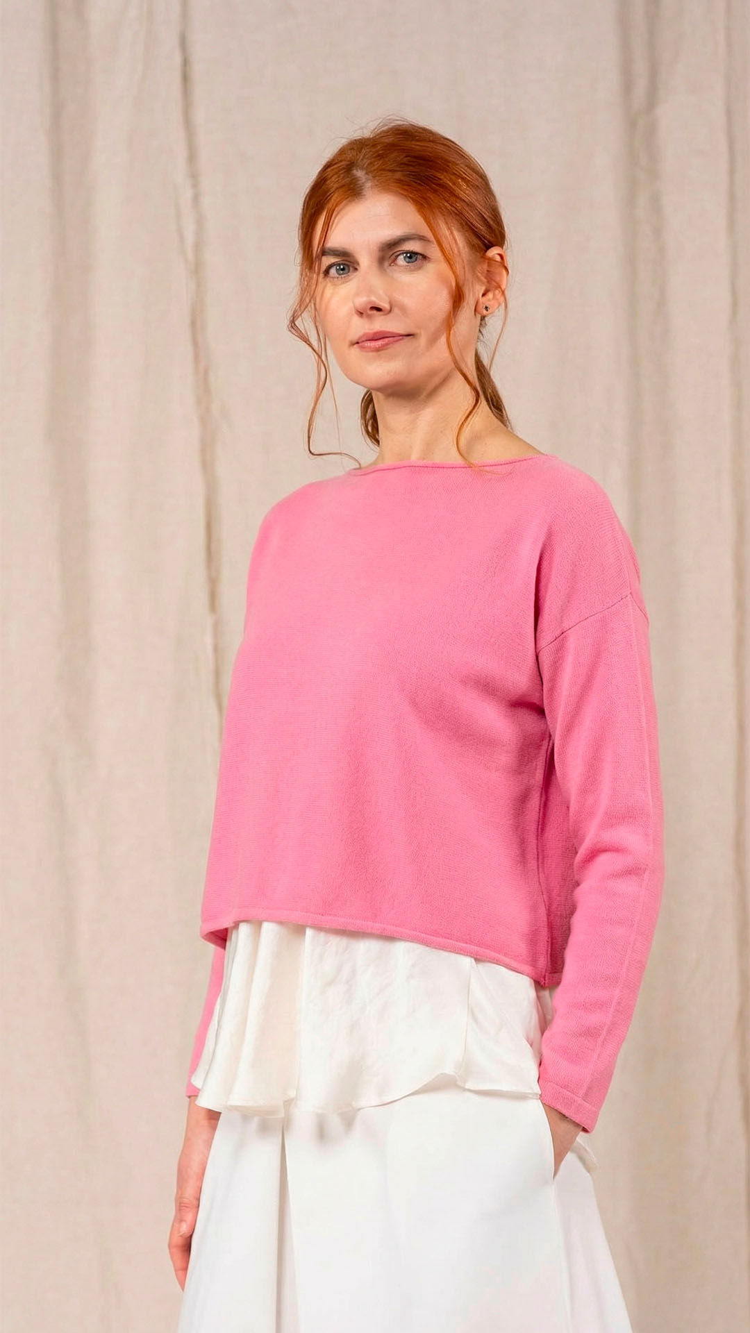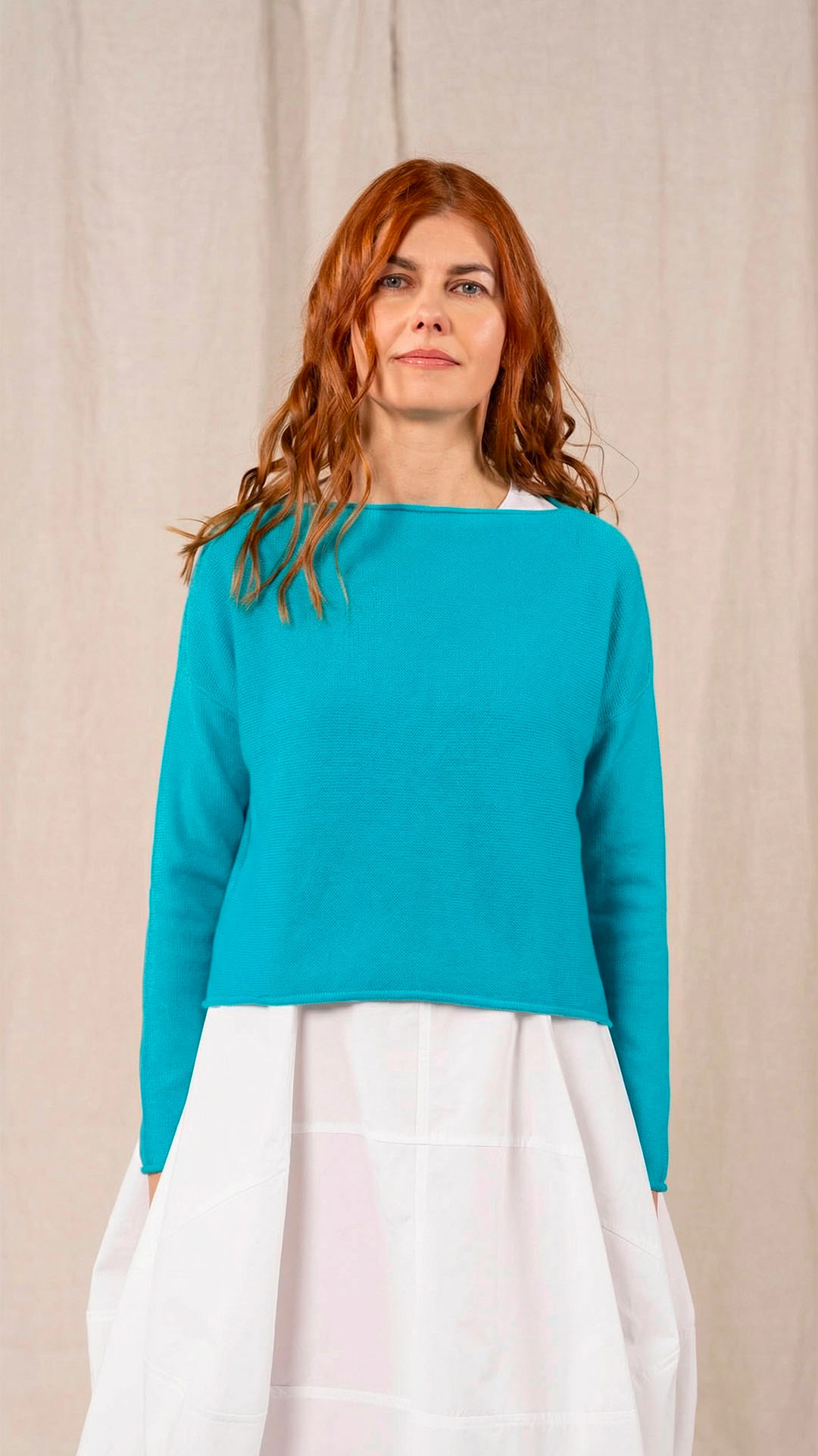 Maglia “Kimono” con scollo a barca e una fila di quindici bottoncini in madreperla. Il capo, lavorato a partire dalla manica, è reversibile e può essere indossato con l’abbottonatura sul davanti o sul retro. Un modello iconico della collezione Officinae.