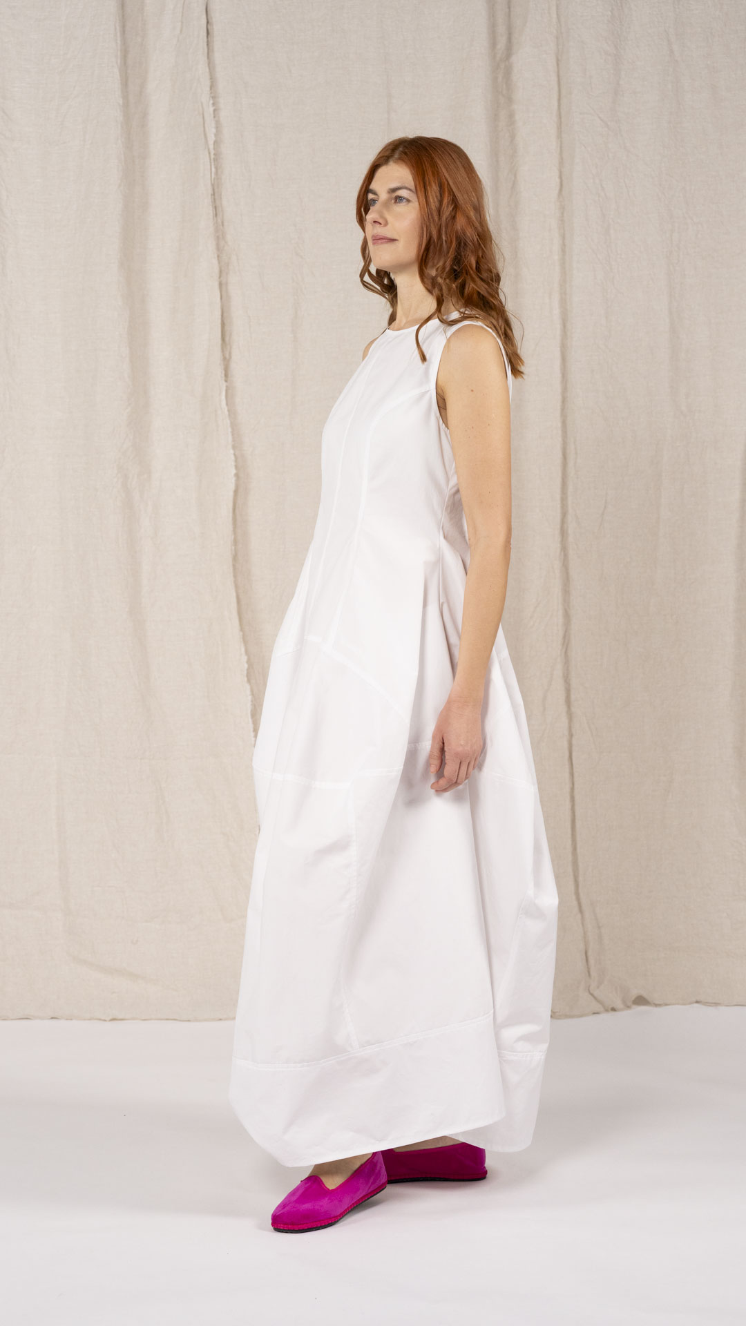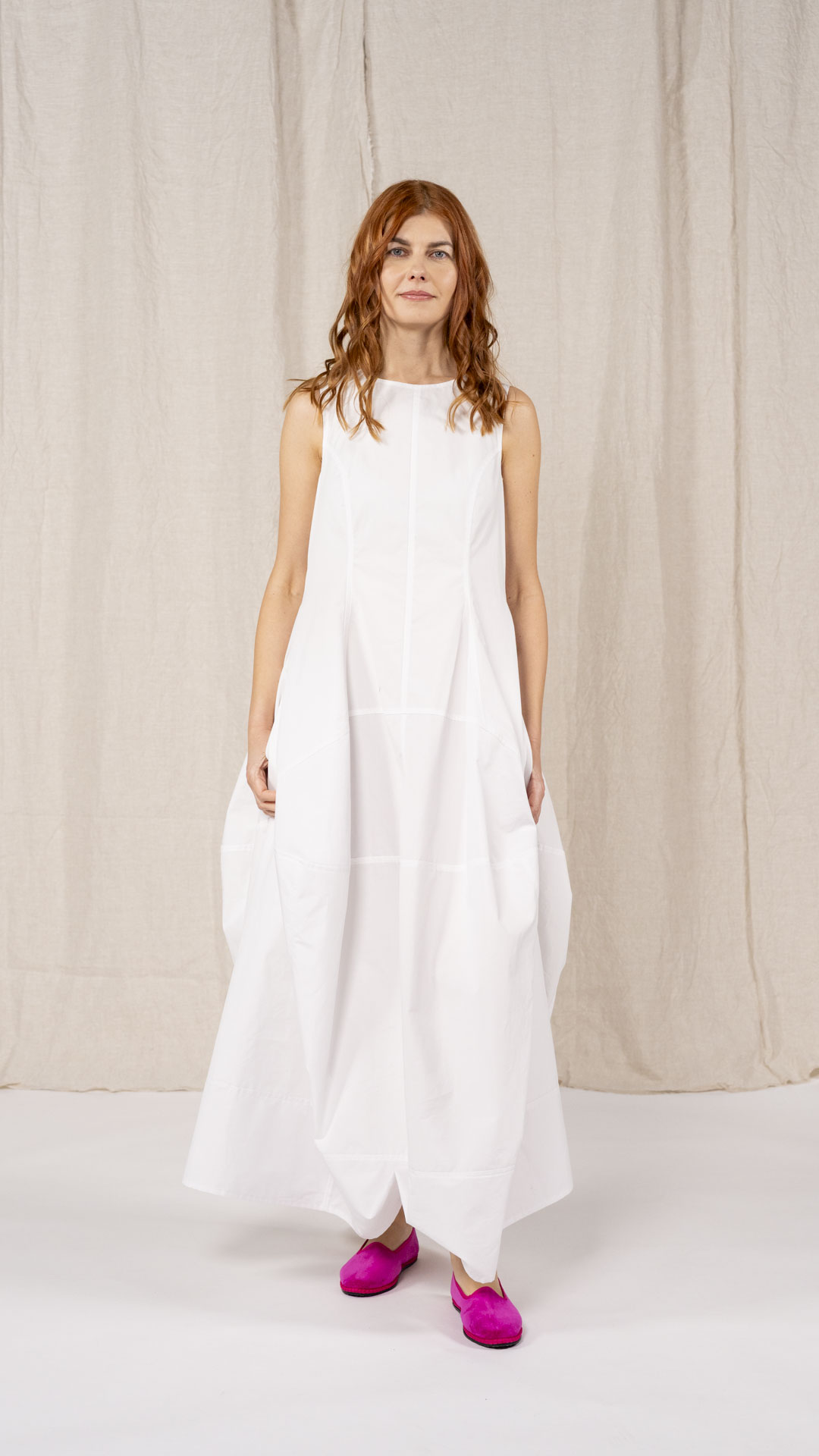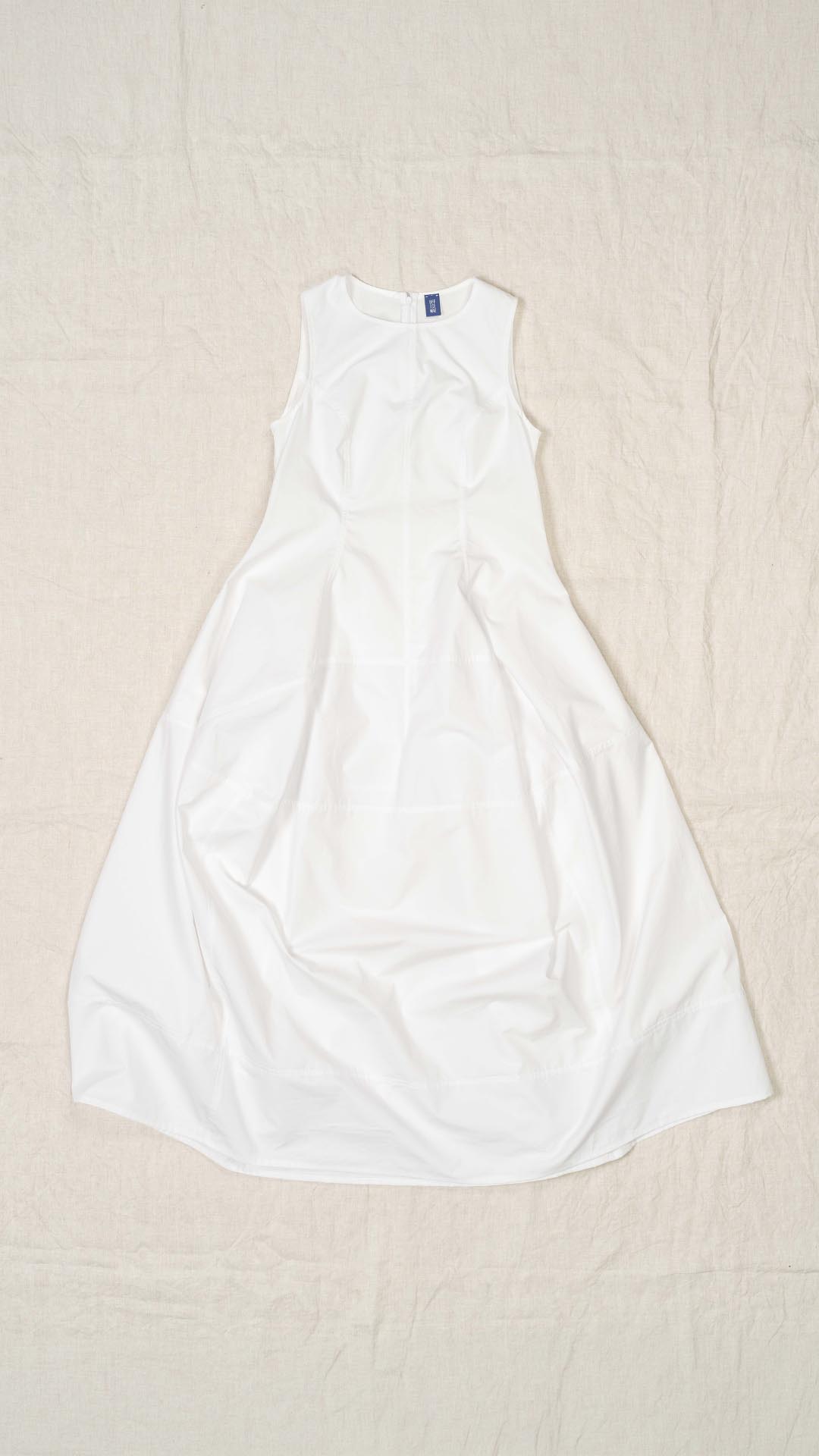 Abito con corpino aderente e tagli sia orizzontali che verticali che disegnano una forma ad anfora. Tasche laterali e cerniera sul retro. Da sovrapporre anche alla maglia Aurora o a capi dal carattere informale.