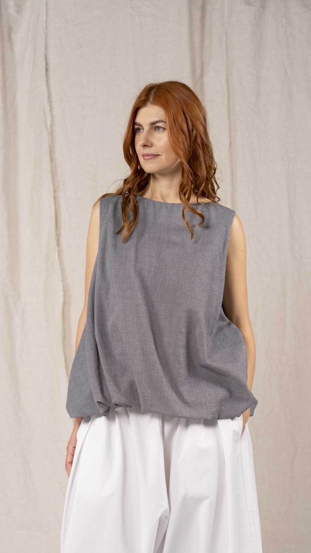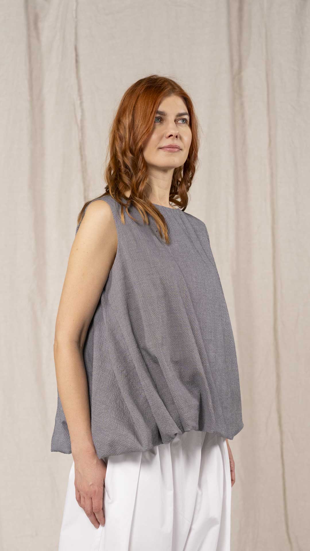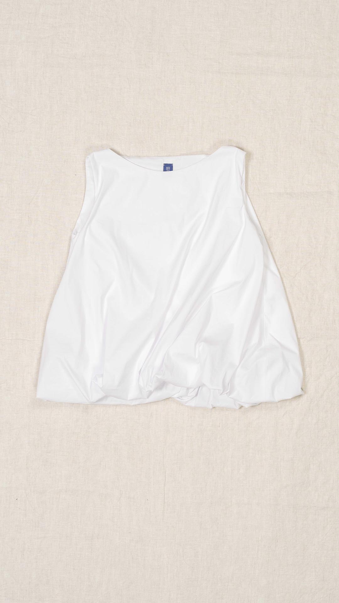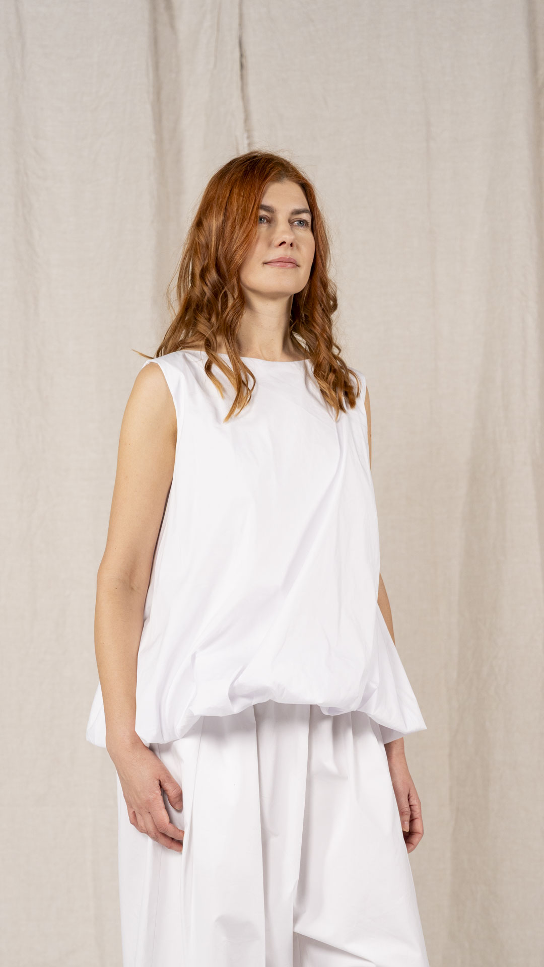 Top con scollo a barca e linea svasata, realizzato con una lavorazione doppiata, arricciata e ruotata all’interno che crea un effetto a spirale. Un capo dalla forte presenza stilistica e dalla vestibilità contemporanea.