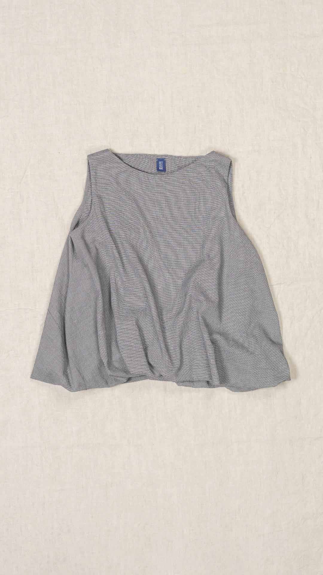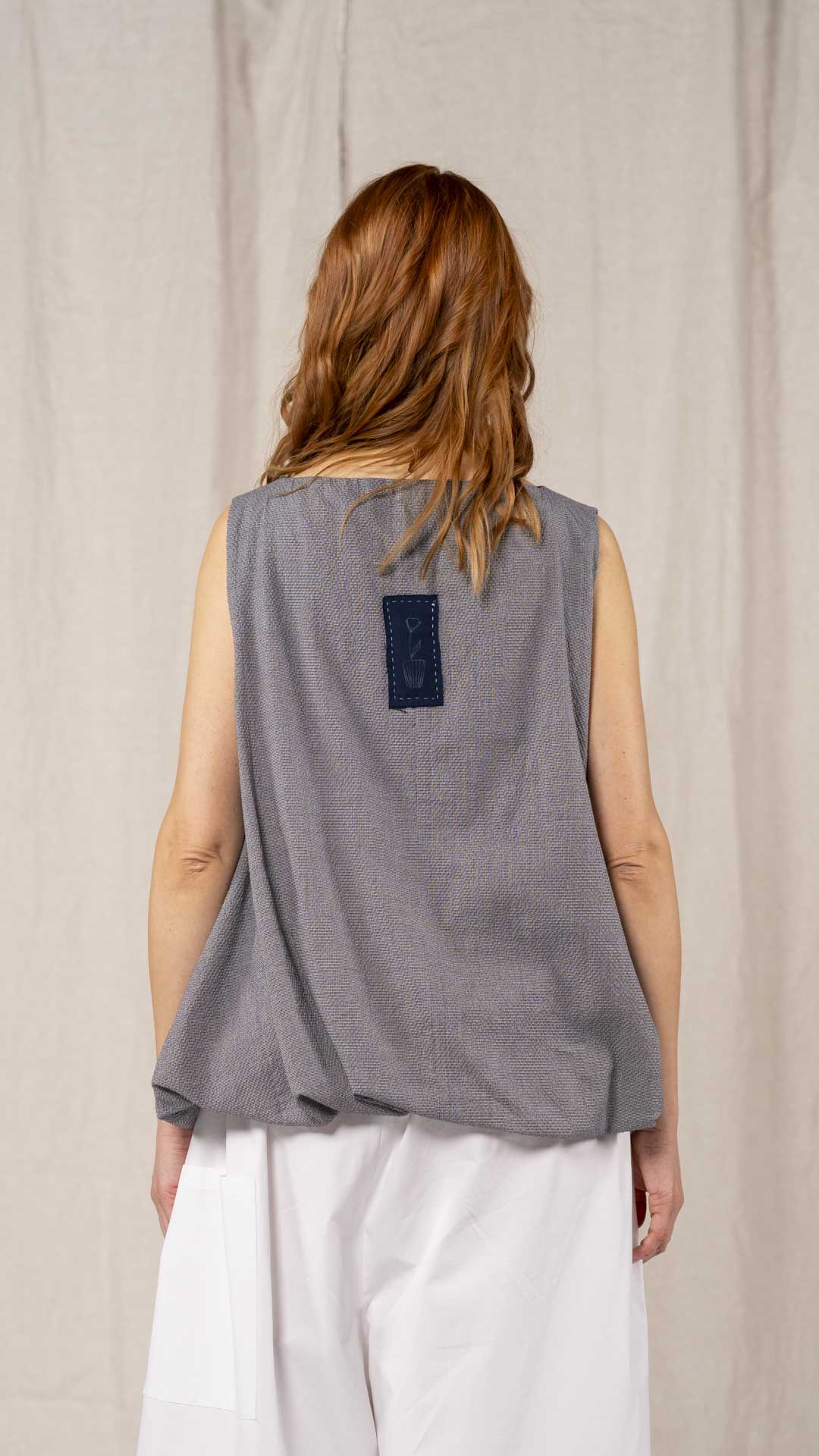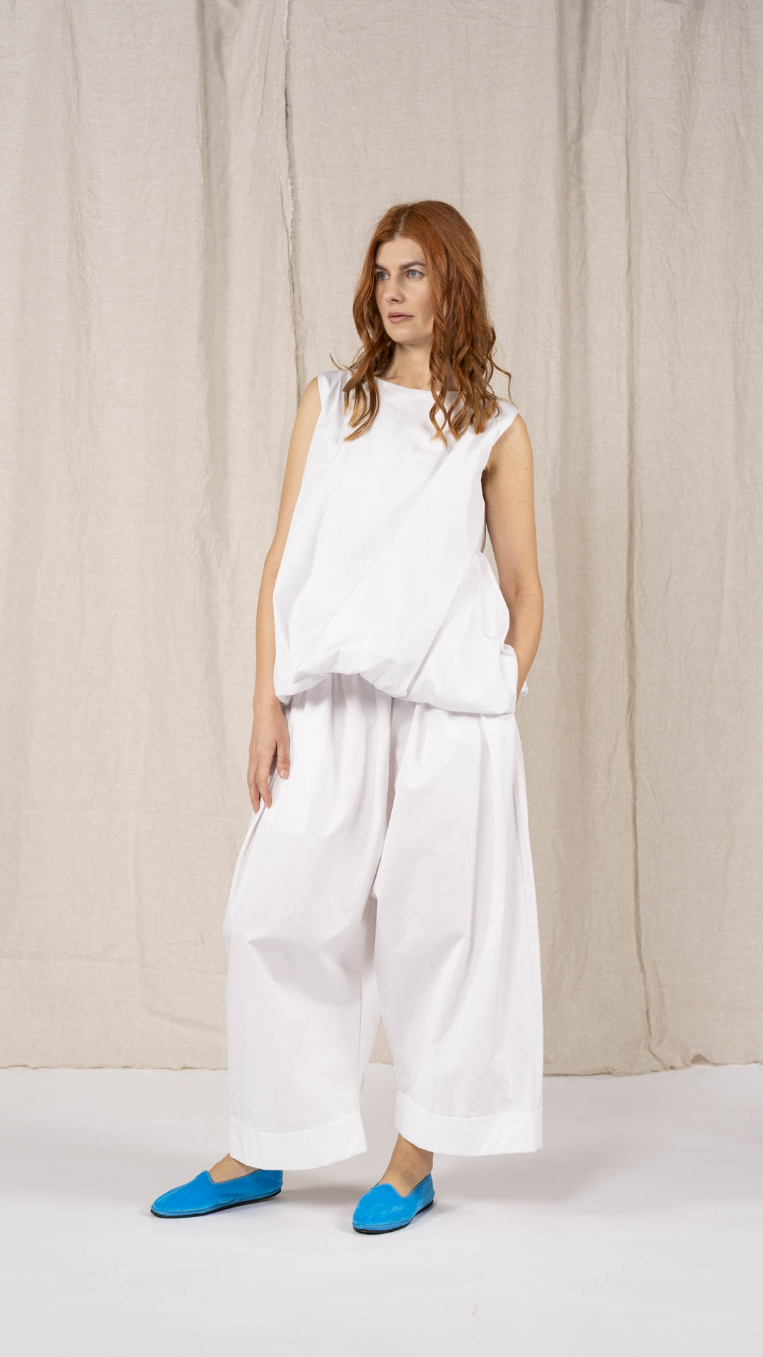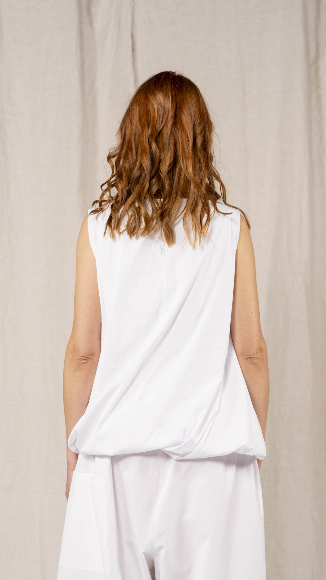 Top con scollo a barca e linea svasata, realizzato con una lavorazione doppiata, arricciata e ruotata all’interno che crea un effetto a spirale. Un capo dalla forte presenza stilistica e dalla vestibilità contemporanea.