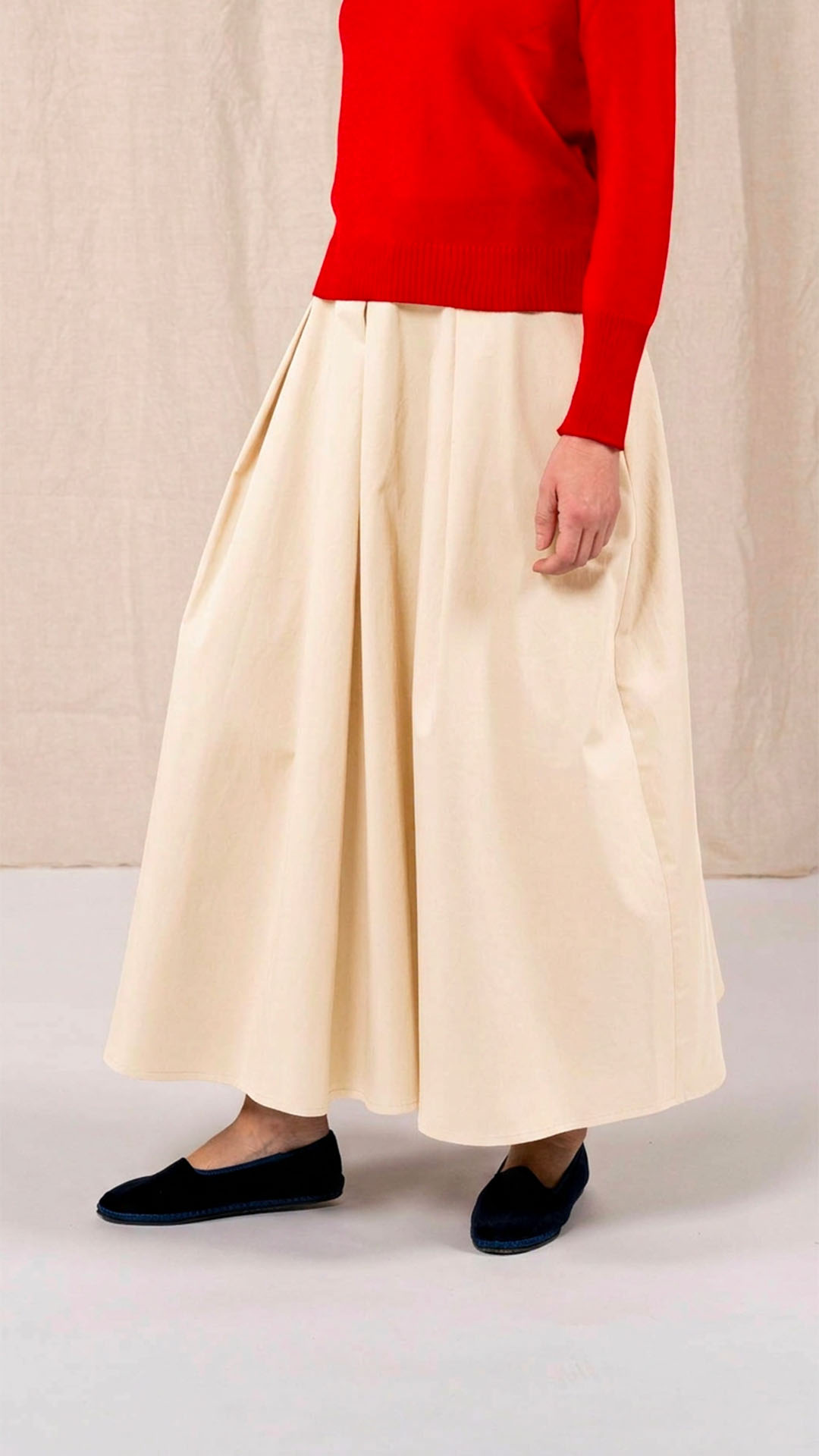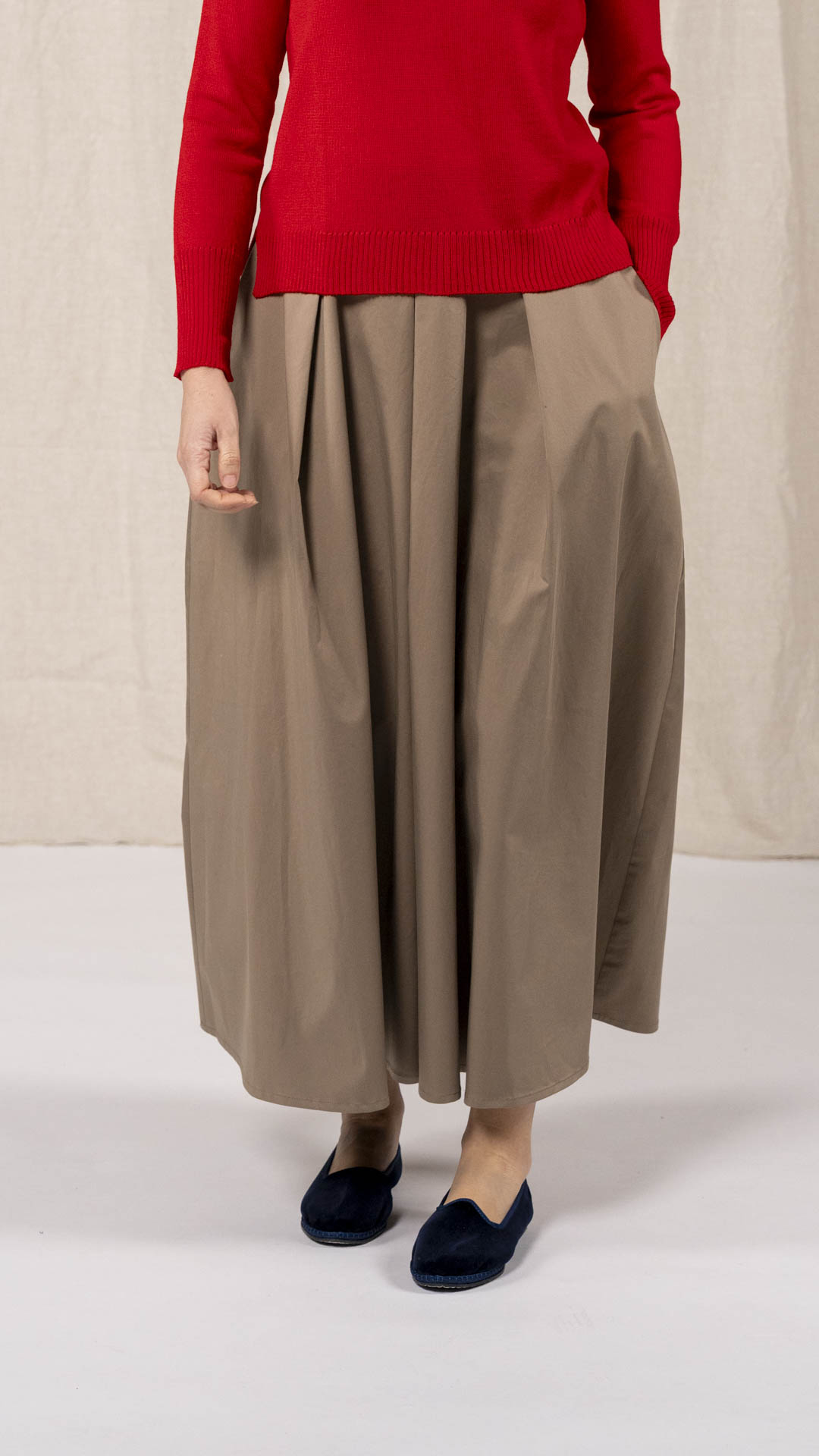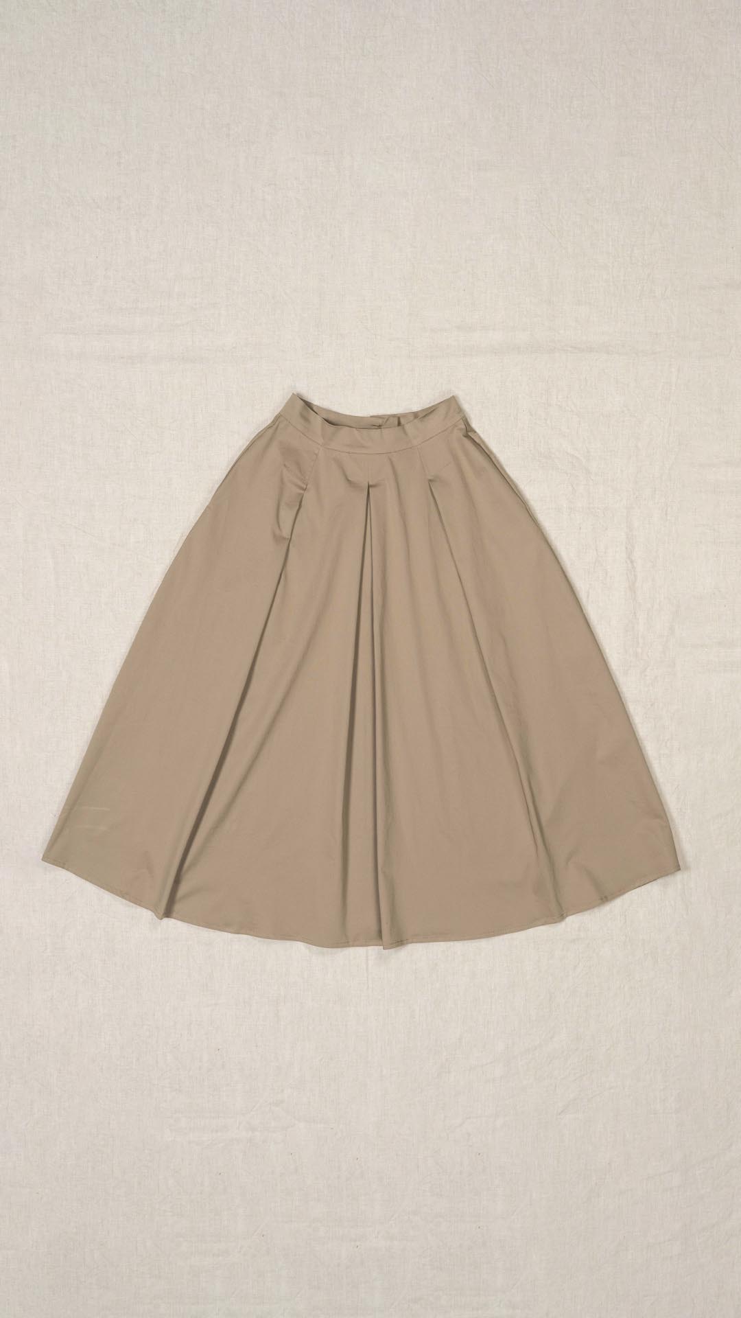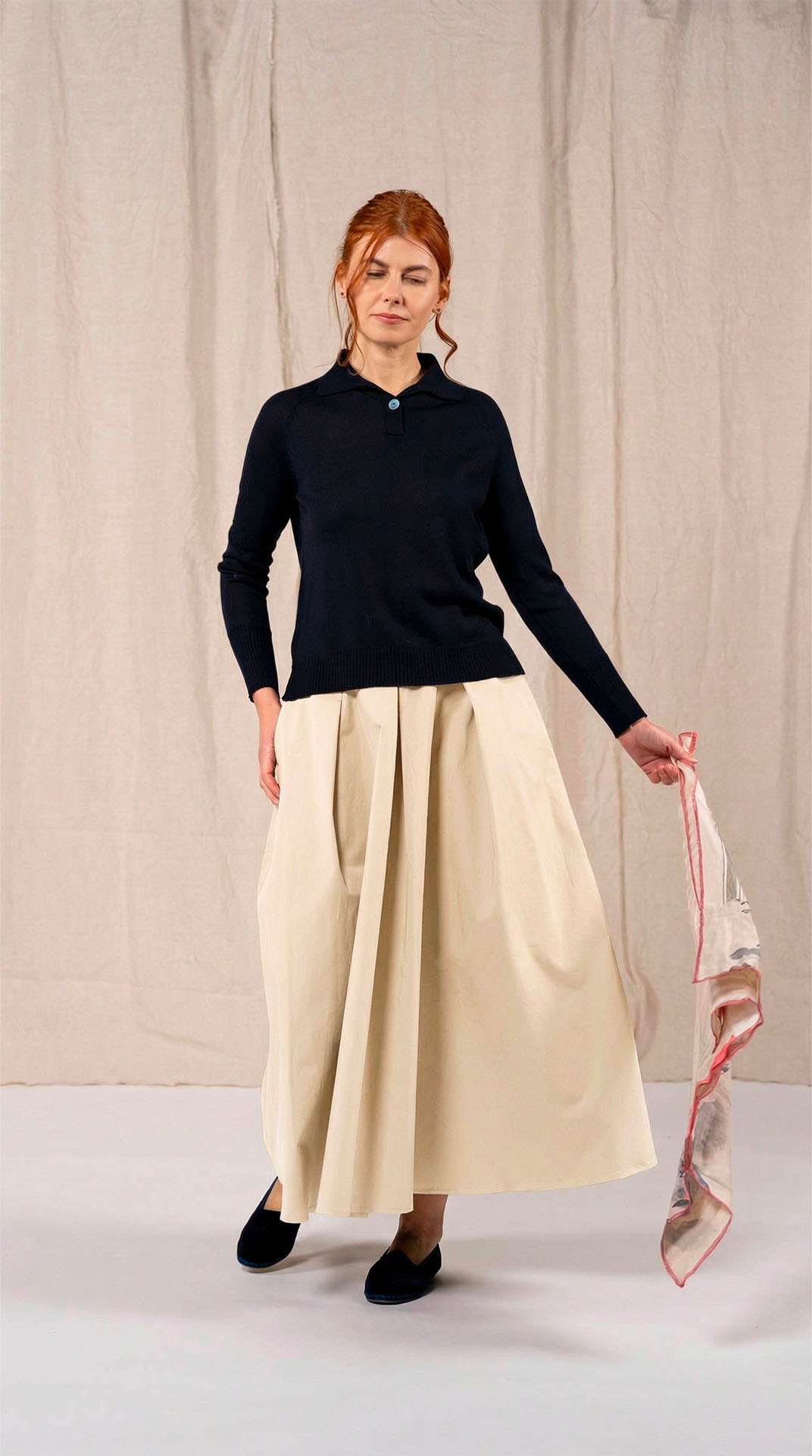 Gonna al polpaccio, con chiusura laterale con bottone e cerniera. Presenta due fondi piega cuciti sia sul davanti che sul retro, che ne definiscono la linea essenziale e la struttura.