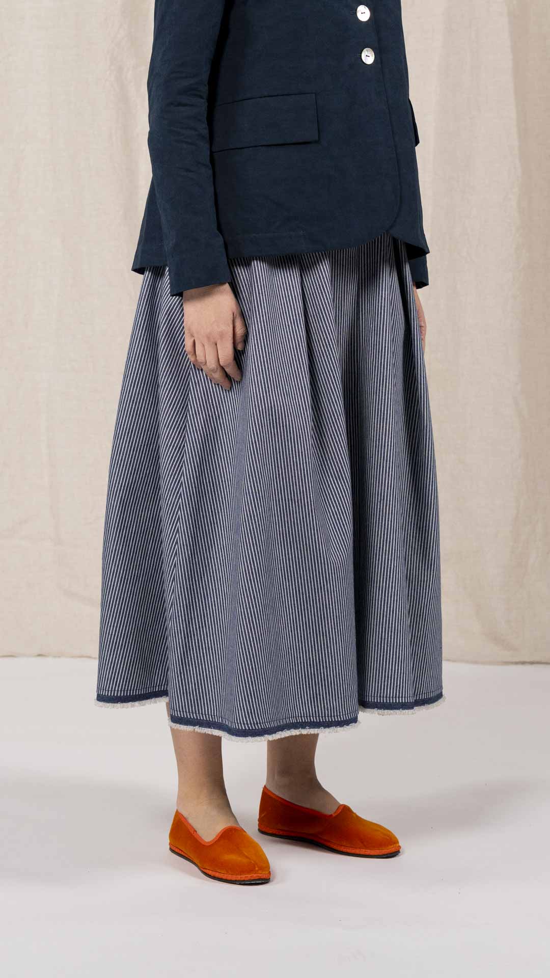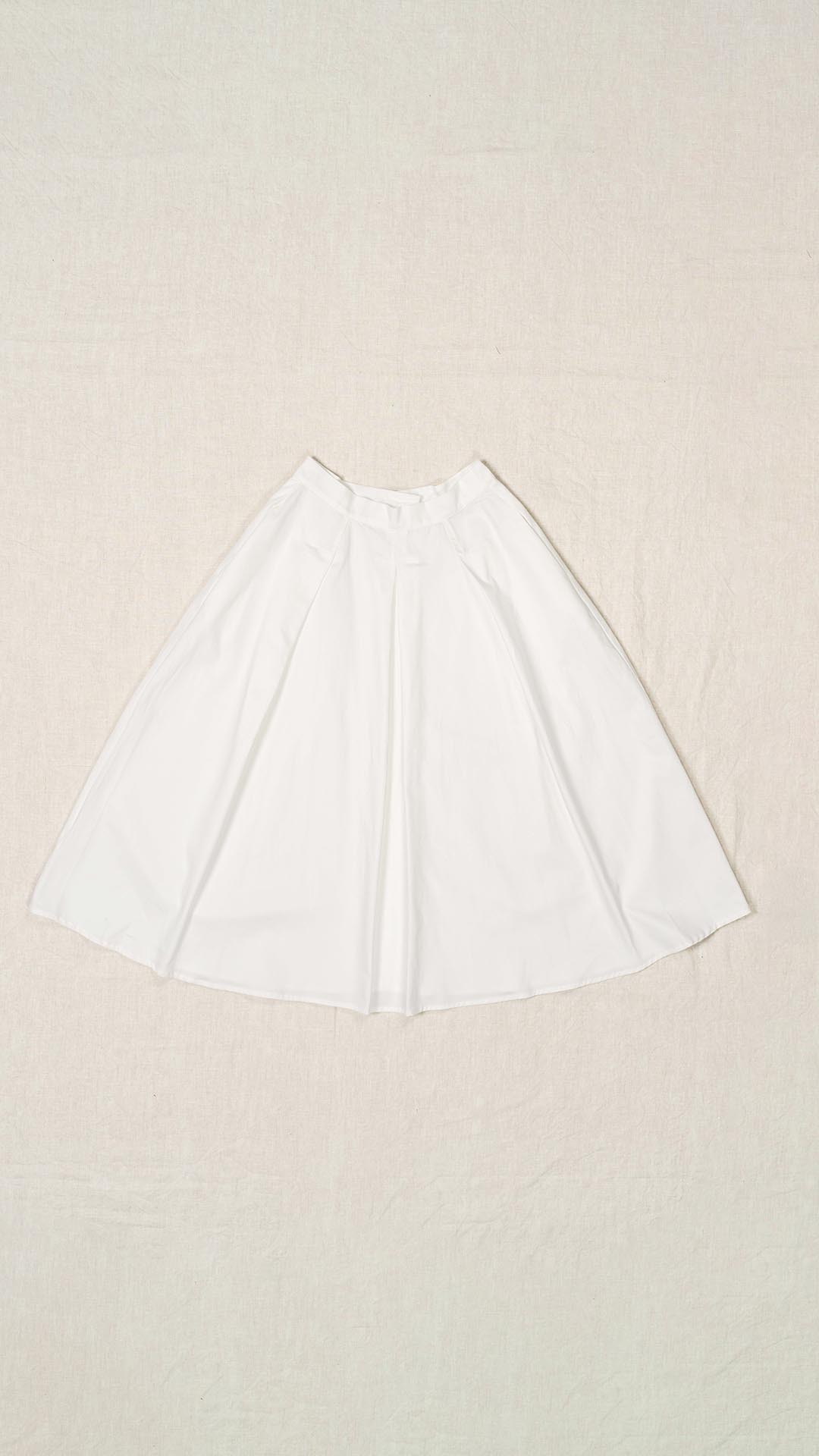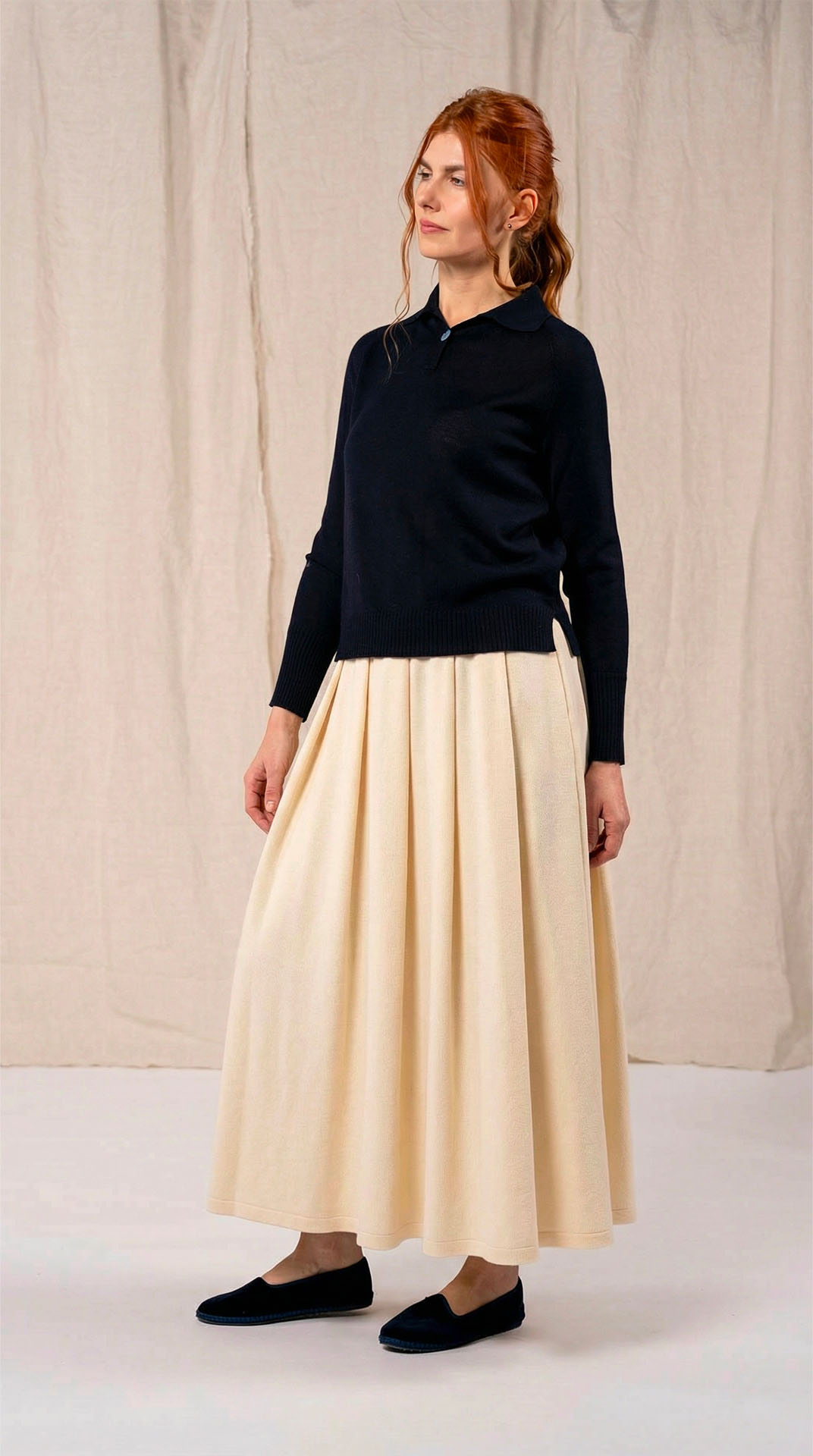 Gonna al polpaccio, con chiusura laterale con bottone e cerniera. Presenta due fondi piega cuciti sia sul davanti che sul retro, che ne definiscono la linea essenziale e la struttura.