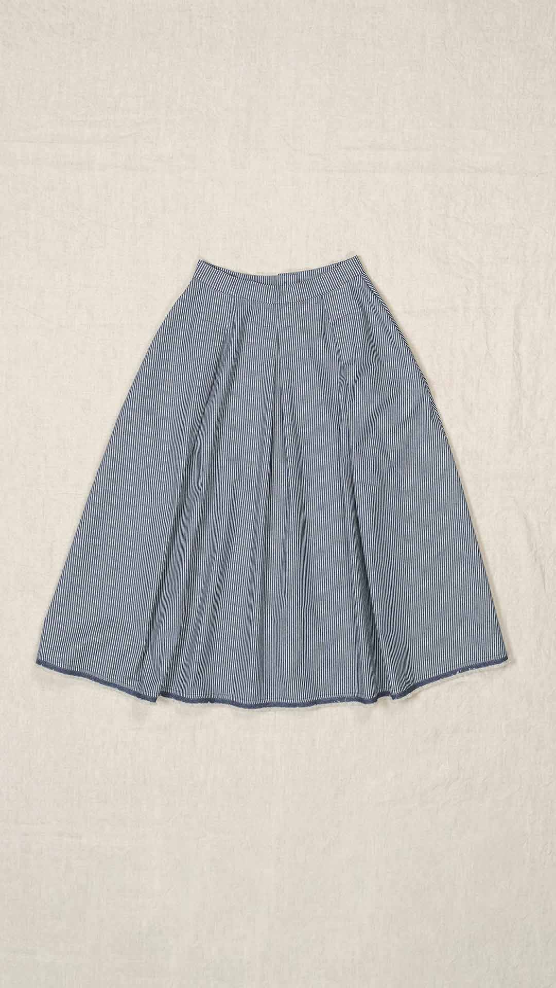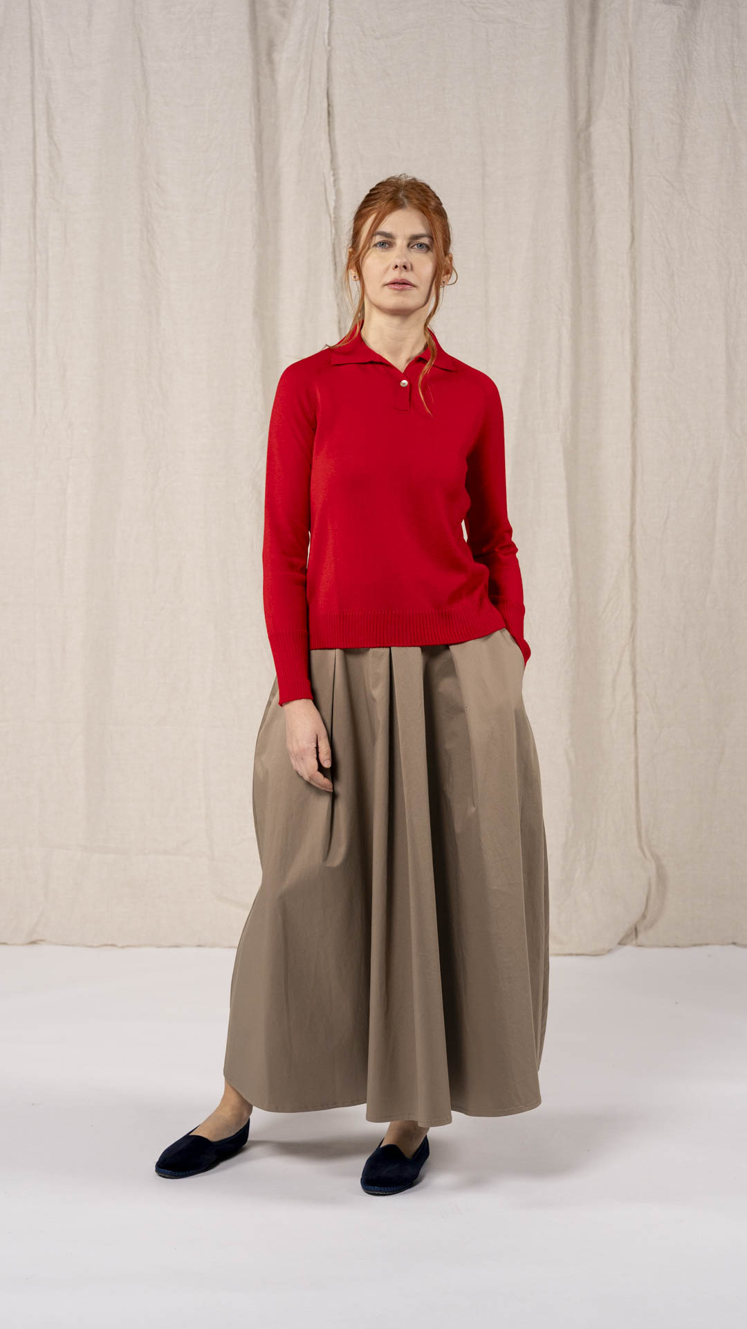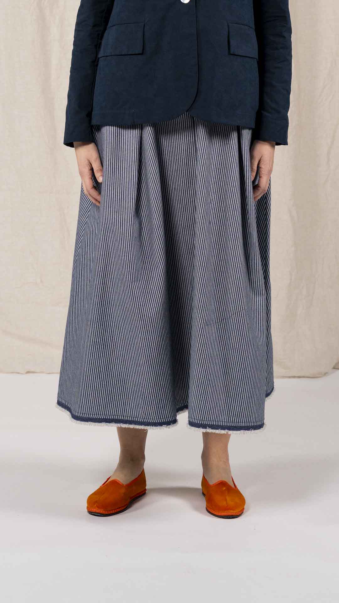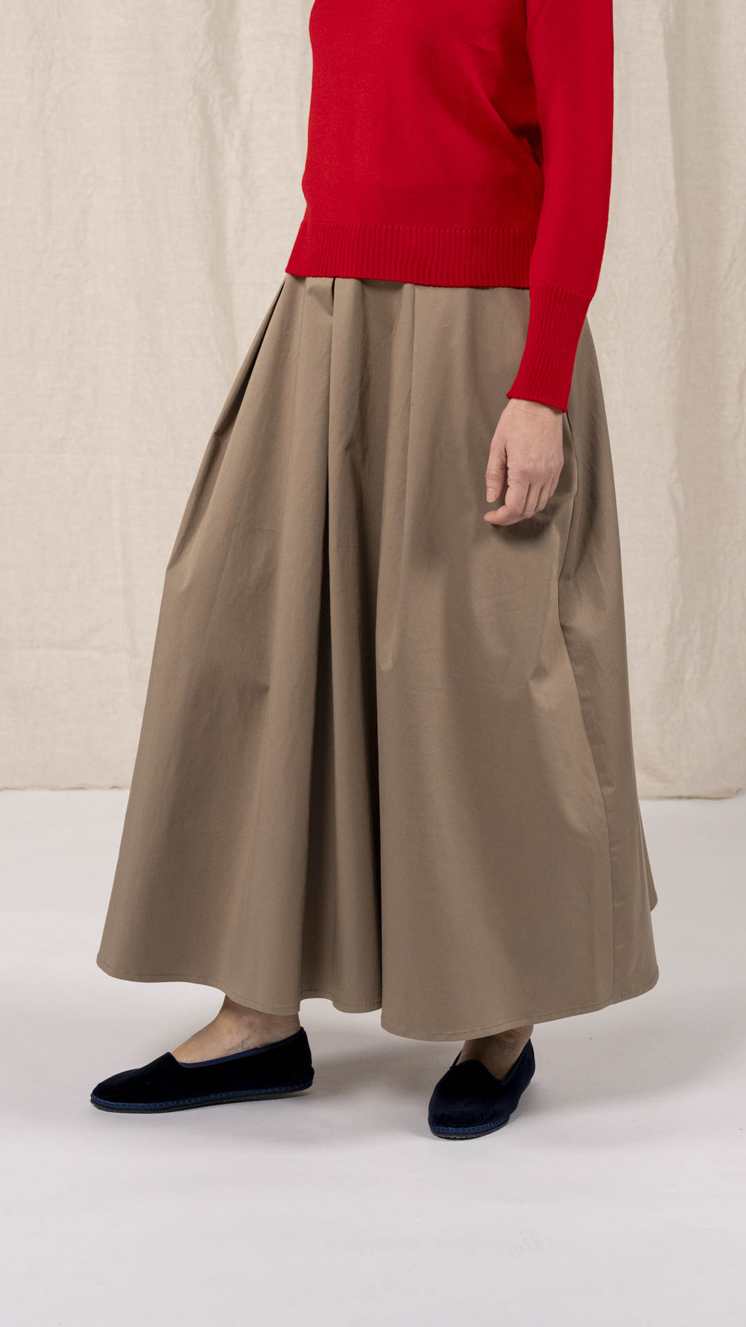 Gonna al polpaccio, con chiusura laterale con bottone e cerniera. Presenta due fondi piega cuciti sia sul davanti che sul retro, che ne definiscono la linea essenziale e la struttura.
