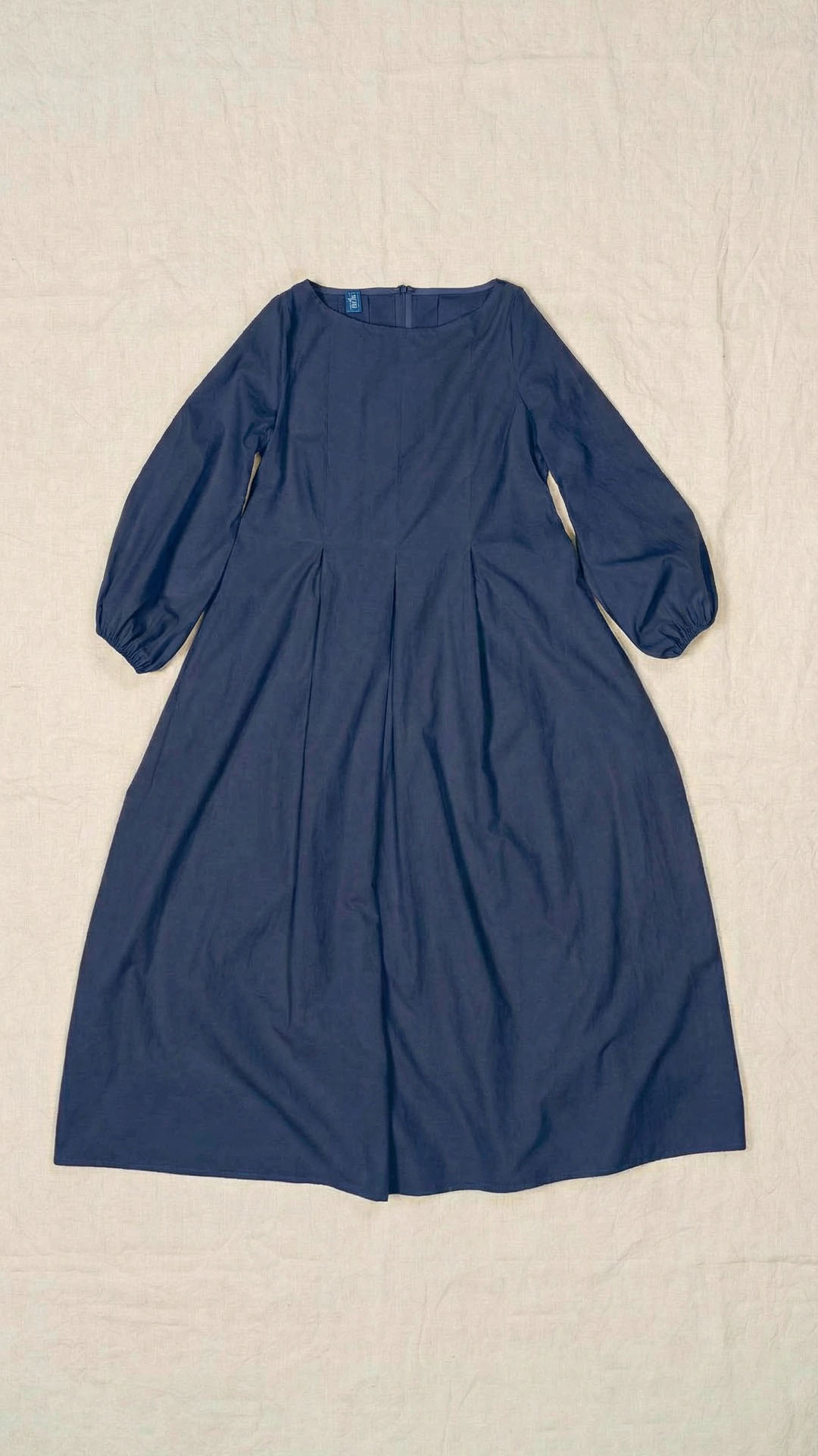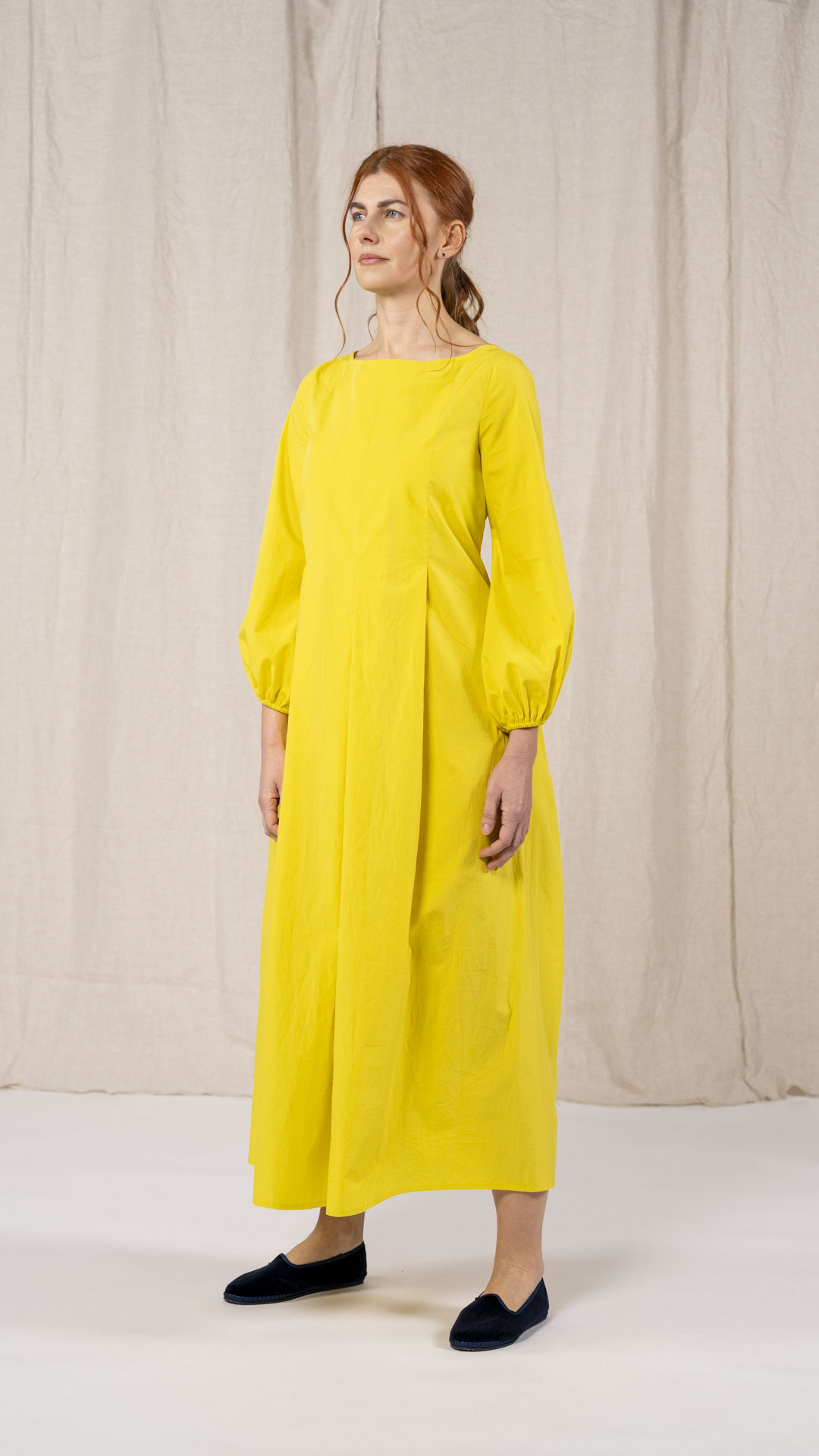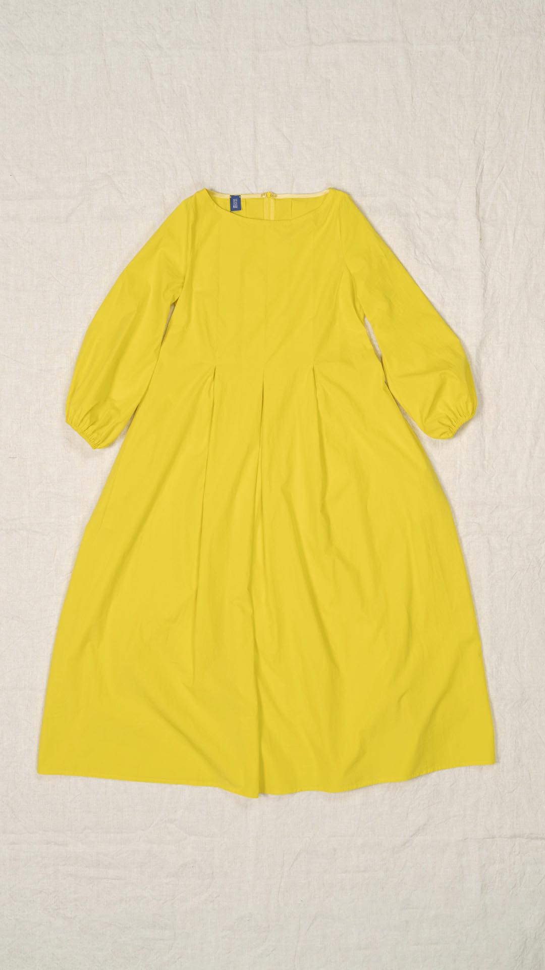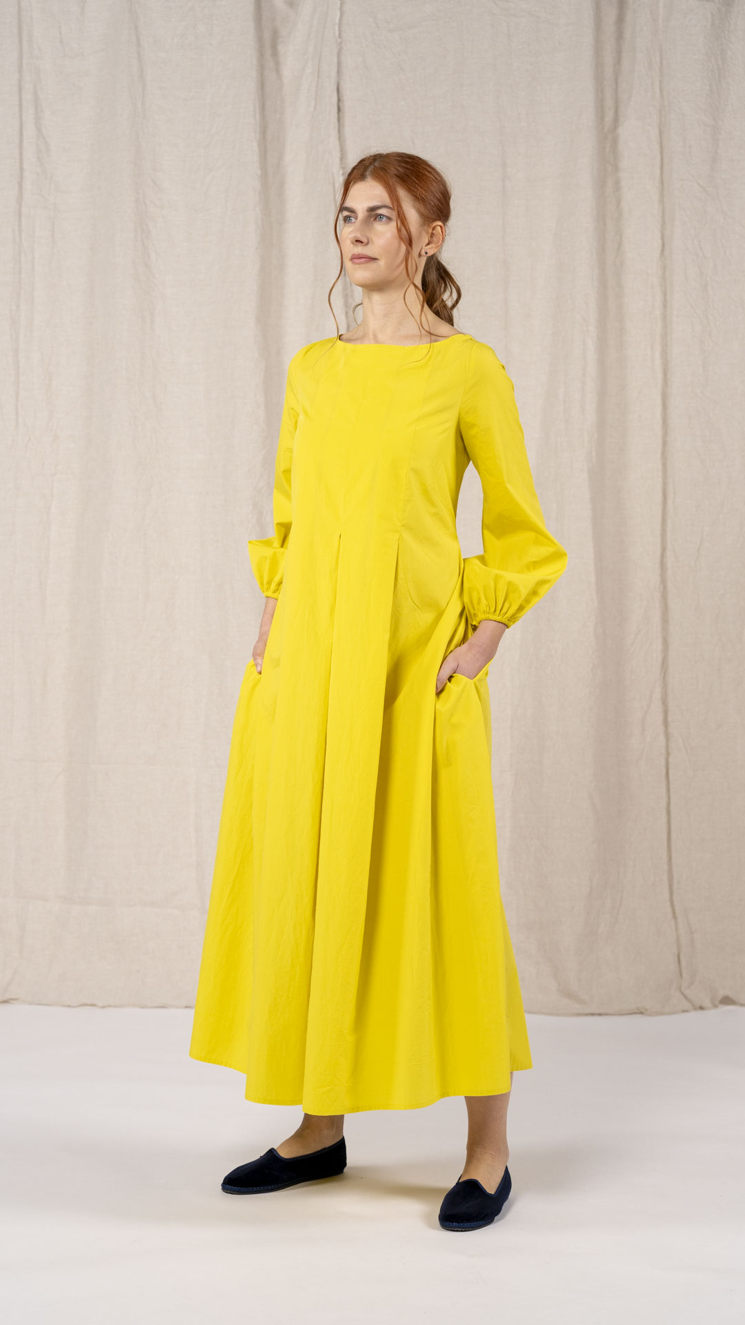 Una nuova interpretazione dell’abito Filo, caratterizzato da tre profondi fondi piega sia sul davanti che sul retro, che creano struttura e movimento. Scollo a barca, manica con arricciatura e polso rifinito da un elastico. Chiusura con cerniera sul retro e tasche laterali. Un abito dal carattere fresco e leggero.