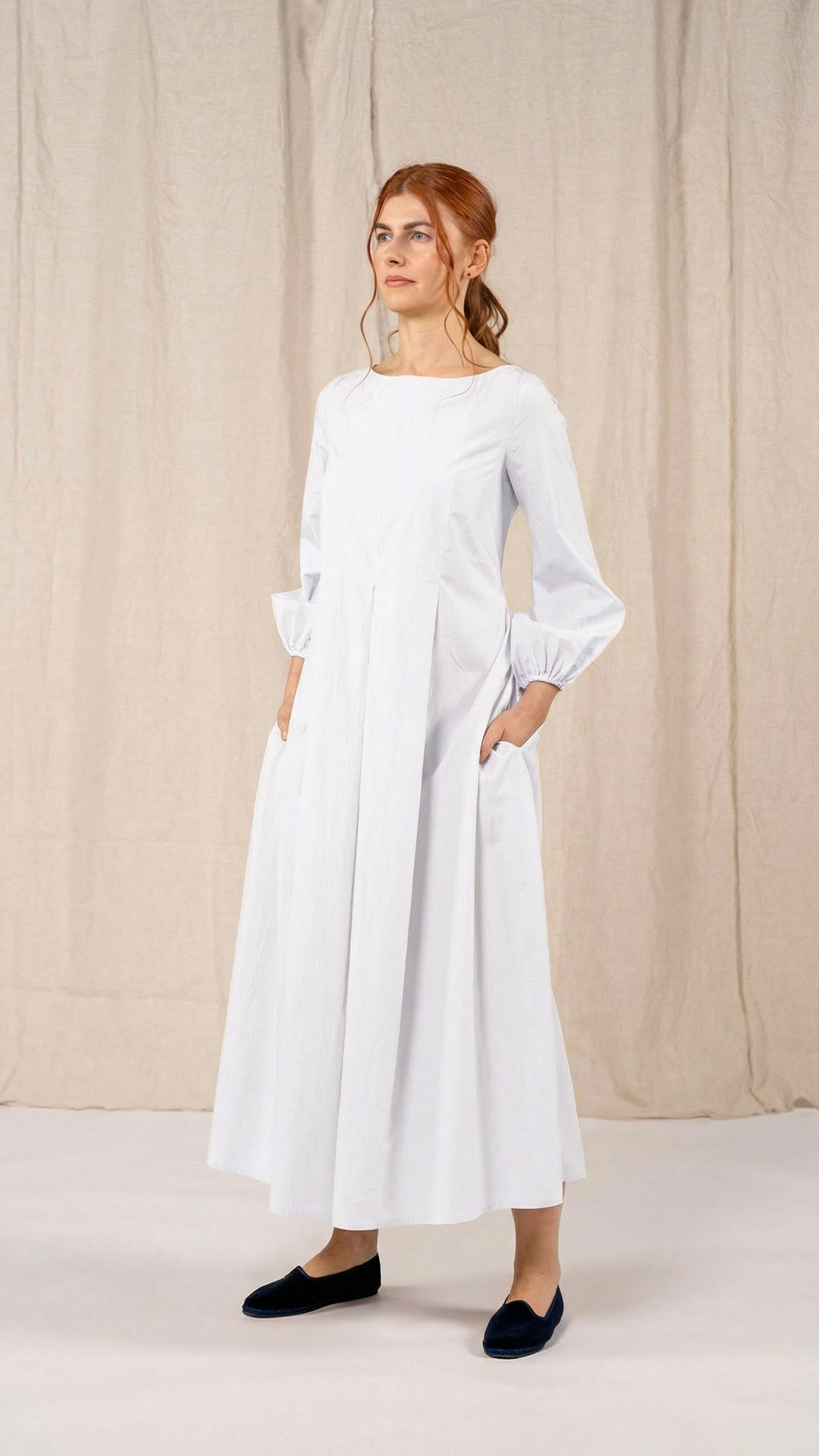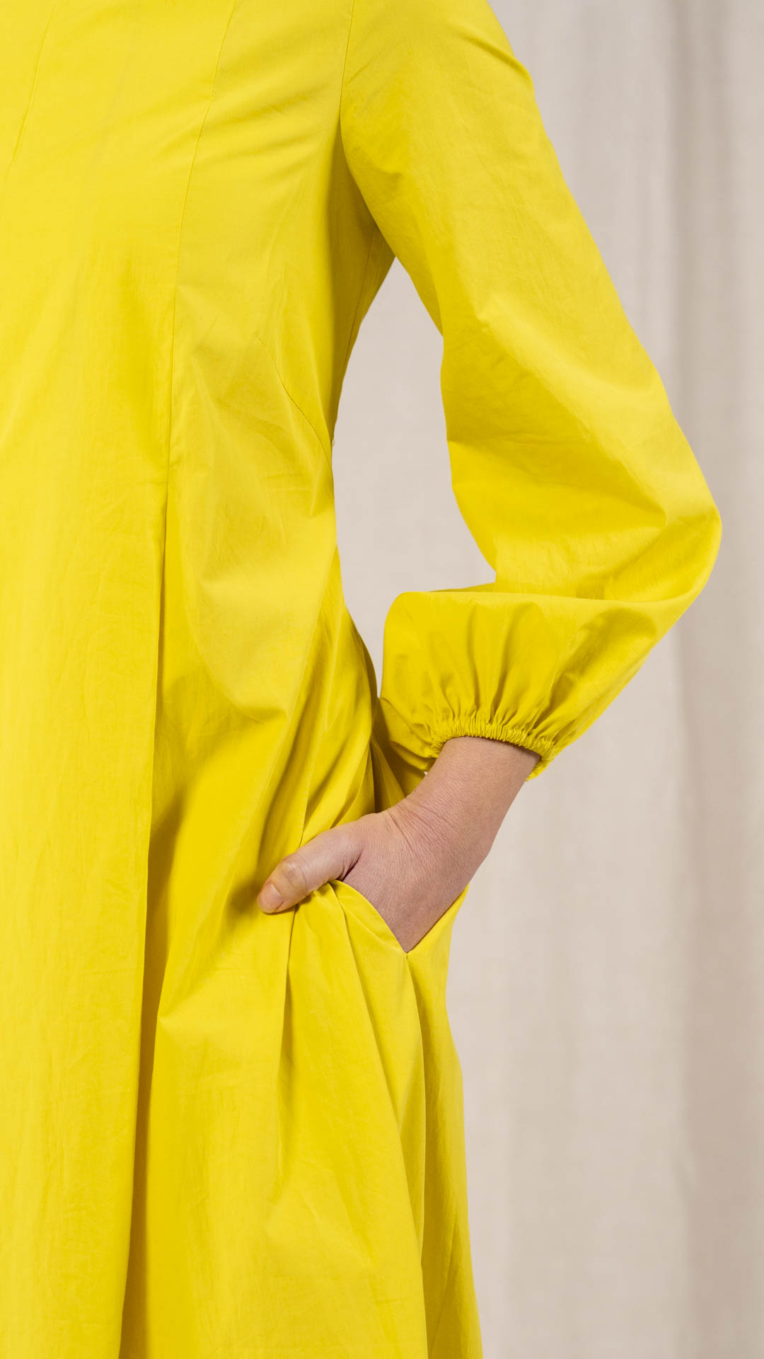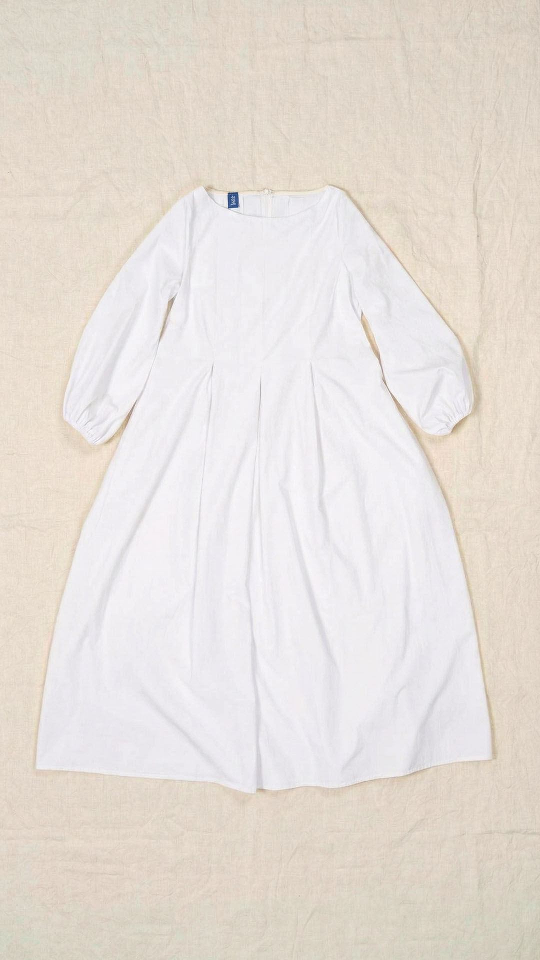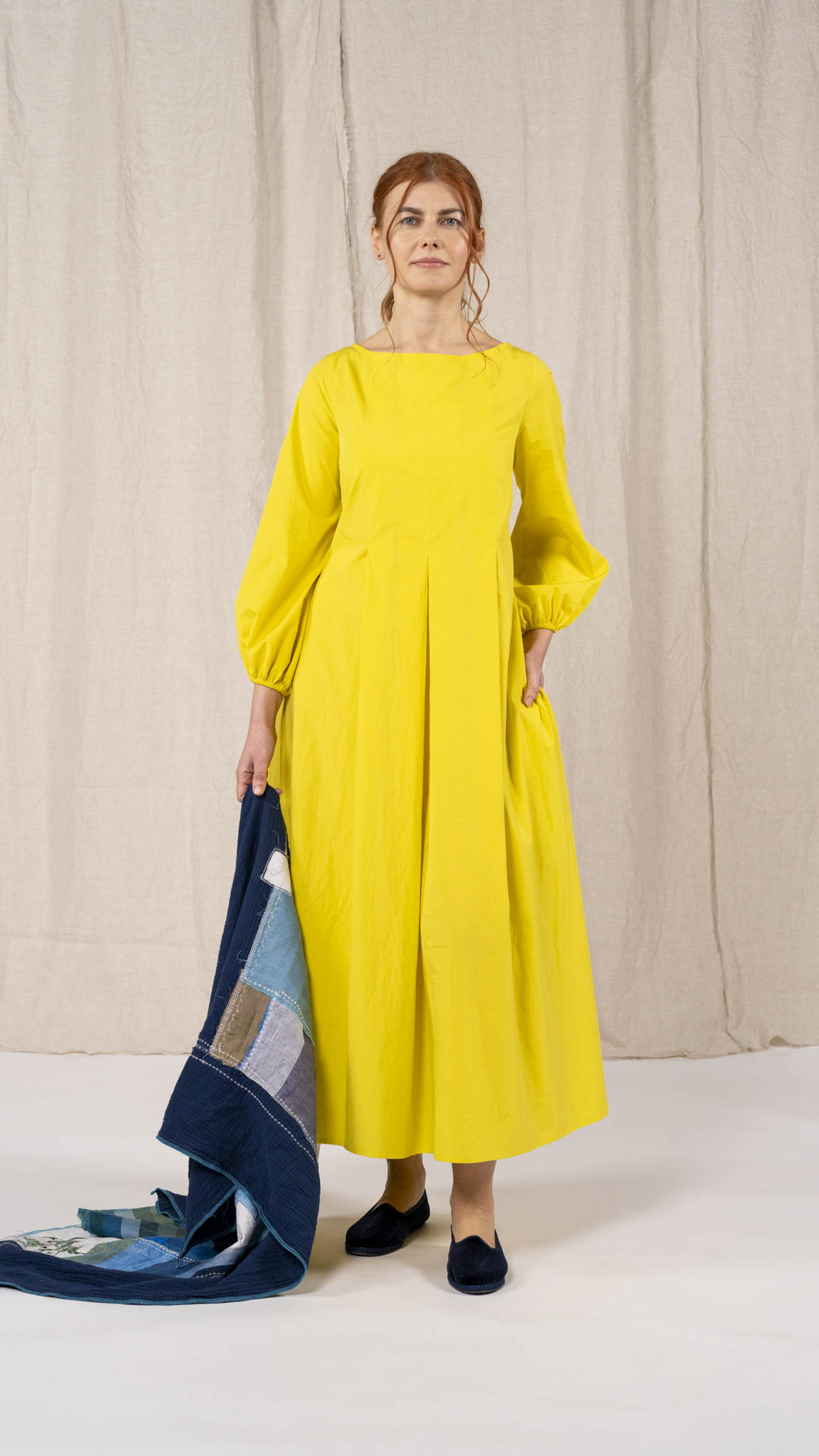 Una nuova interpretazione dell’abito Filo, caratterizzato da tre profondi fondi piega sia sul davanti che sul retro, che creano struttura e movimento. Scollo a barca, manica con arricciatura e polso rifinito da un elastico. Chiusura con cerniera sul retro e tasche laterali. Un abito dal carattere fresco e leggero.