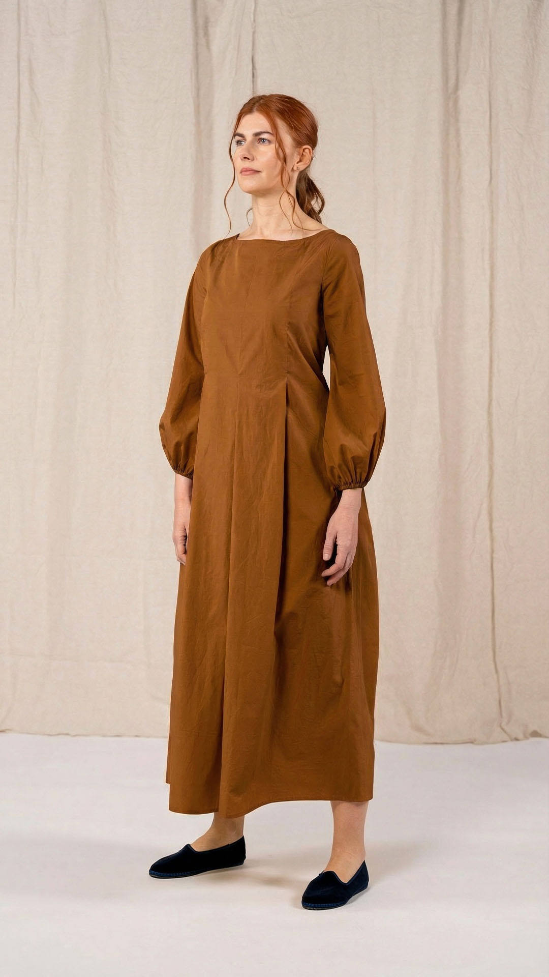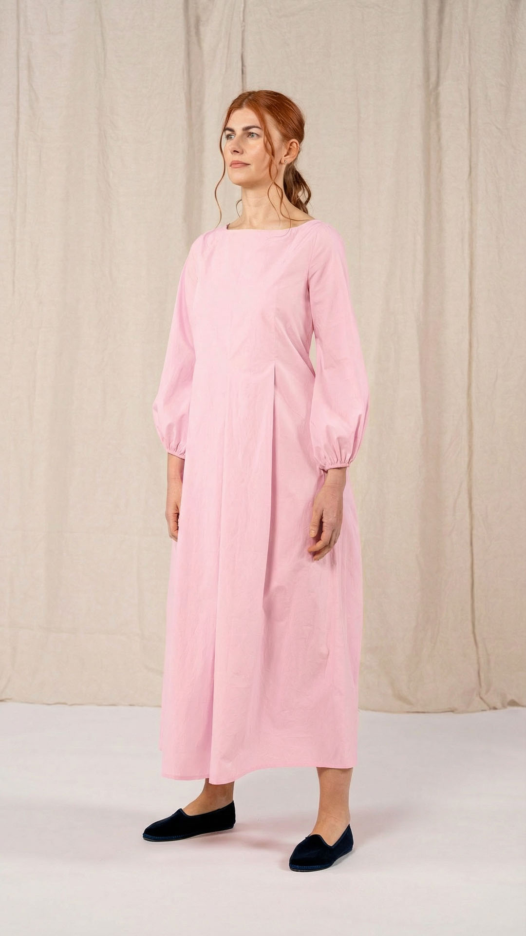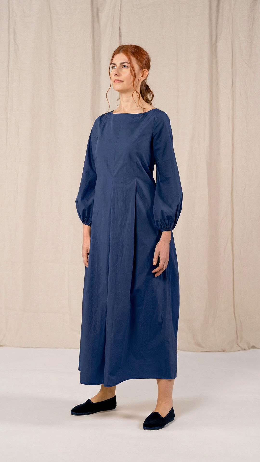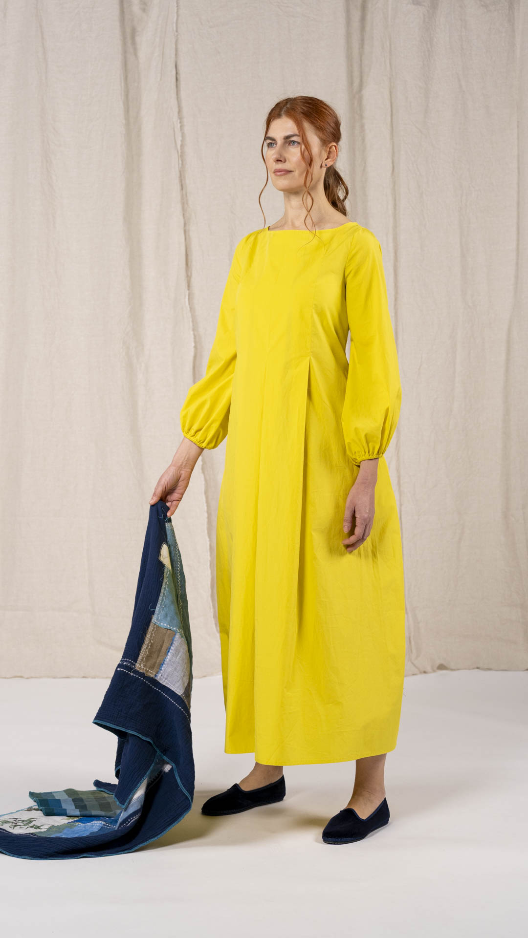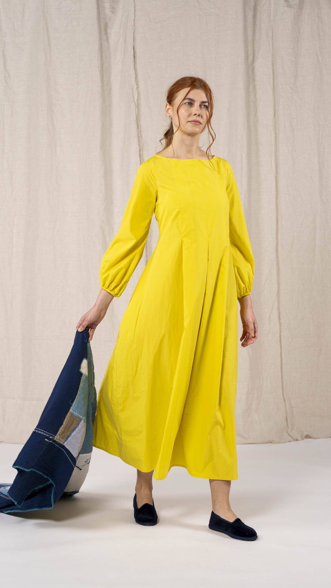 Una nuova interpretazione dell’abito Filo, caratterizzato da tre profondi fondi piega sia sul davanti che sul retro, che creano struttura e movimento. Scollo a barca, manica con arricciatura e polso rifinito da un elastico. Chiusura con cerniera sul retro e tasche laterali. Un abito dal carattere fresco e leggero.
