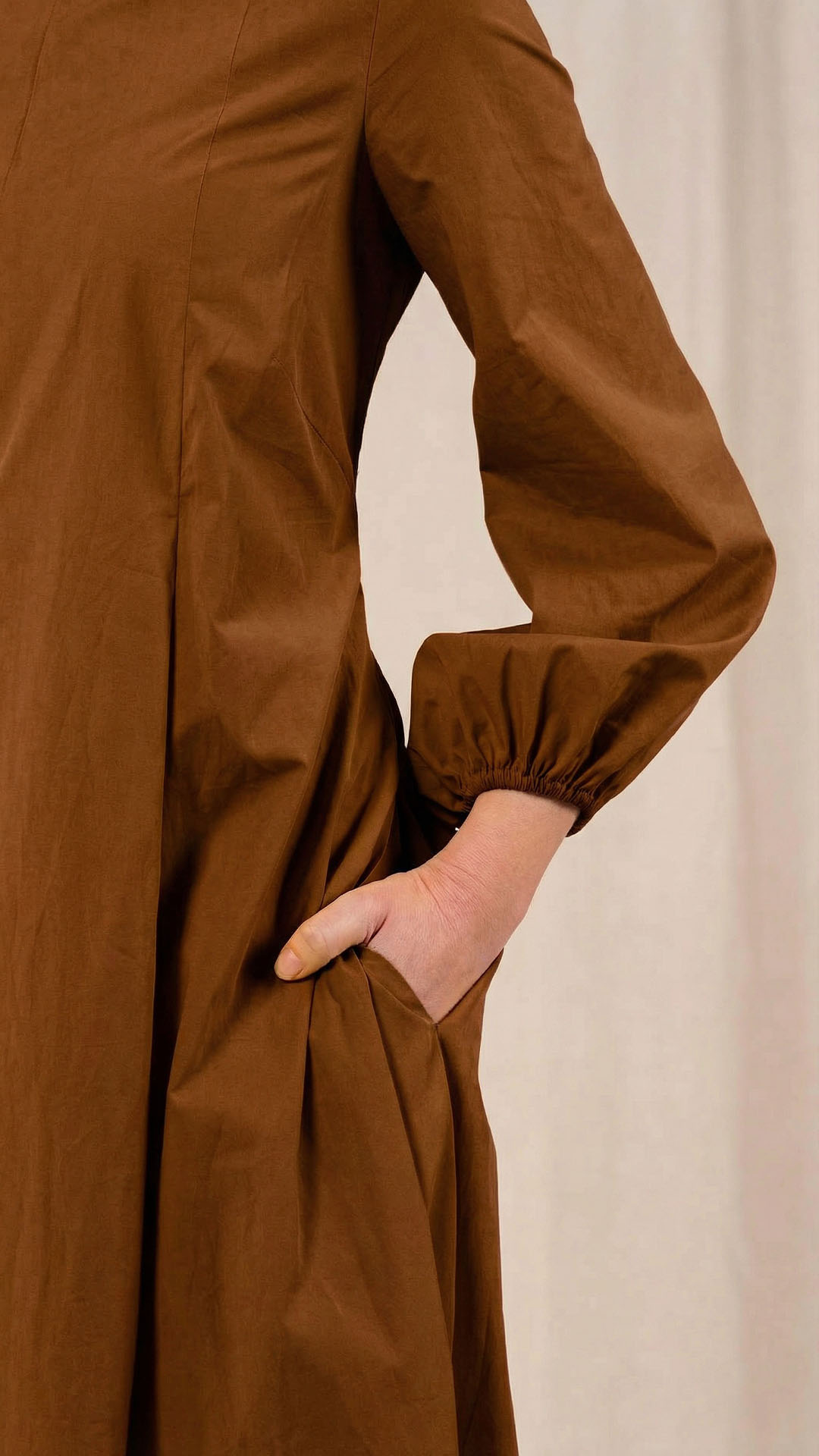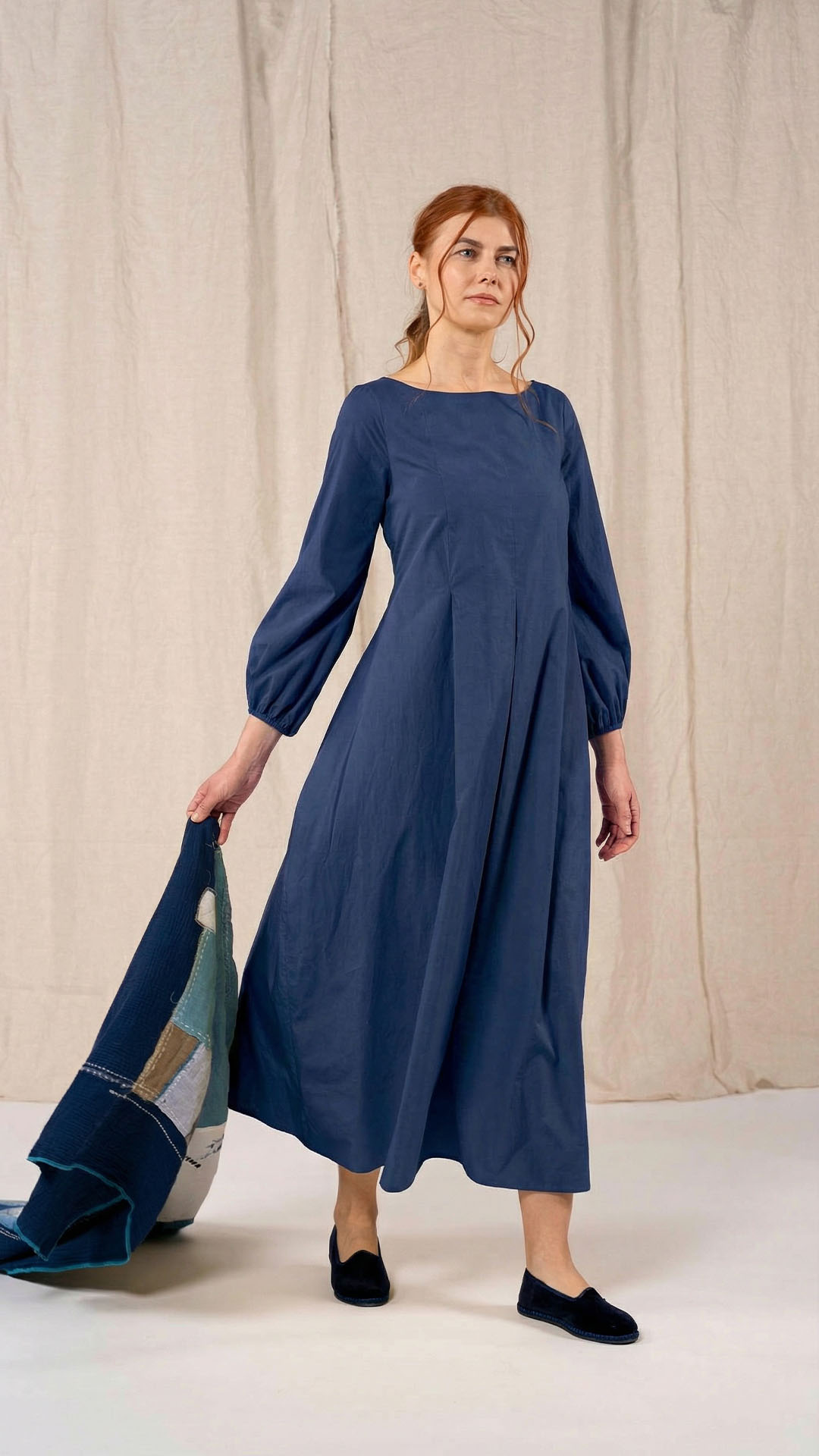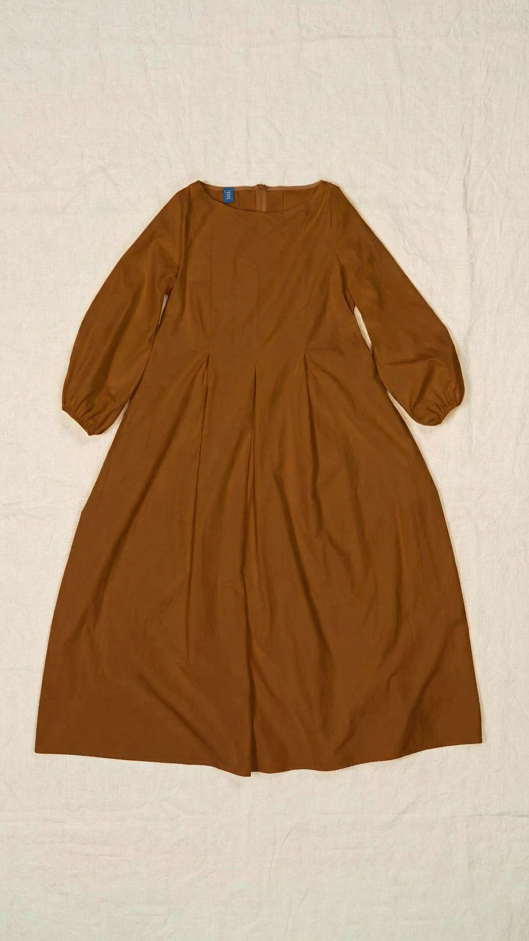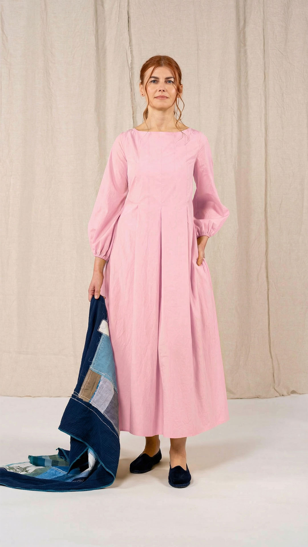 Una nuova interpretazione dell’abito Filo, caratterizzato da tre profondi fondi piega sia sul davanti che sul retro, che creano struttura e movimento. Scollo a barca, manica con arricciatura e polso rifinito da un elastico. Chiusura con cerniera sul retro e tasche laterali. Un abito dal carattere fresco e leggero.