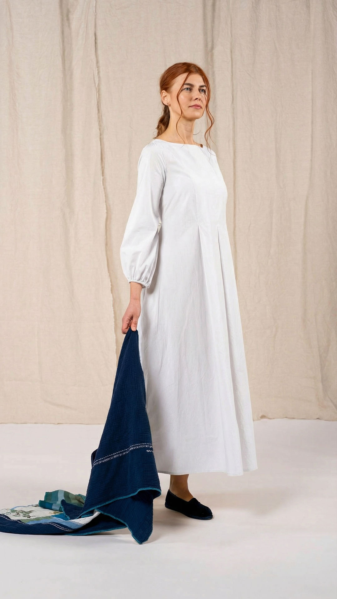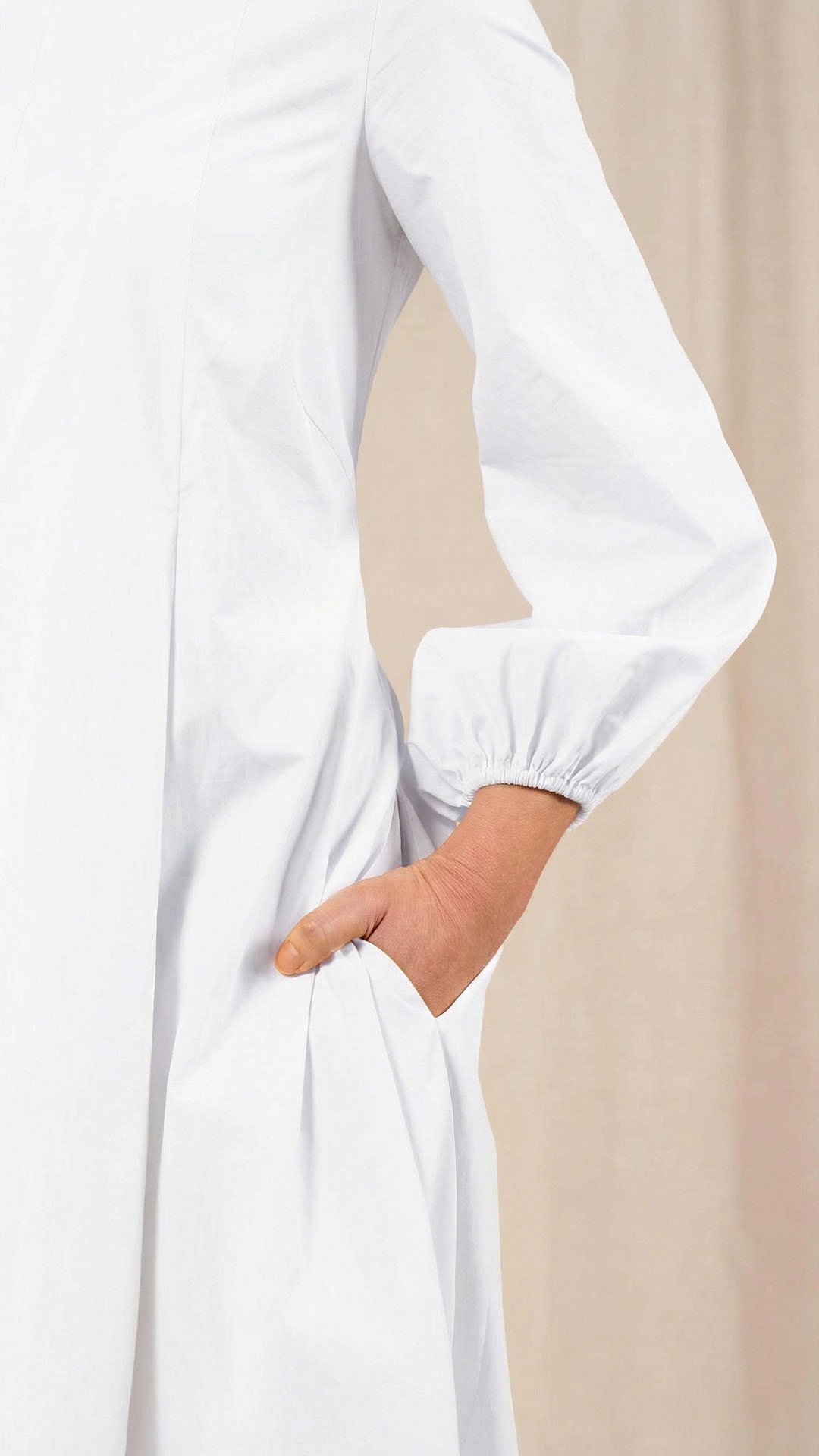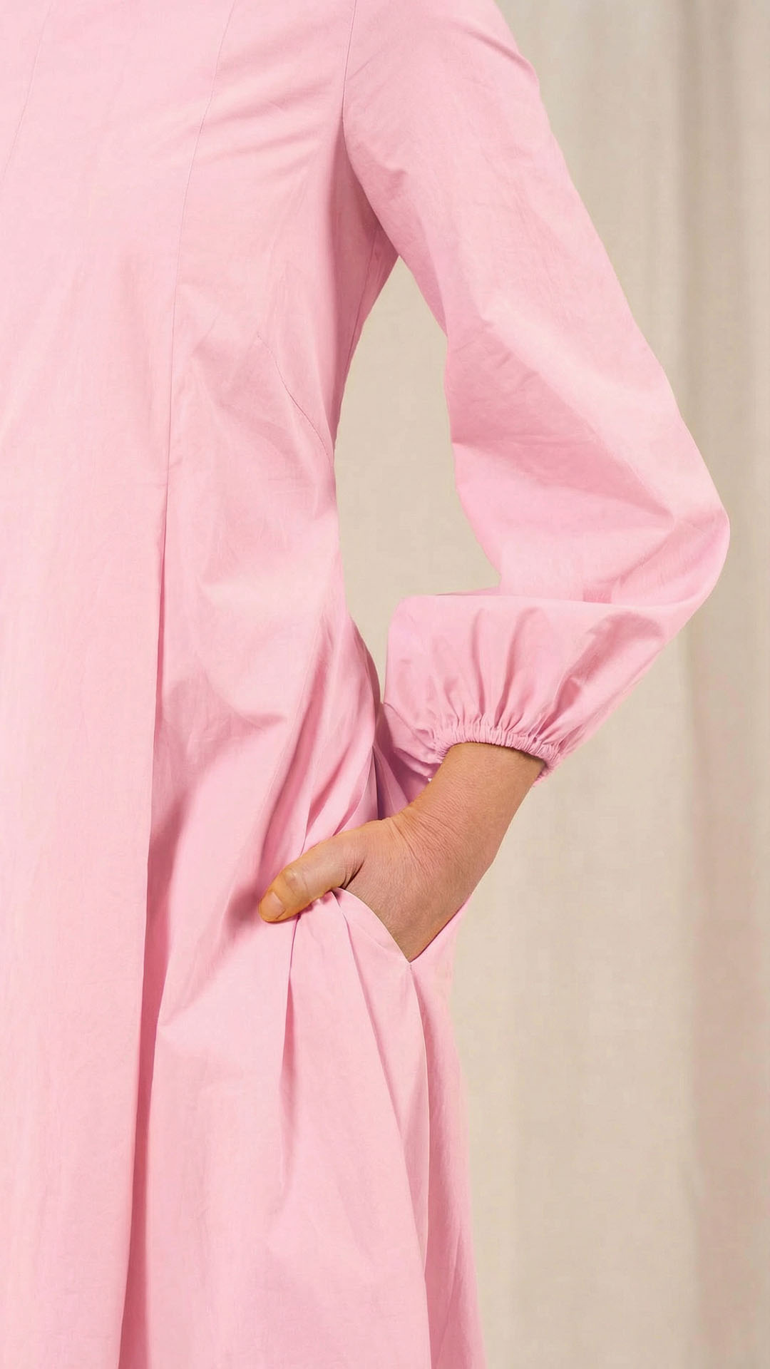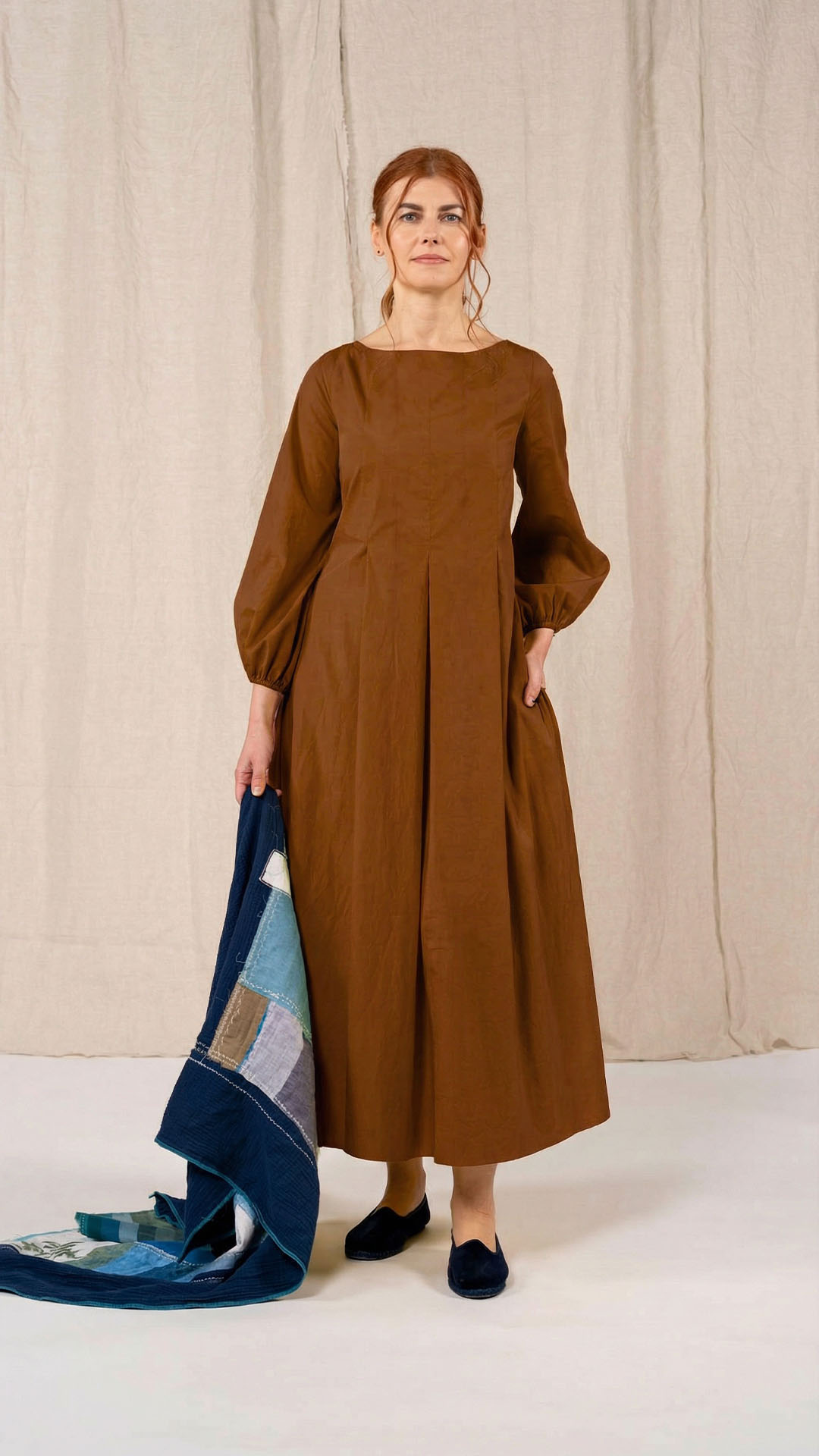 Una nuova interpretazione dell’abito Filo, caratterizzato da tre profondi fondi piega sia sul davanti che sul retro, che creano struttura e movimento. Scollo a barca, manica con arricciatura e polso rifinito da un elastico. Chiusura con cerniera sul retro e tasche laterali. Un abito dal carattere fresco e leggero.