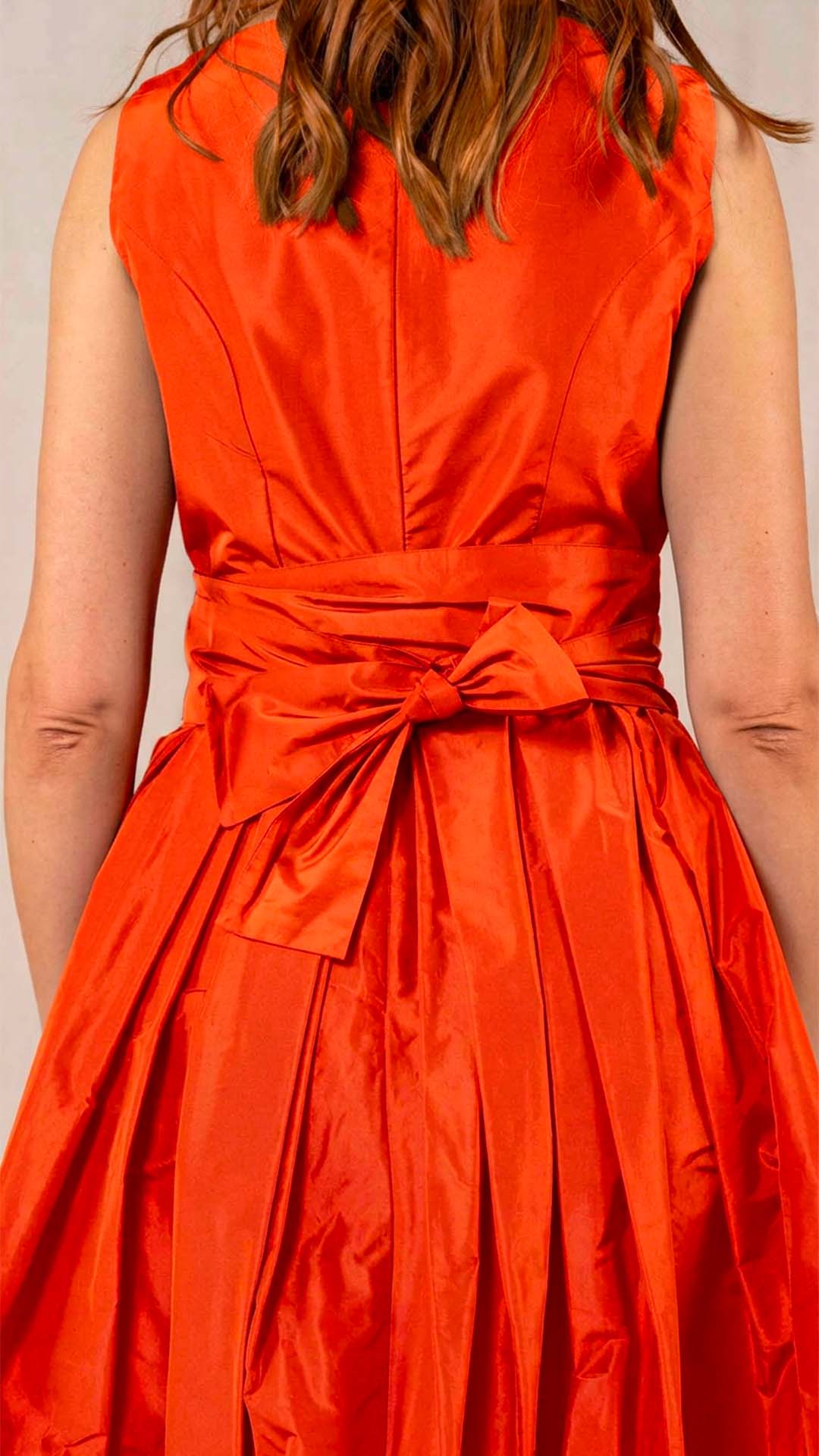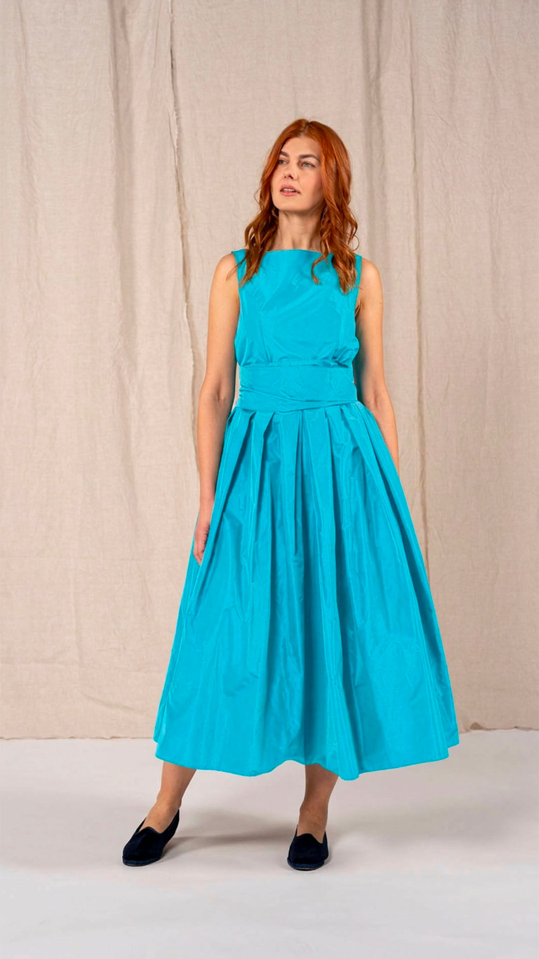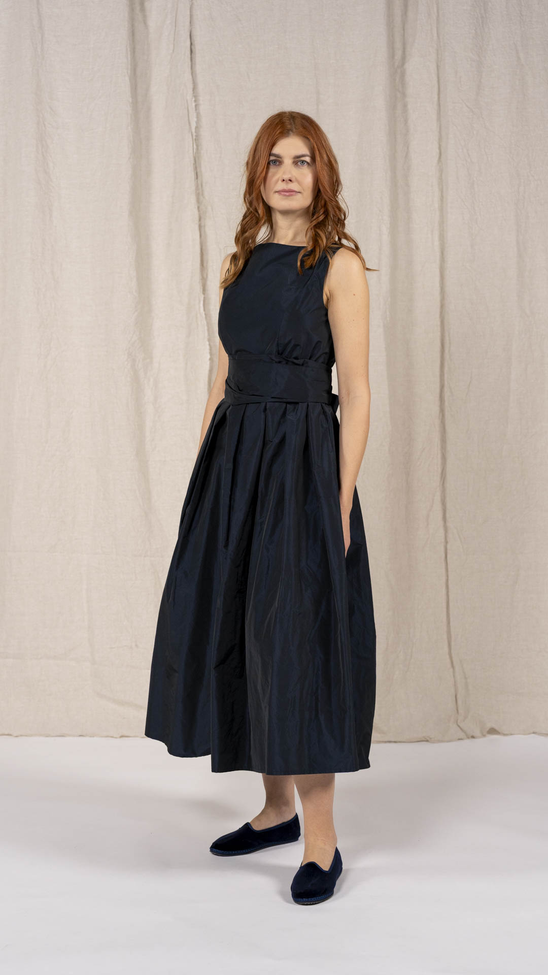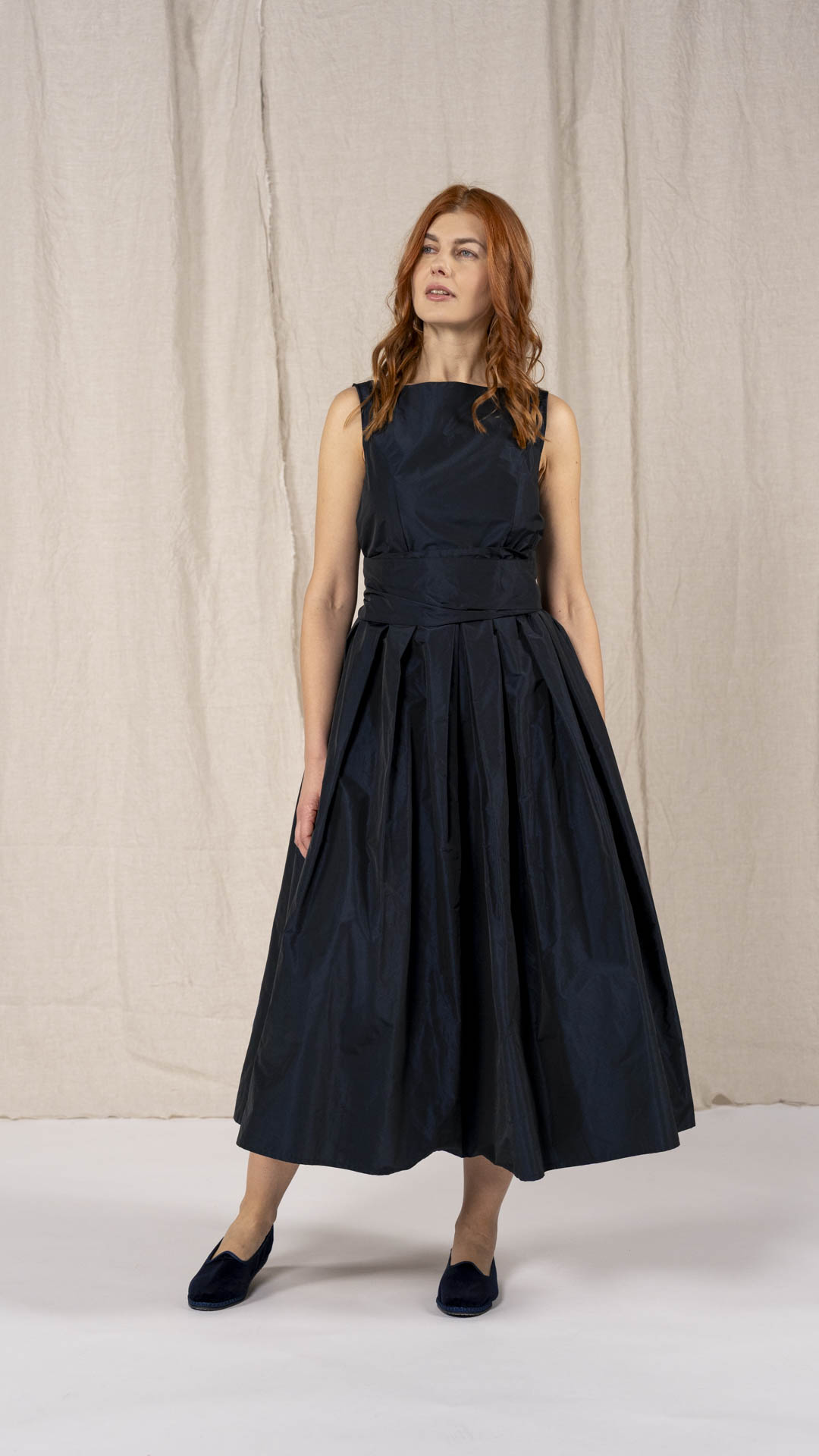 Abito in taffetà con scollo a barca e corpino aderente. Dalla vita si aprono fondi piega che donano ampiezza e movimento alla parte inferiore del capo. Completa il modello una fascia da annodare in vita. Un abito sia per una cerimonia che per essere indossato tutti i giorni.