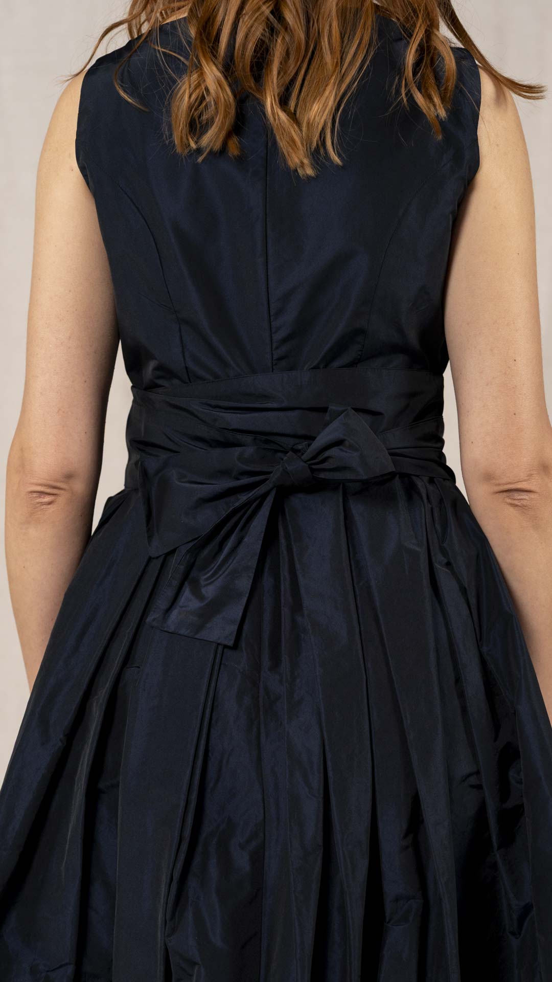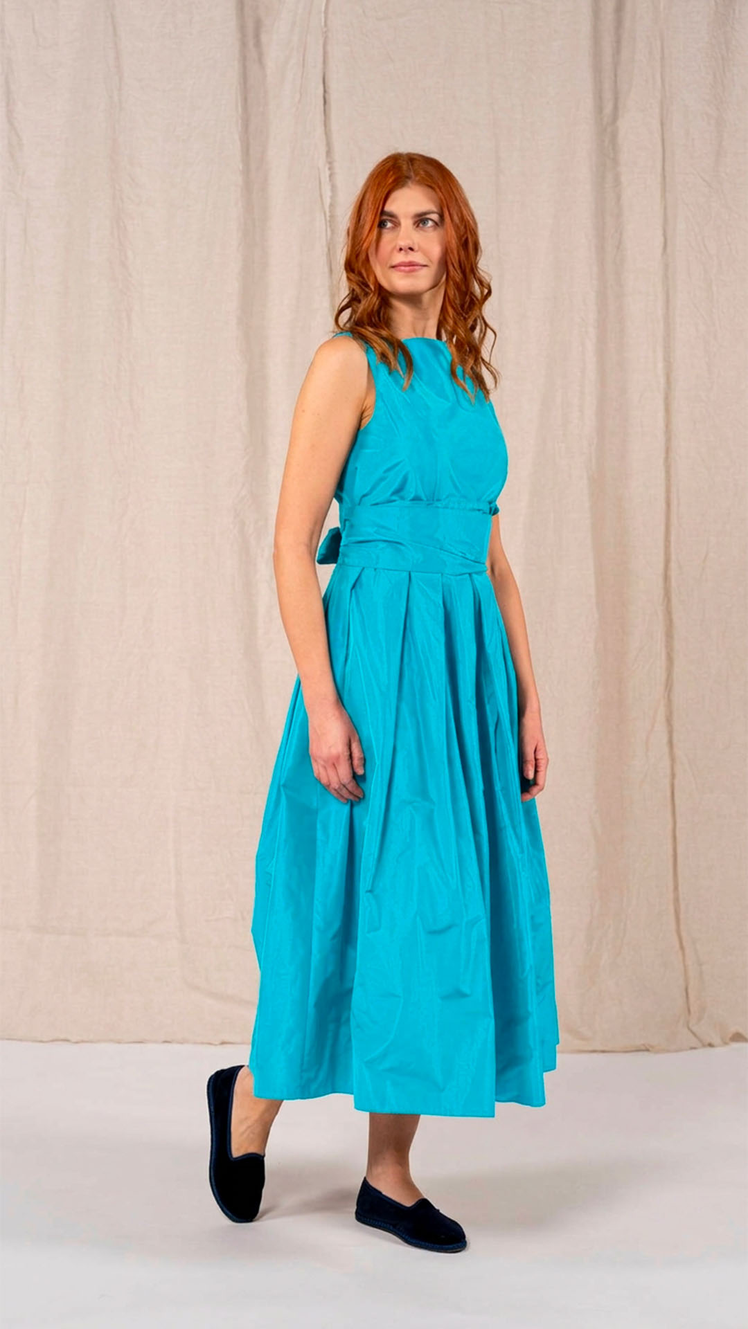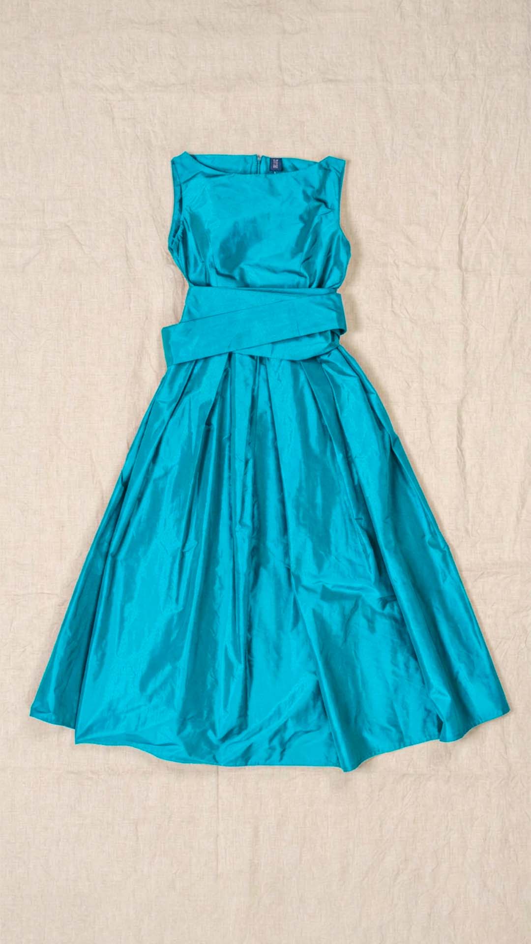 Abito in taffetà con scollo a barca e corpino aderente. Dalla vita si aprono fondi piega che donano ampiezza e movimento alla parte inferiore del capo. Completa il modello una fascia da annodare in vita. Un abito sia per una cerimonia che per essere indossato tutti i giorni.