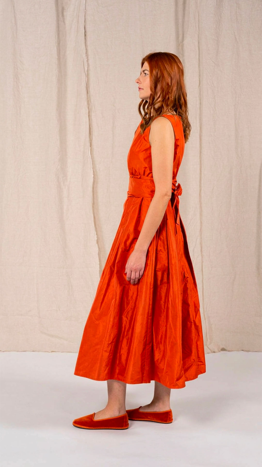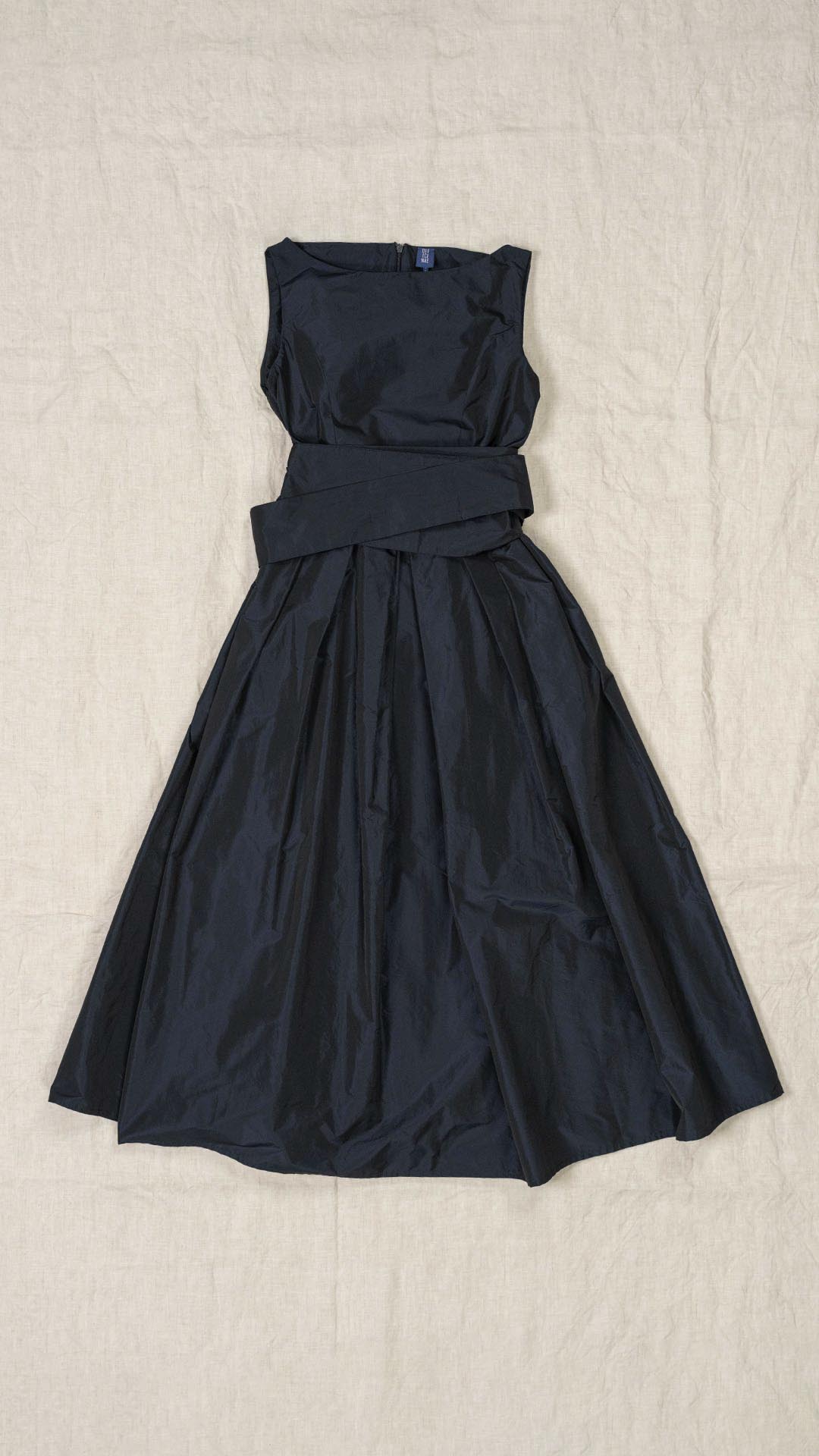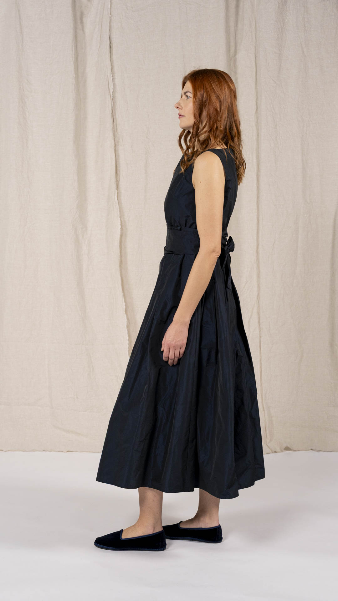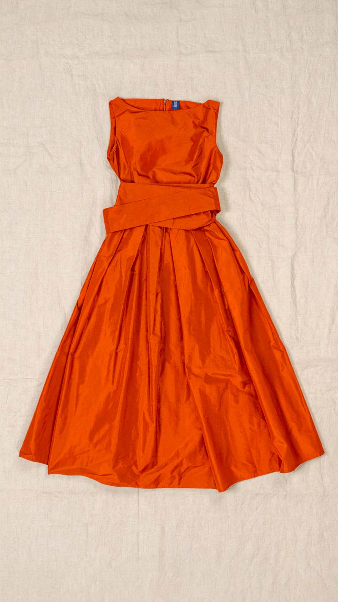 Abito in taffetà con scollo a barca e corpino aderente. Dalla vita si aprono fondi piega che donano ampiezza e movimento alla parte inferiore del capo. Completa il modello una fascia da annodare in vita. Un abito sia per una cerimonia che per essere indossato tutti i giorni.