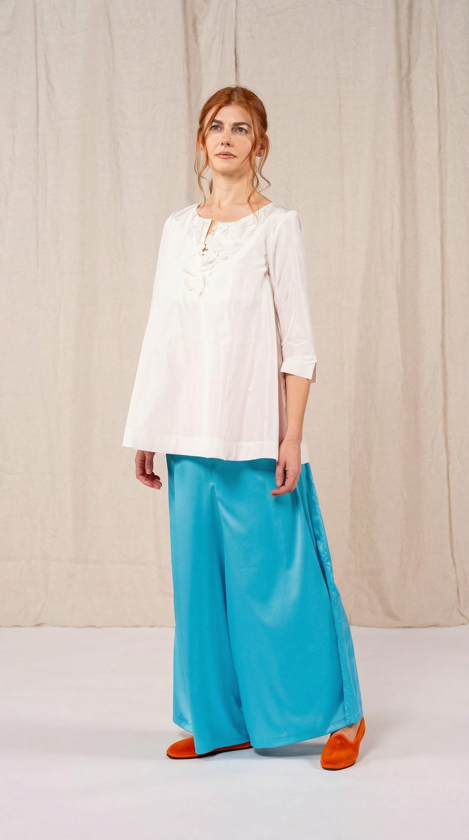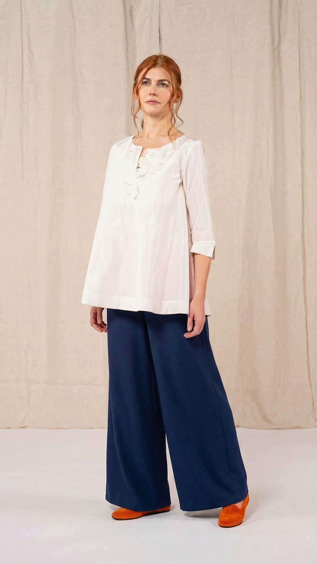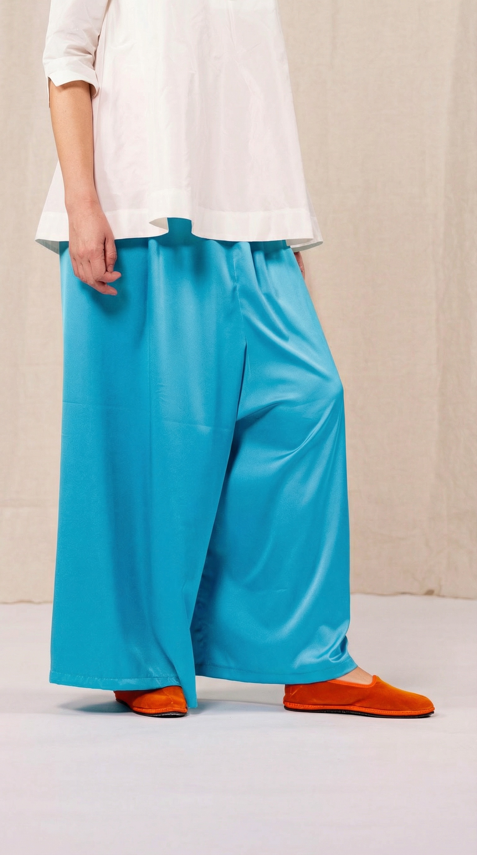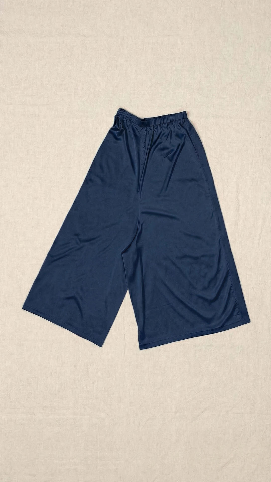 Pantalone con elastico in vita e cavallo basso, caratterizzato da un taglio asimmetrico delle gambe che ne accentua l’ampiezza, ricordando la leggerezza di una gonna pantalone. Capo versatile, adatto sia a interpretazioni più formali che ad abbinamenti più casual.