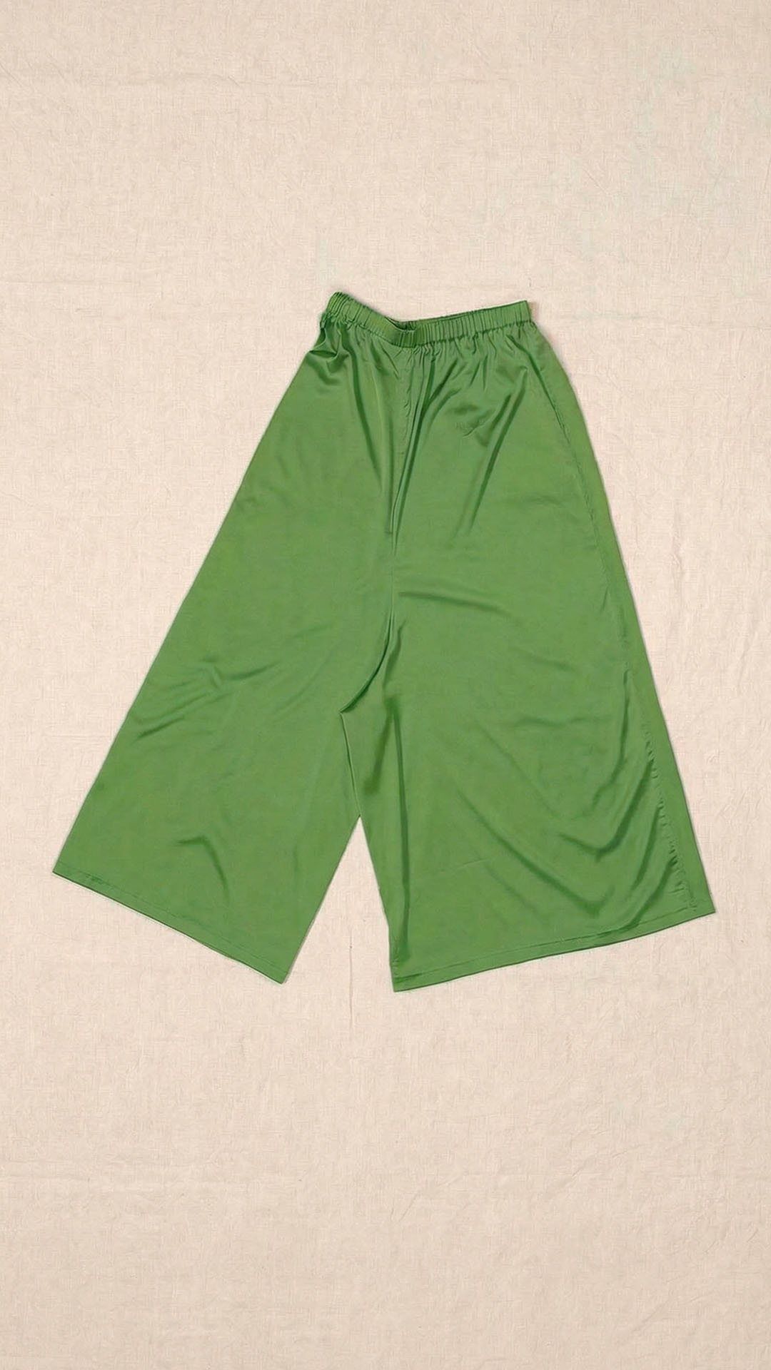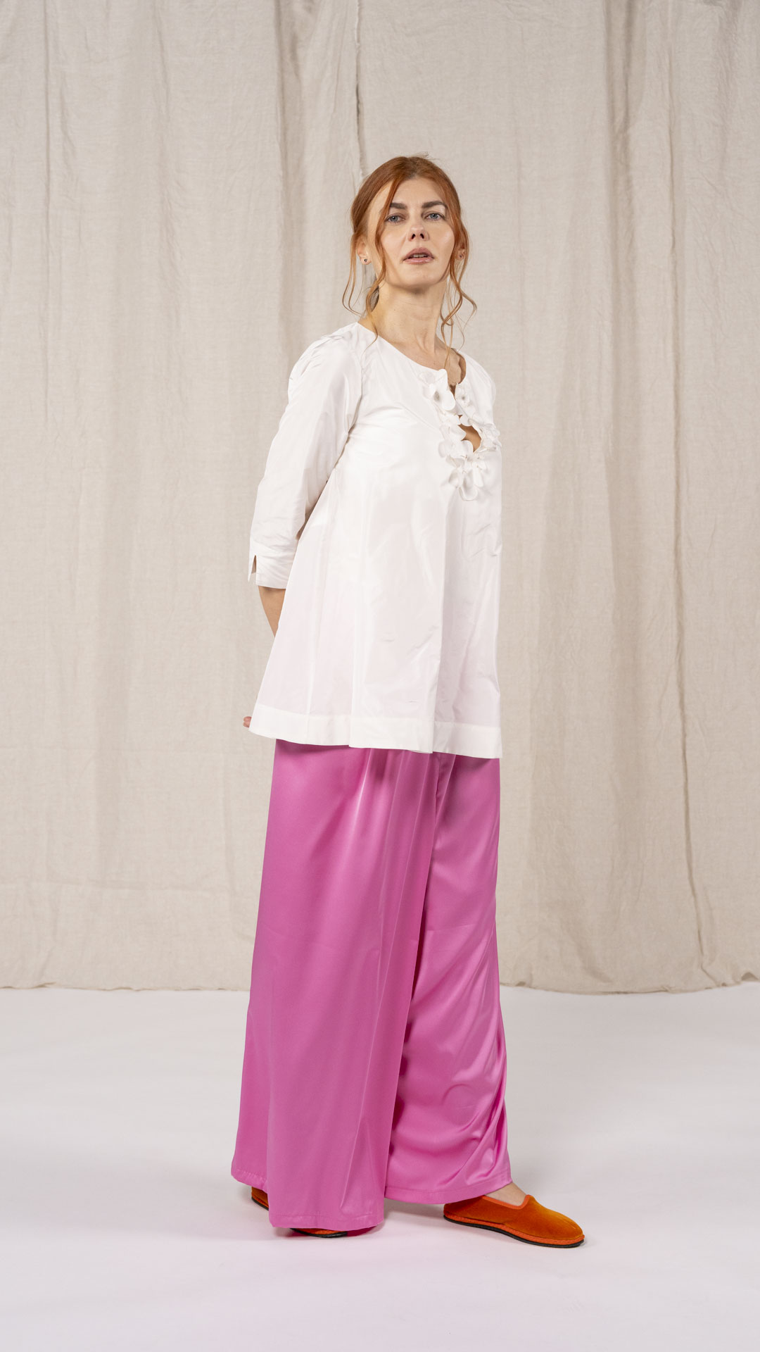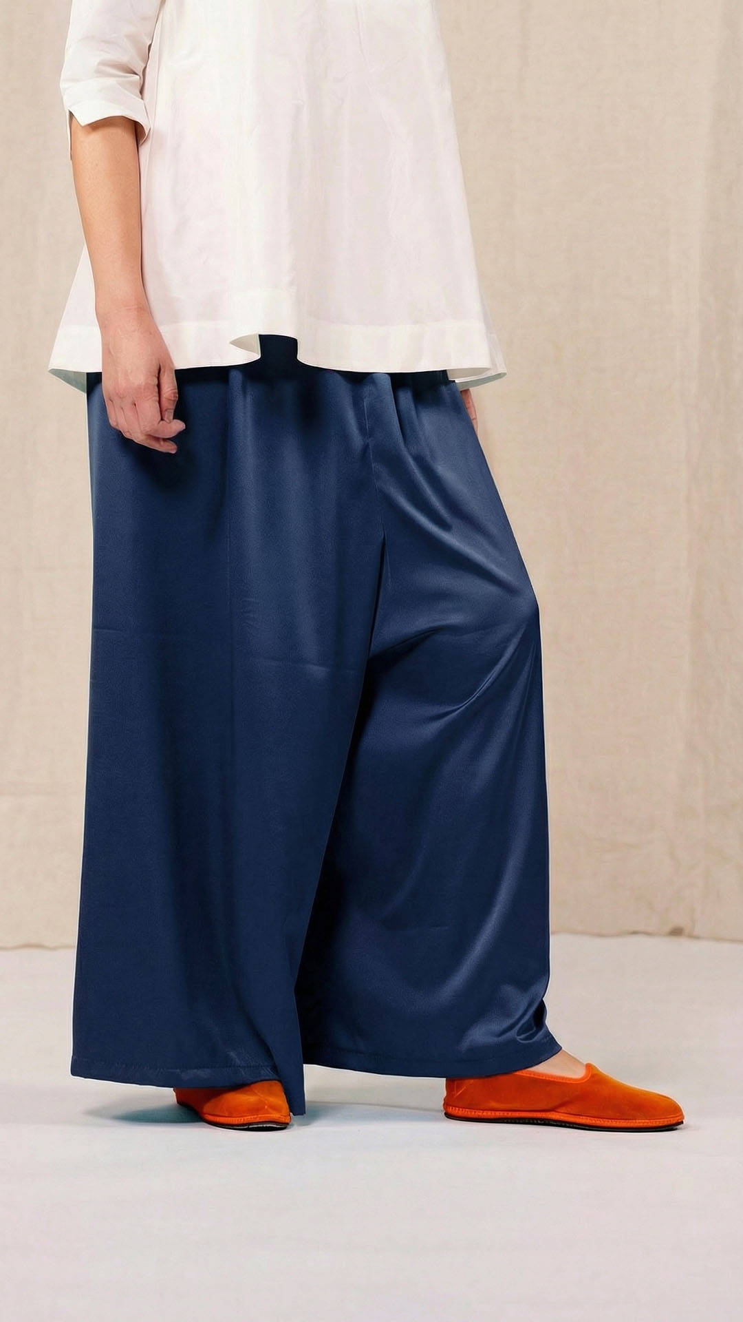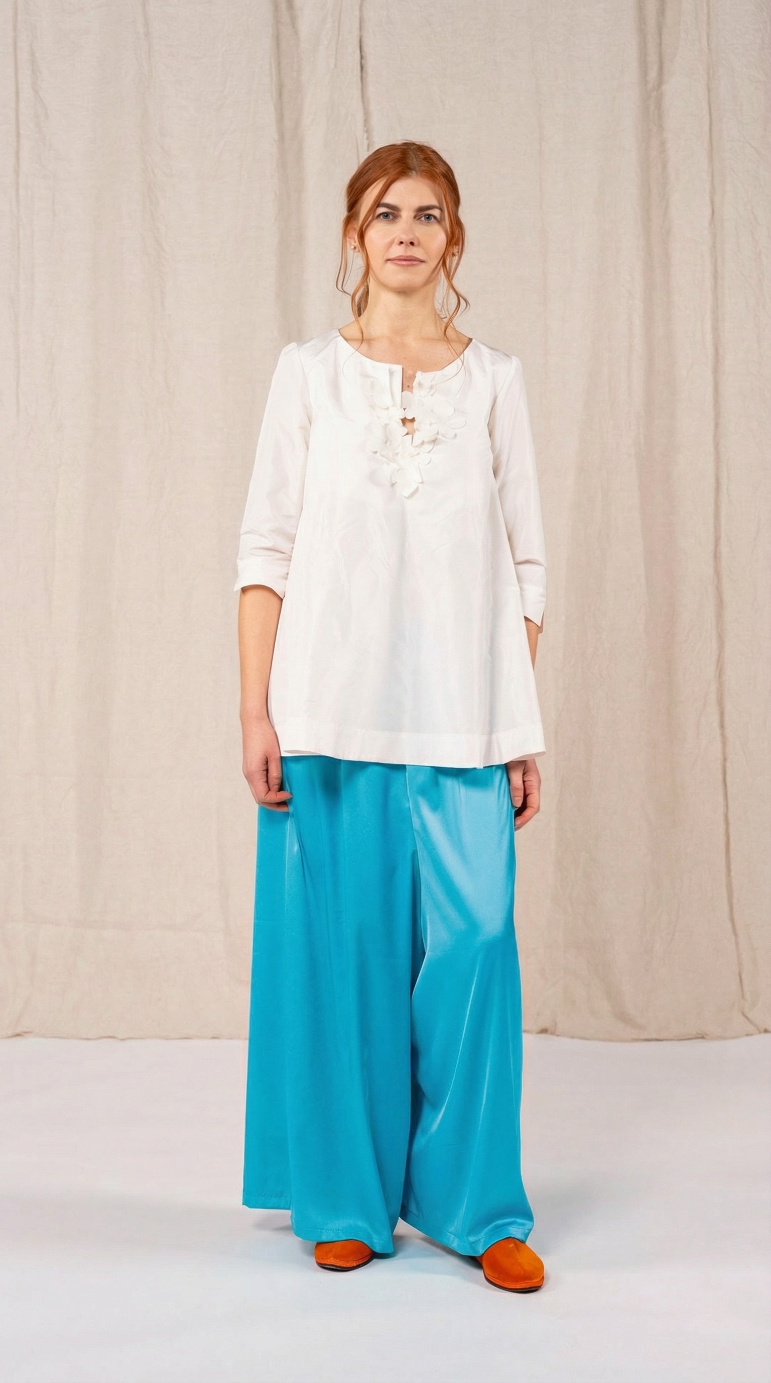 Pantalone con elastico in vita e cavallo basso, caratterizzato da un taglio asimmetrico delle gambe che ne accentua l’ampiezza, ricordando la leggerezza di una gonna pantalone. Capo versatile, adatto sia a interpretazioni più formali che ad abbinamenti più casual.