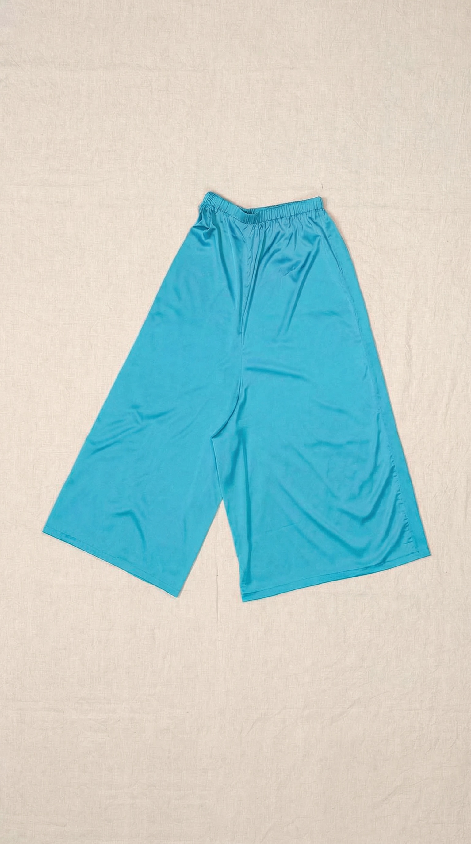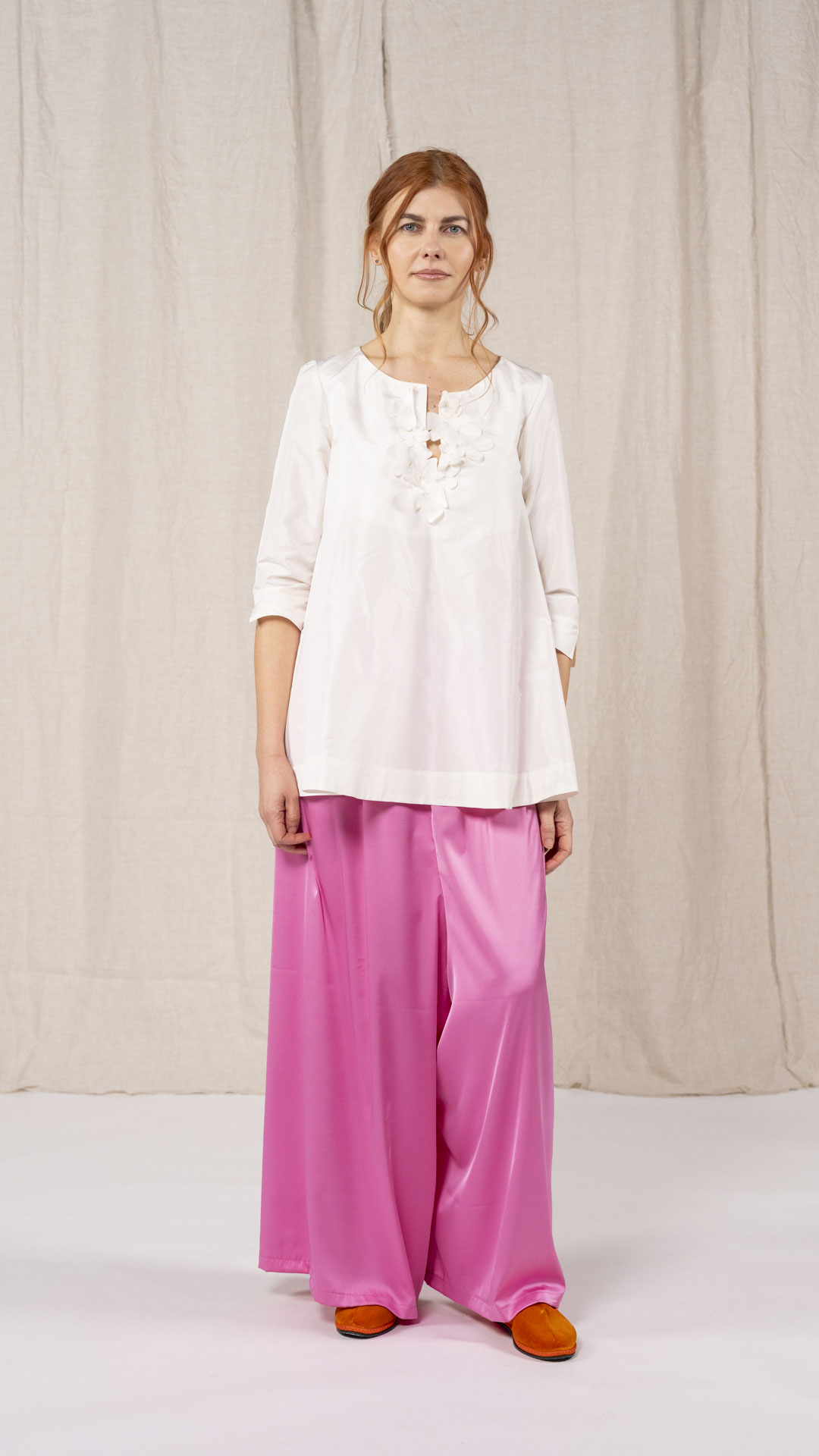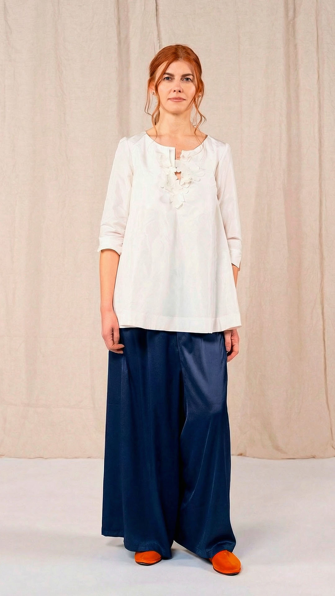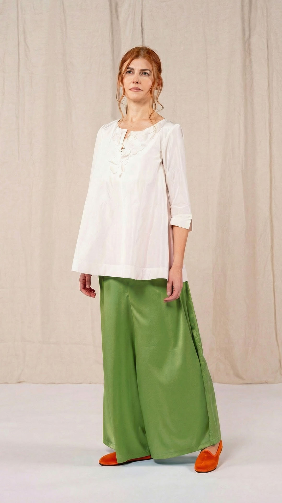 Pantalone con elastico in vita e cavallo basso, caratterizzato da un taglio asimmetrico delle gambe che ne accentua l’ampiezza, ricordando la leggerezza di una gonna pantalone. Capo versatile, adatto sia a interpretazioni più formali che ad abbinamenti più casual.