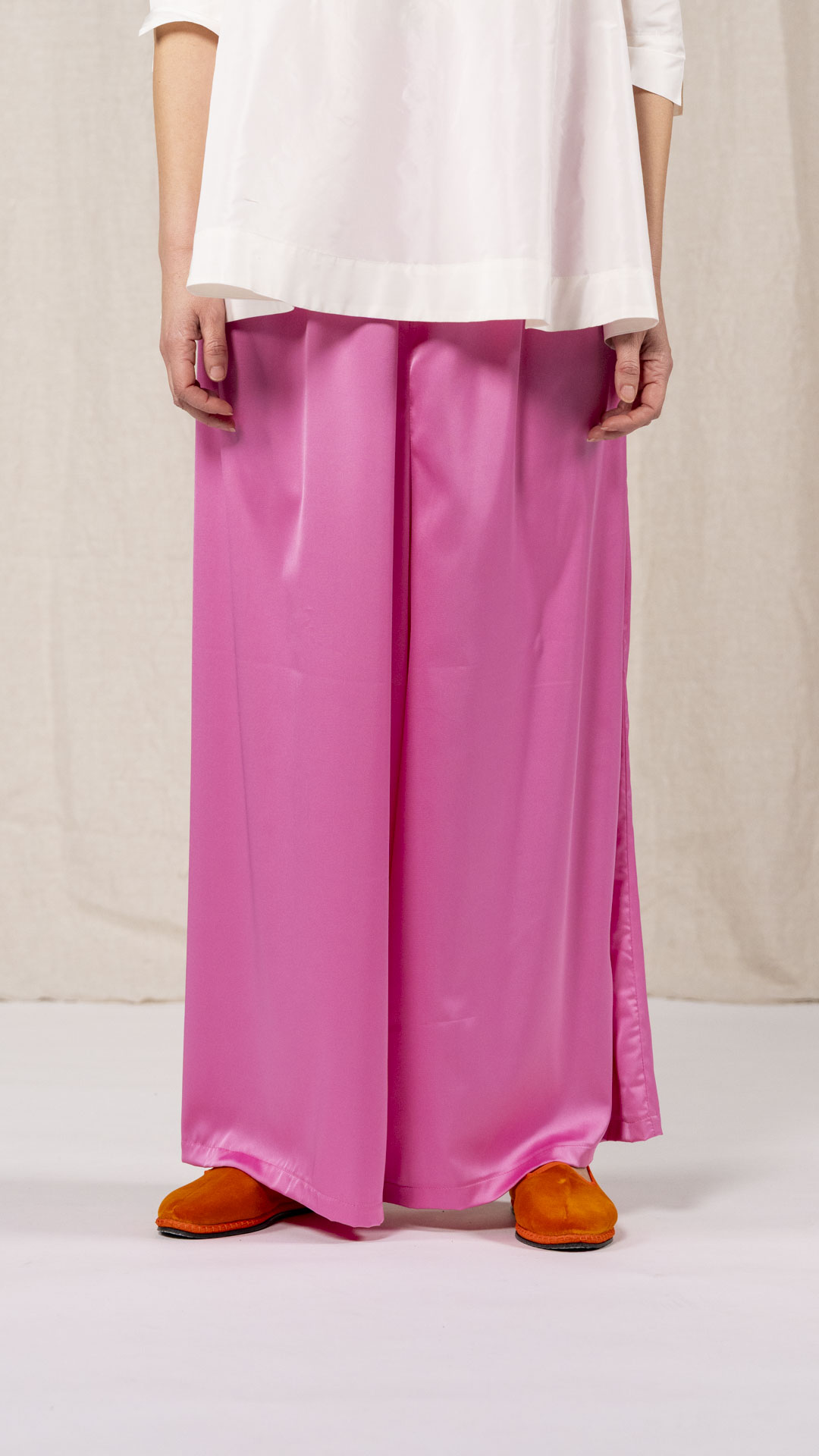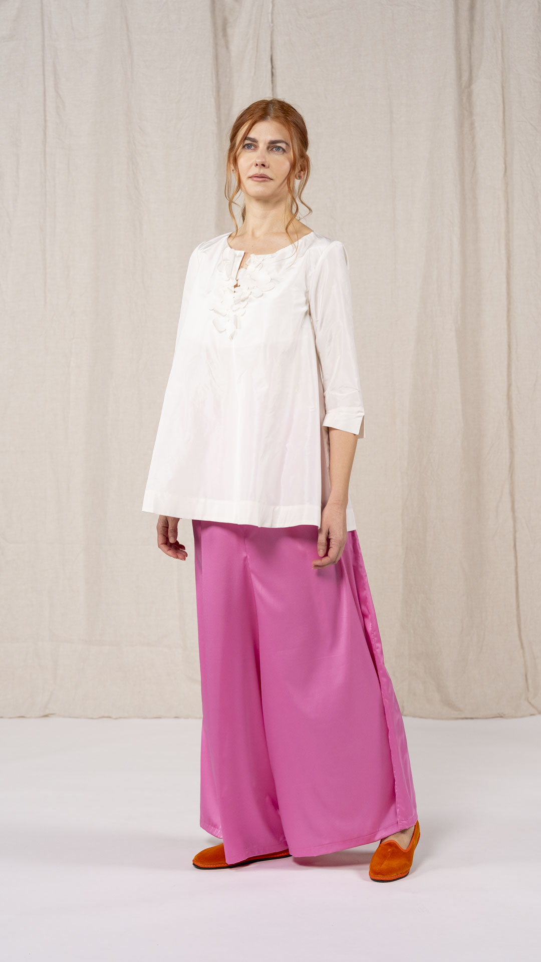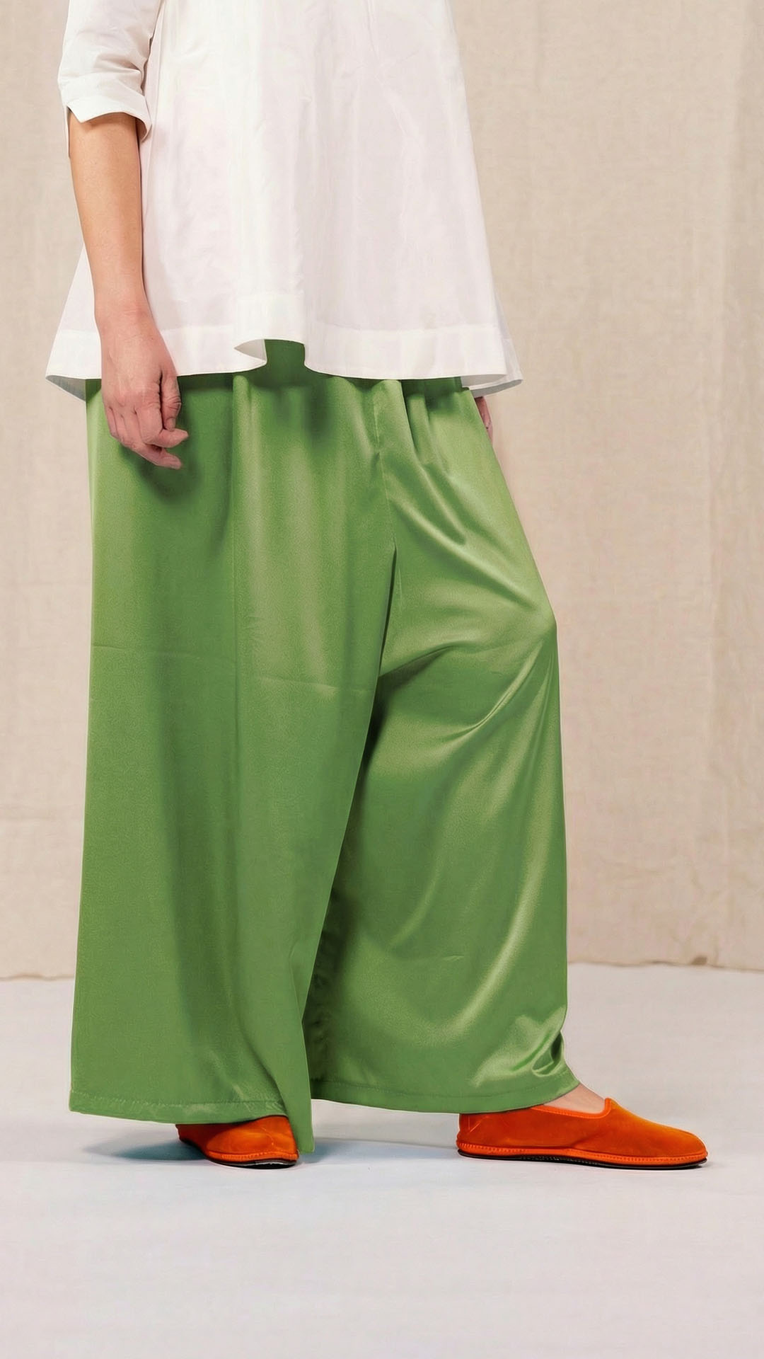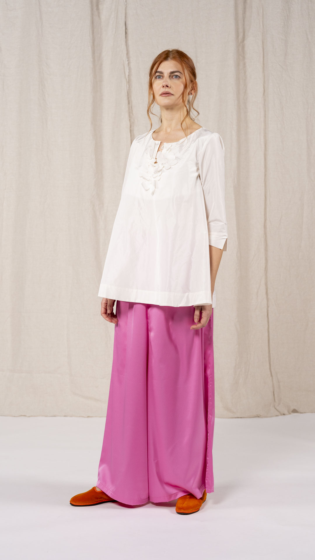 Pantalone con elastico in vita e cavallo basso, caratterizzato da un taglio asimmetrico delle gambe che ne accentua l’ampiezza, ricordando la leggerezza di una gonna pantalone. Capo versatile, adatto sia a interpretazioni più formali che ad abbinamenti più casual.