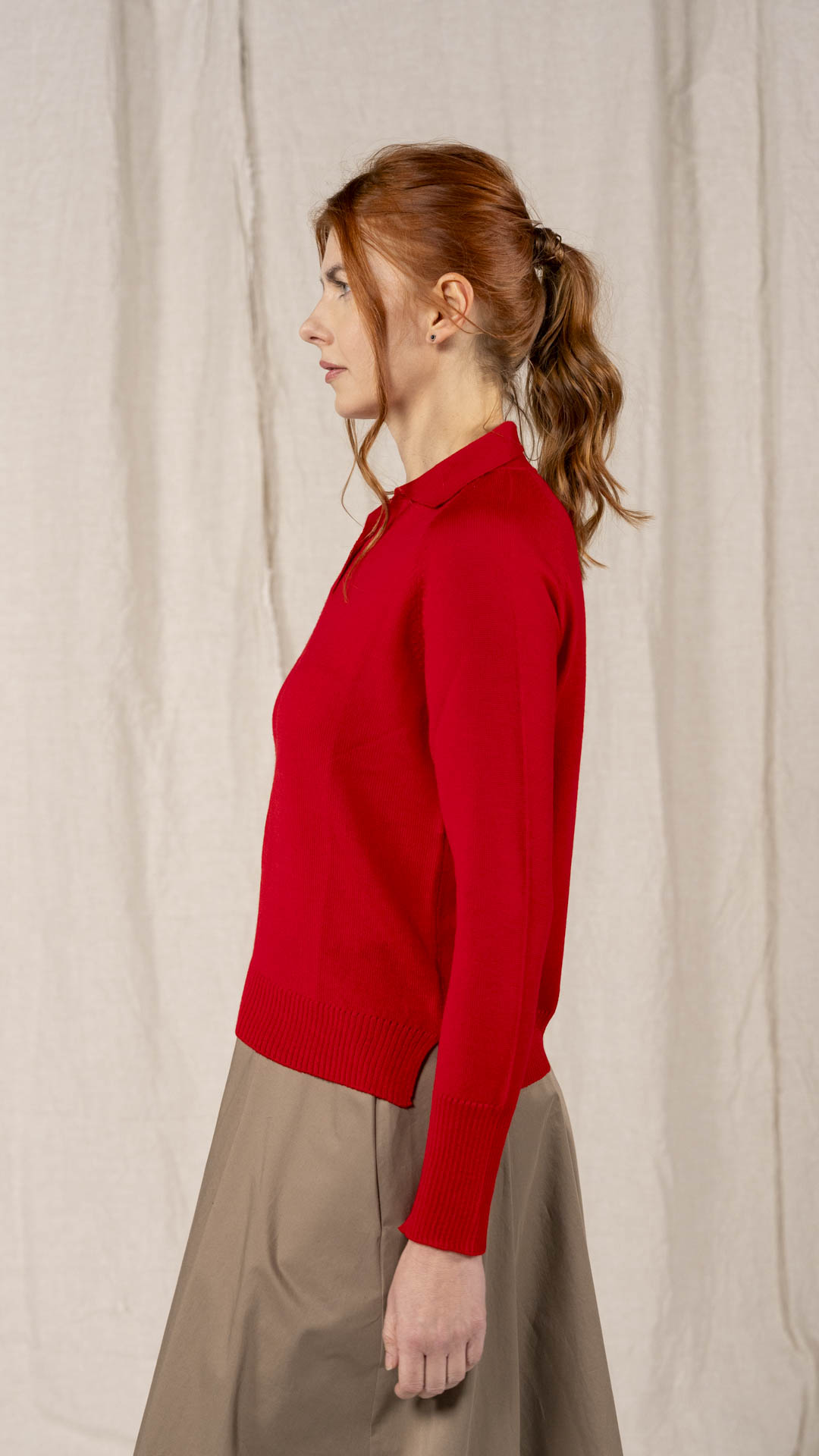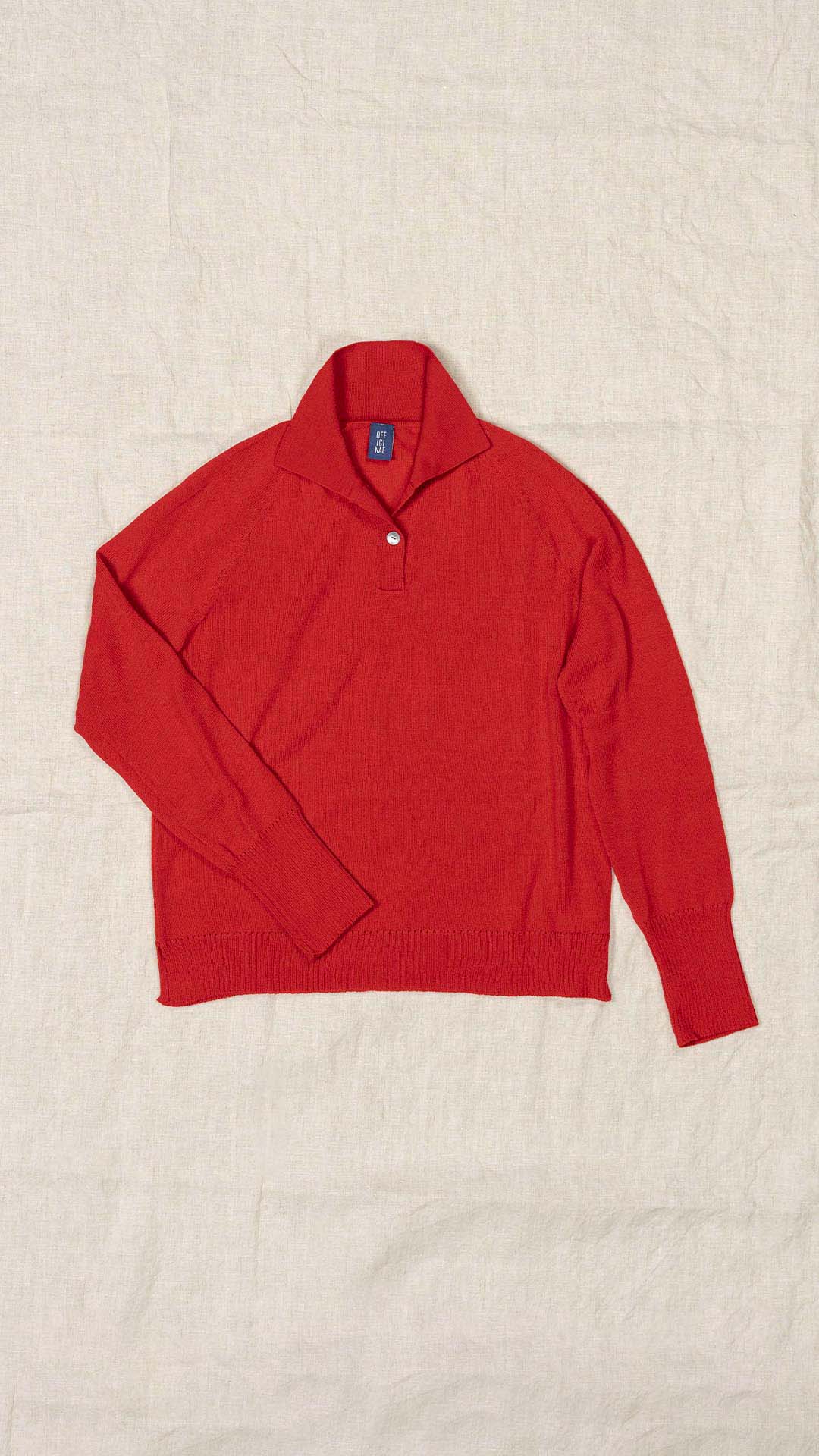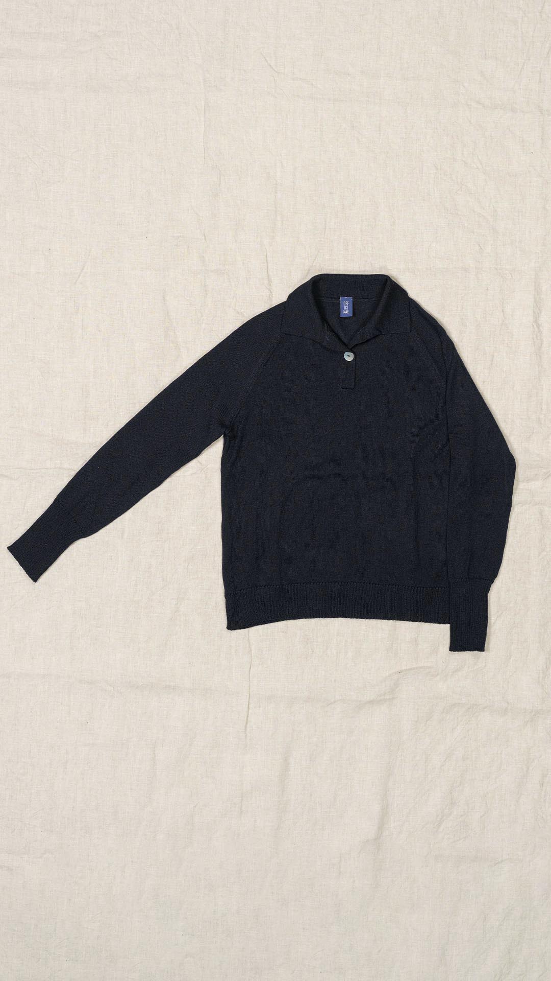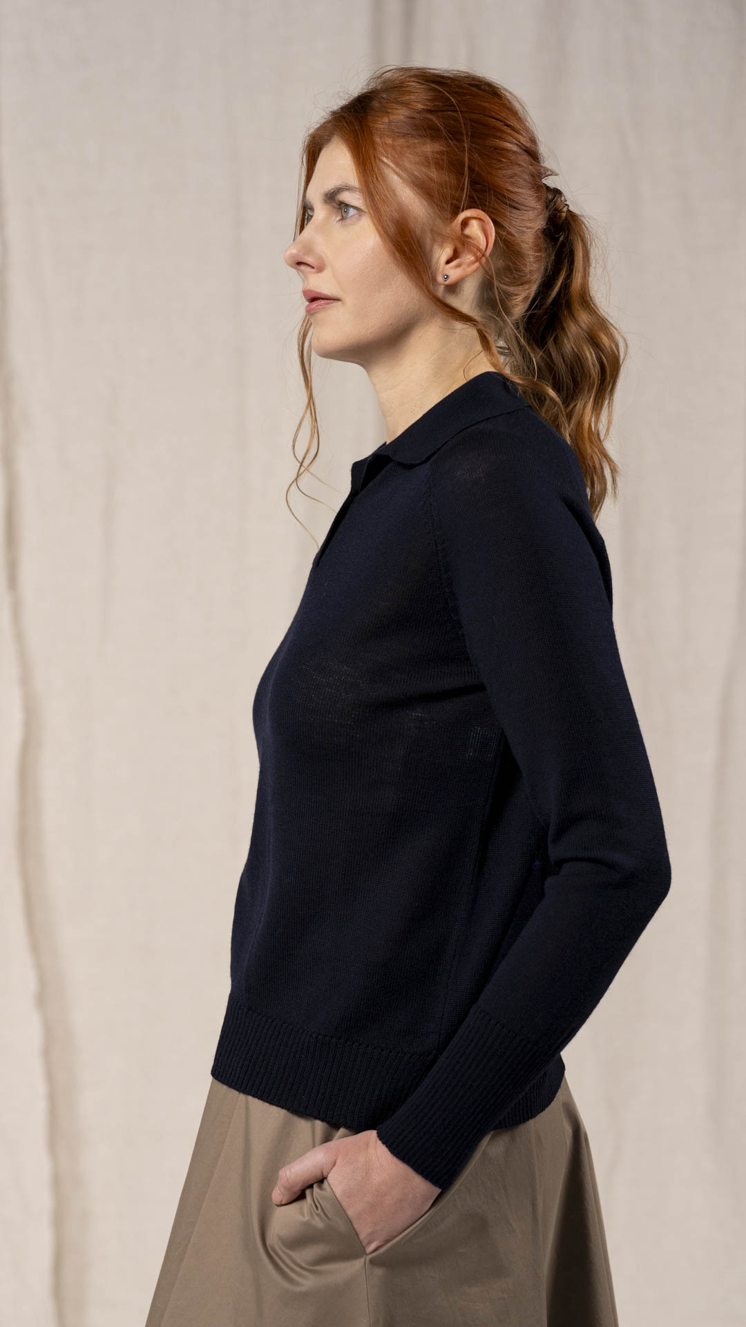 Polo in lana merino sottile, dalla forma classica. Il capo presenta piccoli spacchi laterali, manica raglan e un piccolo collo chiuso da un singolo bottone in madreperla. Un modello versatile, da interpretare anche in abbinamento ai pantaloni Spillo o Ombra.