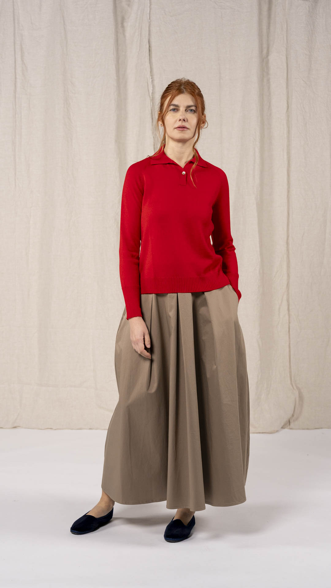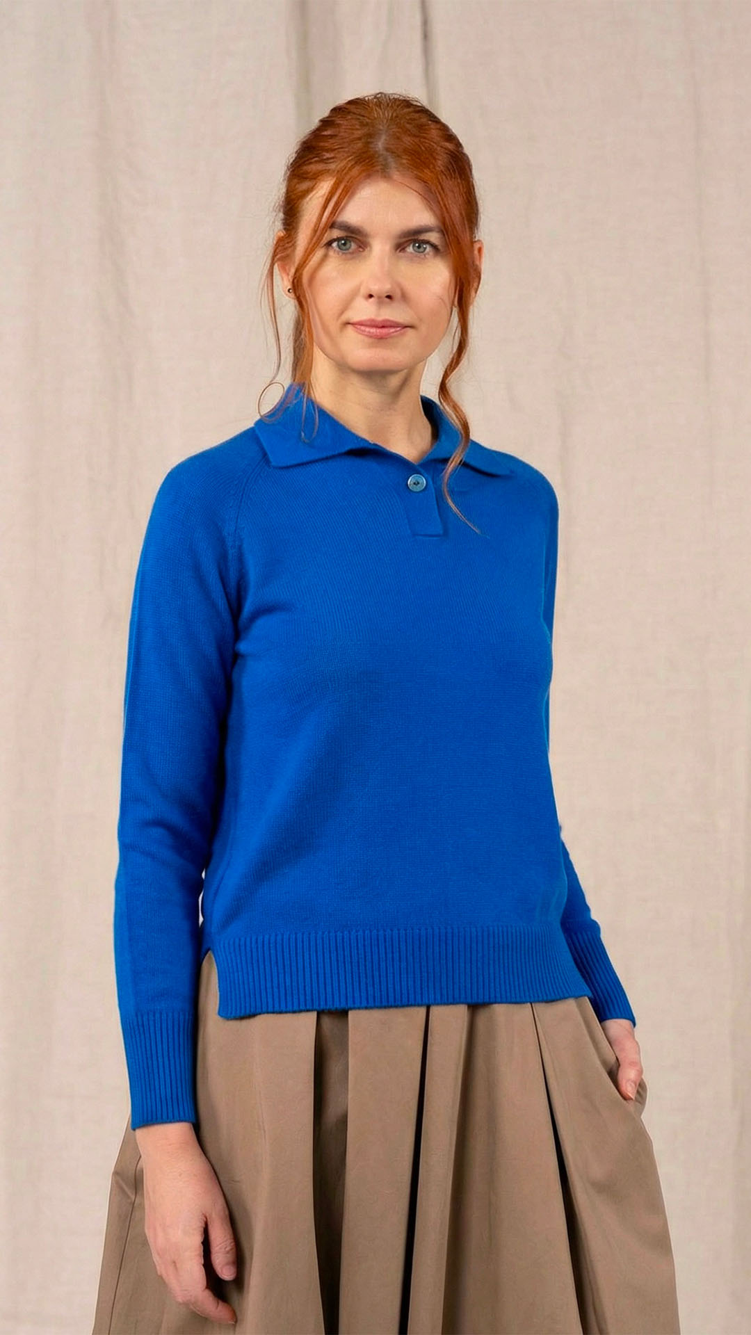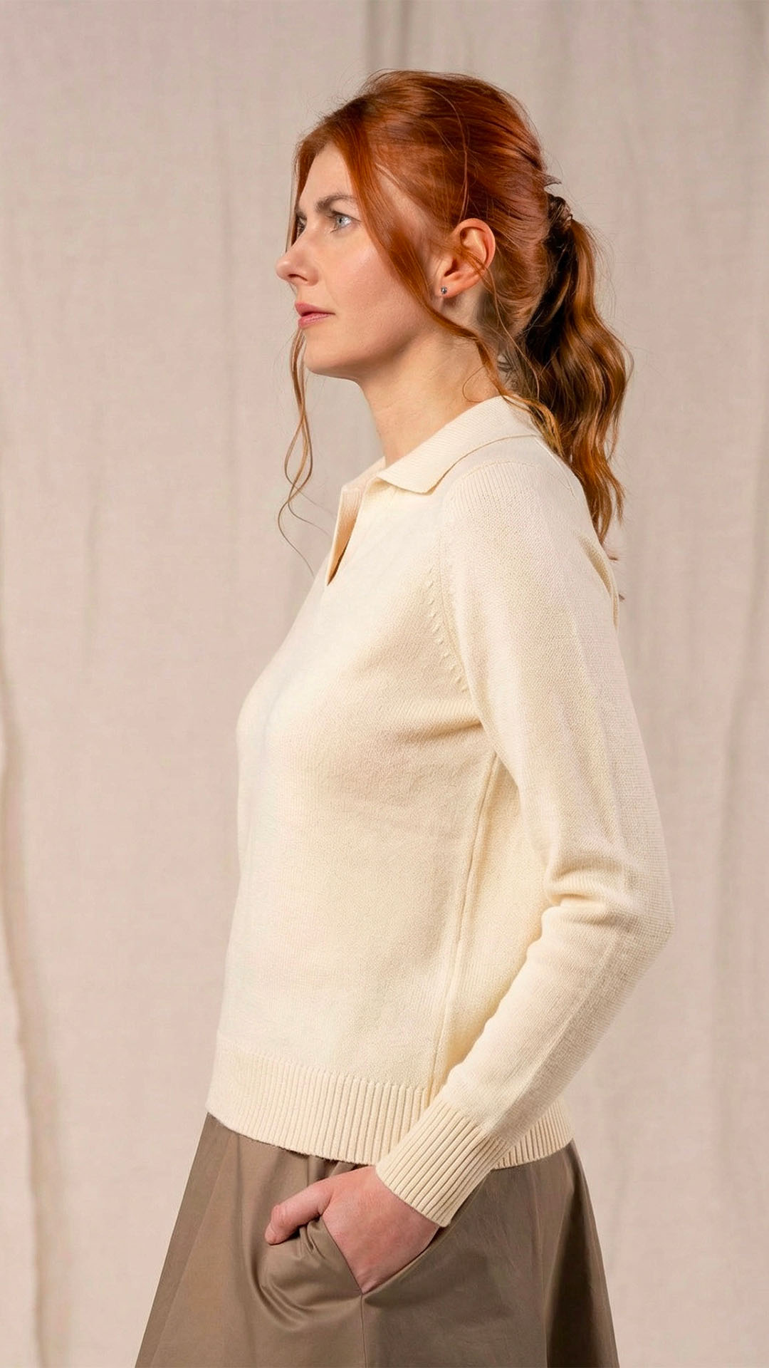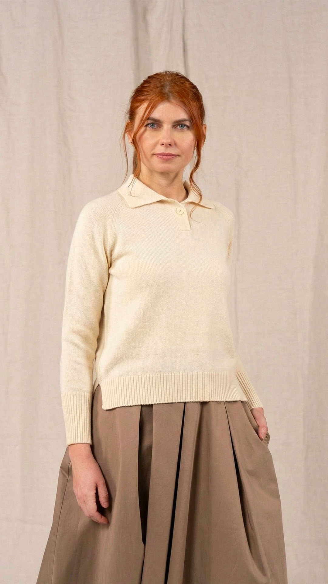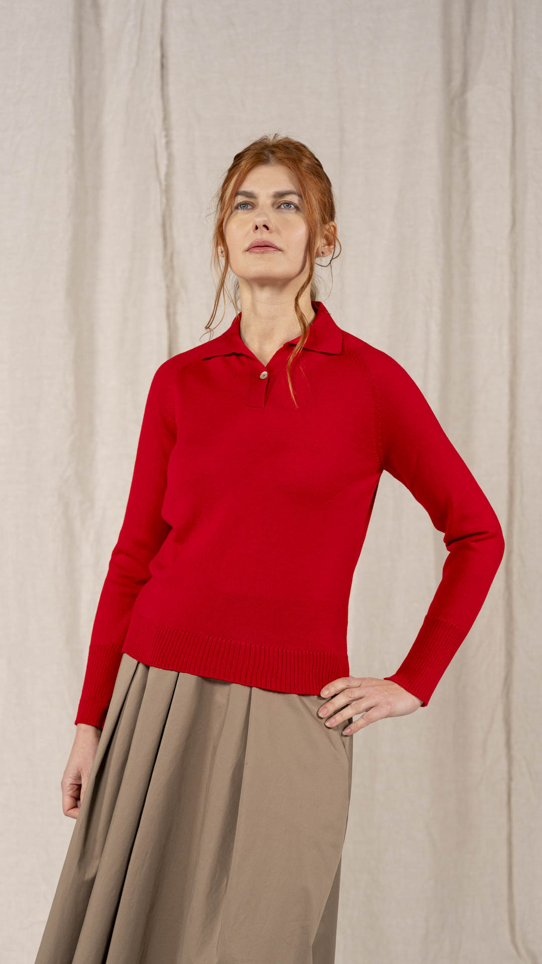 Polo in lana merino sottile, dalla forma classica. Il capo presenta piccoli spacchi laterali, manica raglan e un piccolo collo chiuso da un singolo bottone in madreperla. Un modello versatile, da interpretare anche in abbinamento ai pantaloni Spillo o Ombra.