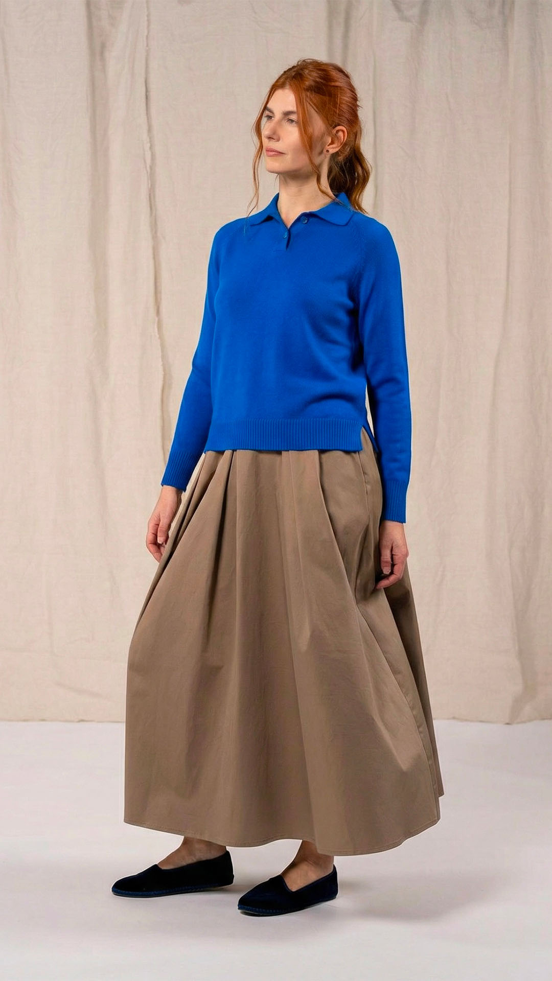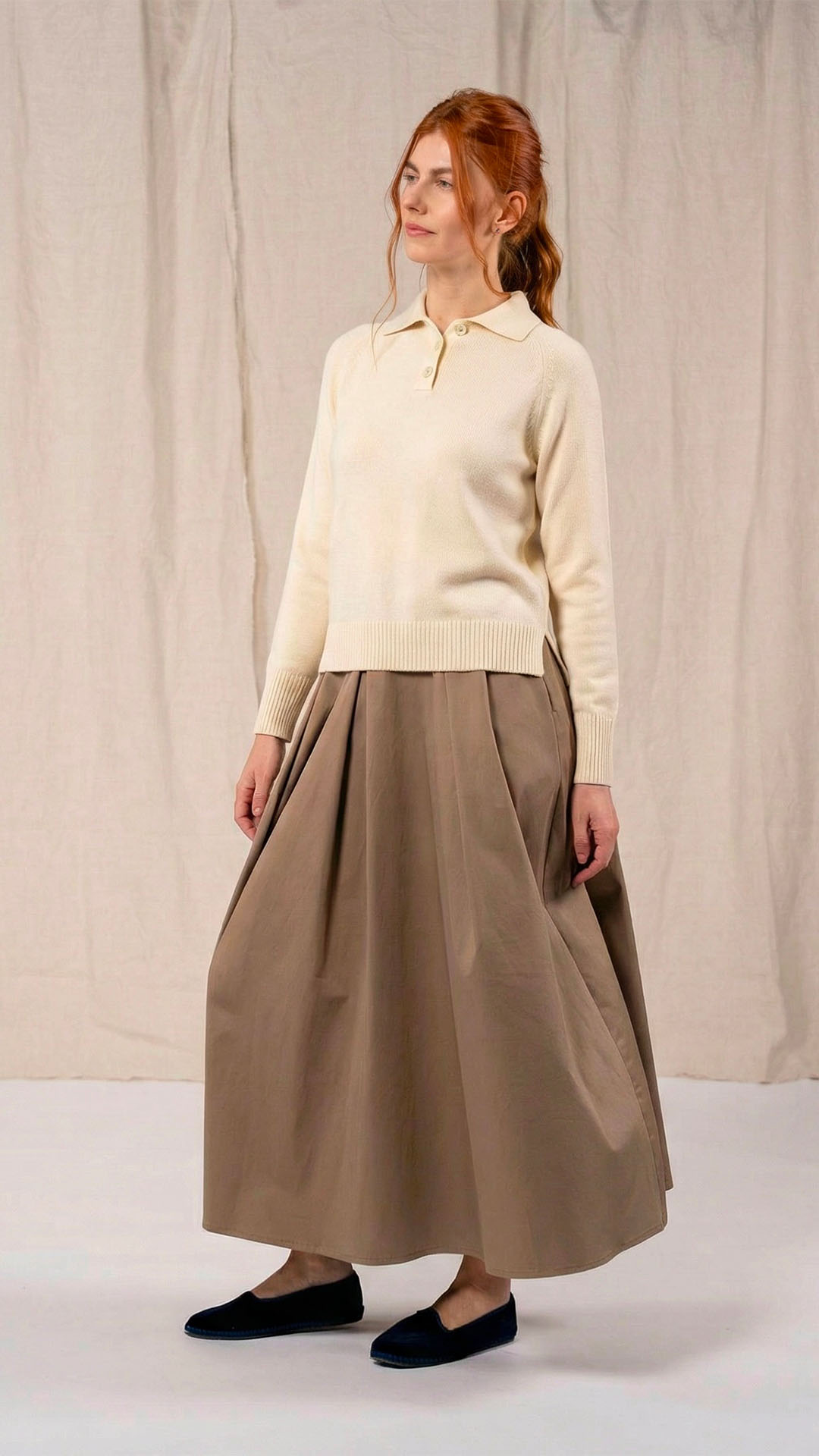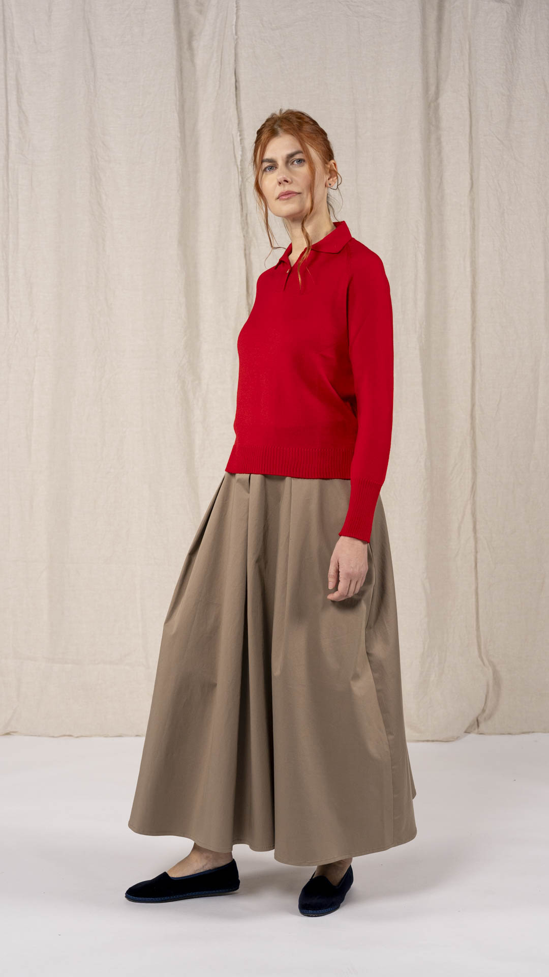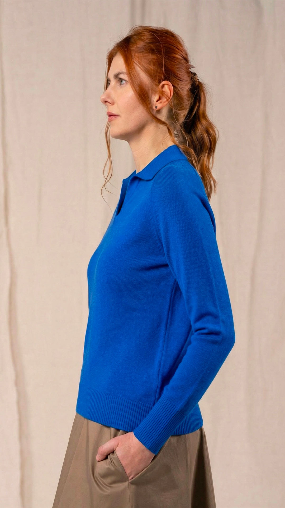 Polo in lana merino sottile, dalla forma classica. Il capo presenta piccoli spacchi laterali, manica raglan e un piccolo collo chiuso da un singolo bottone in madreperla. Un modello versatile, da interpretare anche in abbinamento ai pantaloni Spillo o Ombra.