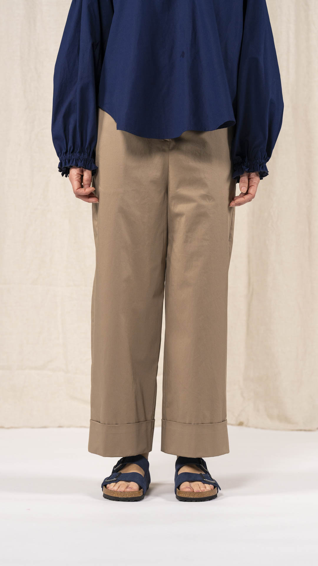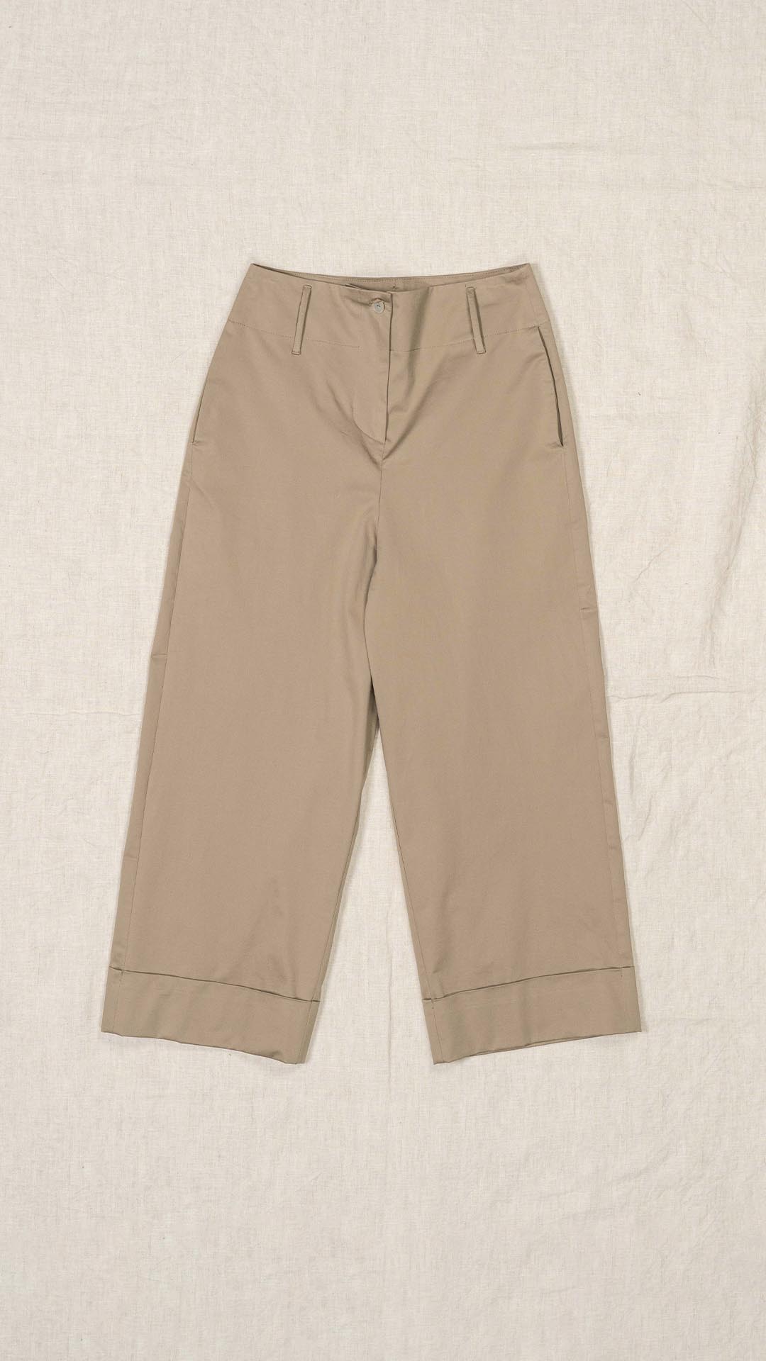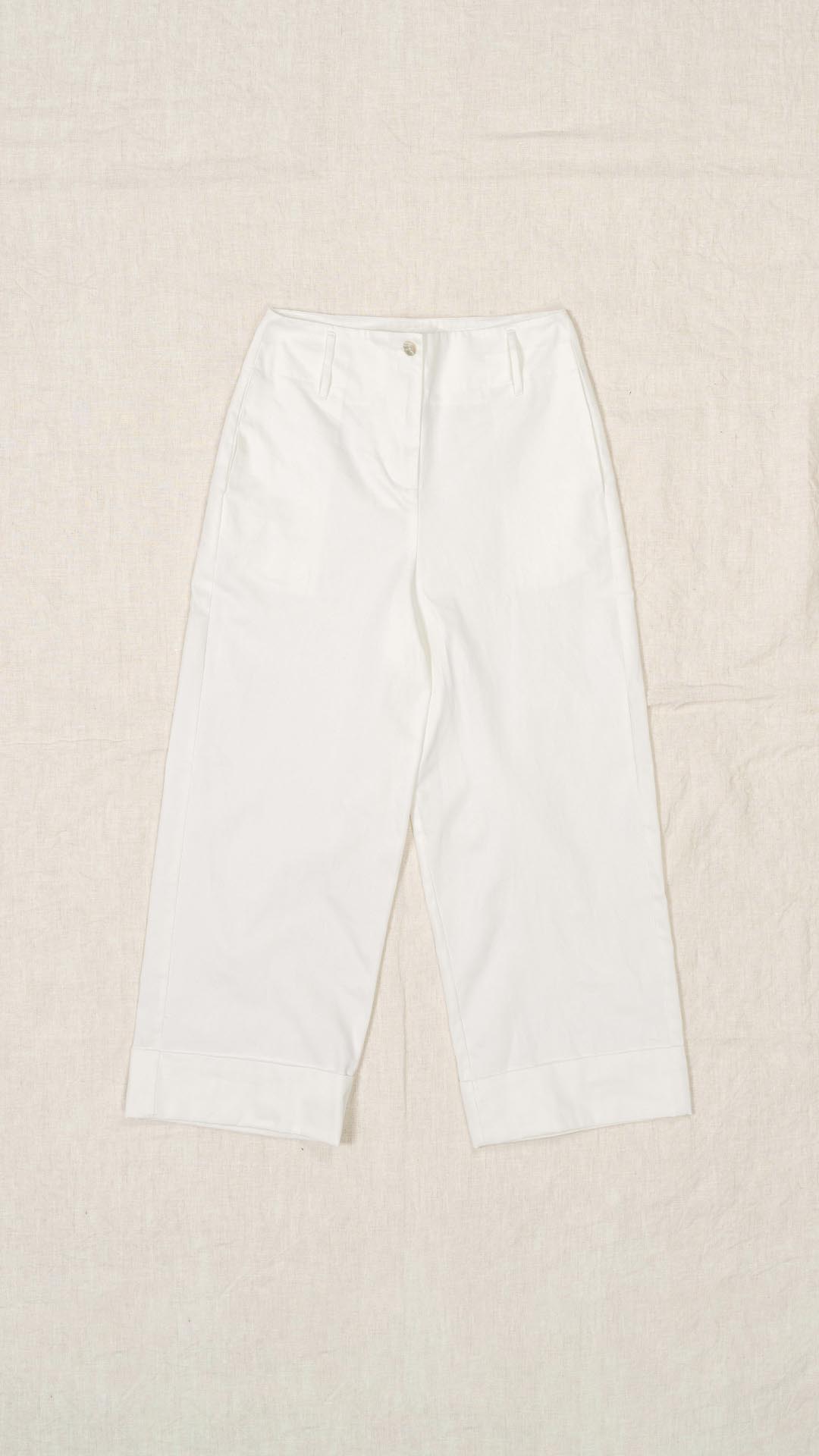 Pantalone dalla linea dritta, con risvolto sul fondo e tasche laterali. Chiusura frontale con cerniera e bottone, fascia in vita leggermente alta con passanti per la cintura.
