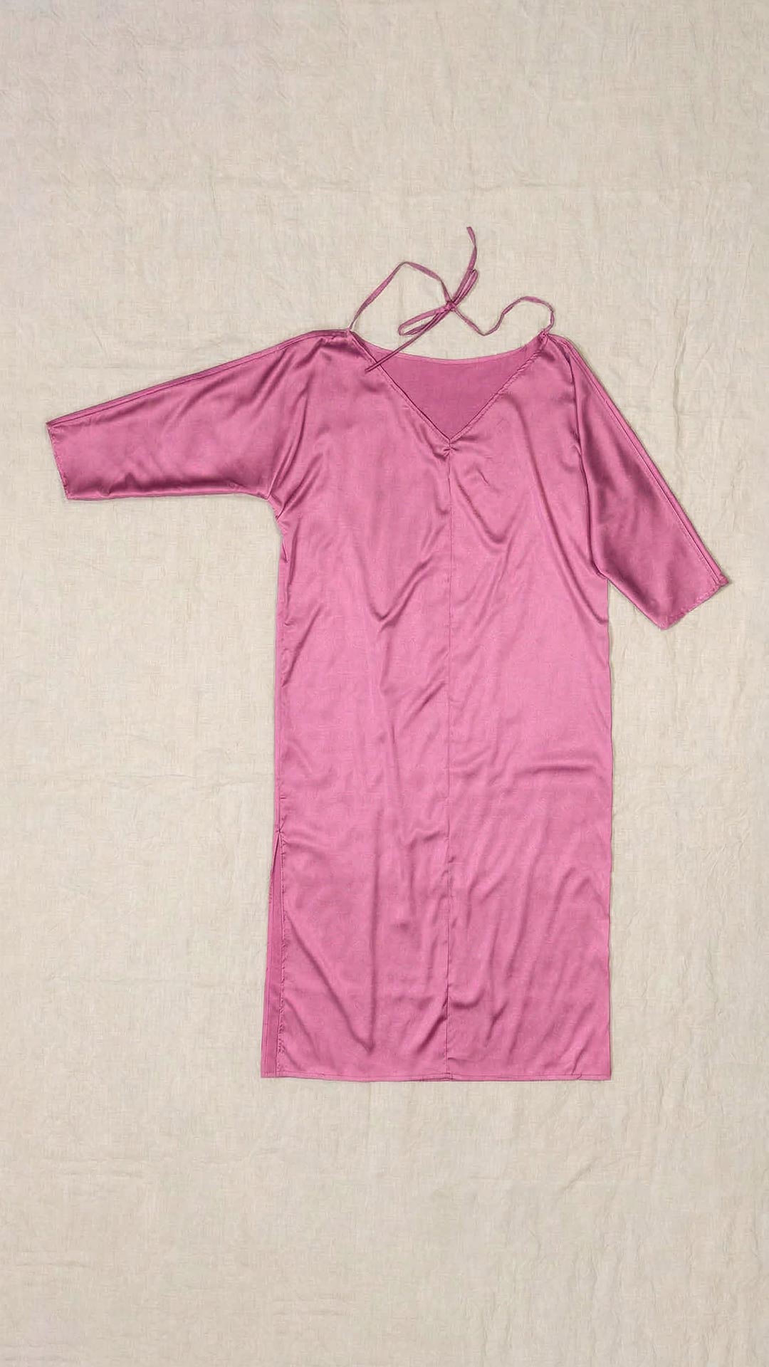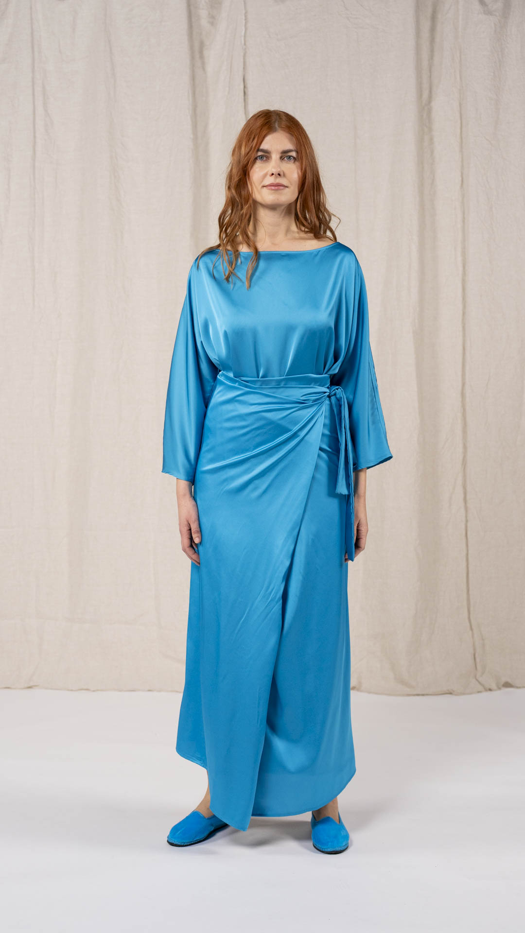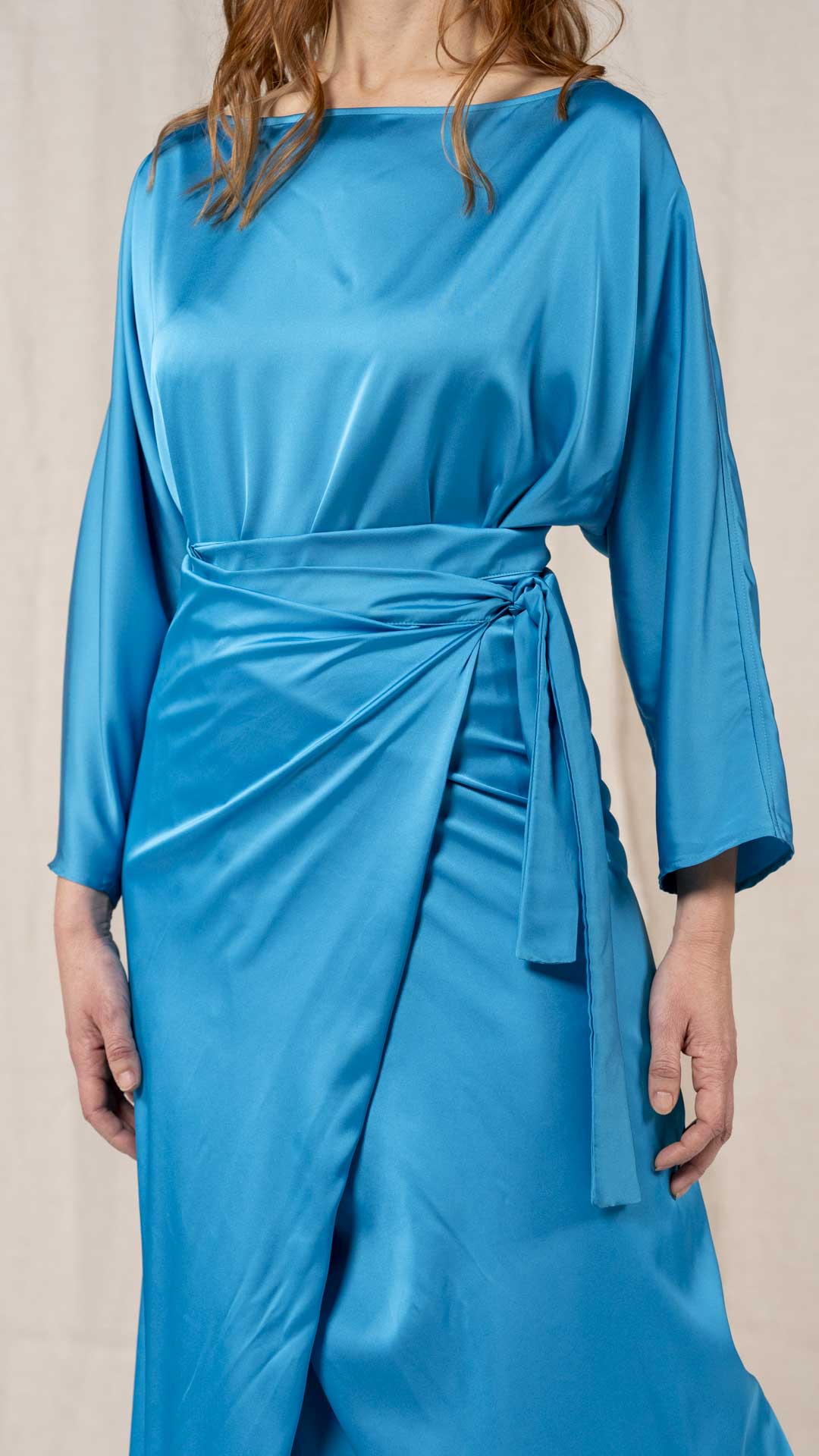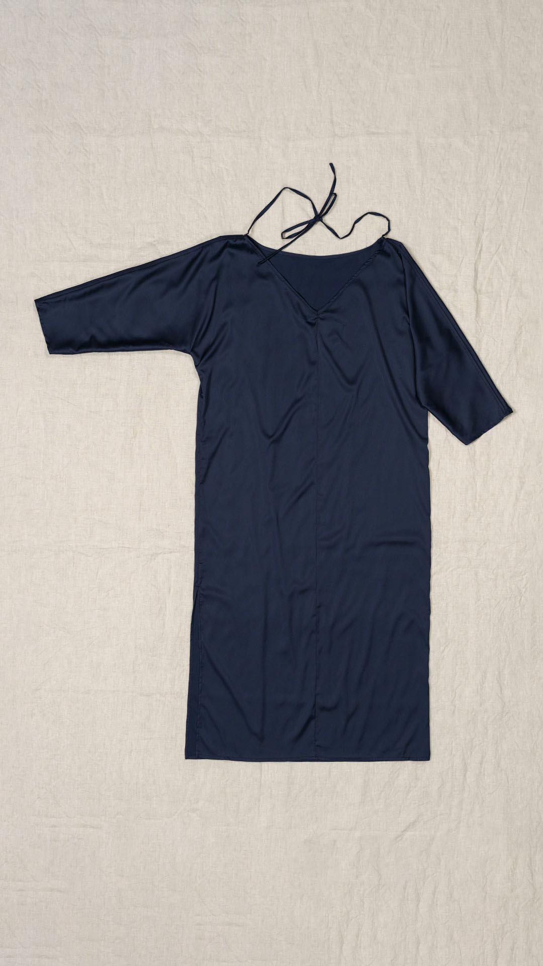 Abito composto da due pezzi distinti: una tunica con manica intera, scollatura asimmetrica, da un lato a V e dall’altro a barca, e uno stringhino in tessuto che può essere annodato al collo. Il capo presenta uno spacco laterale profondo. Un modello dalla forte versatilità e carattere, da interpretare anche in abbinamento alla gonna Palla.
