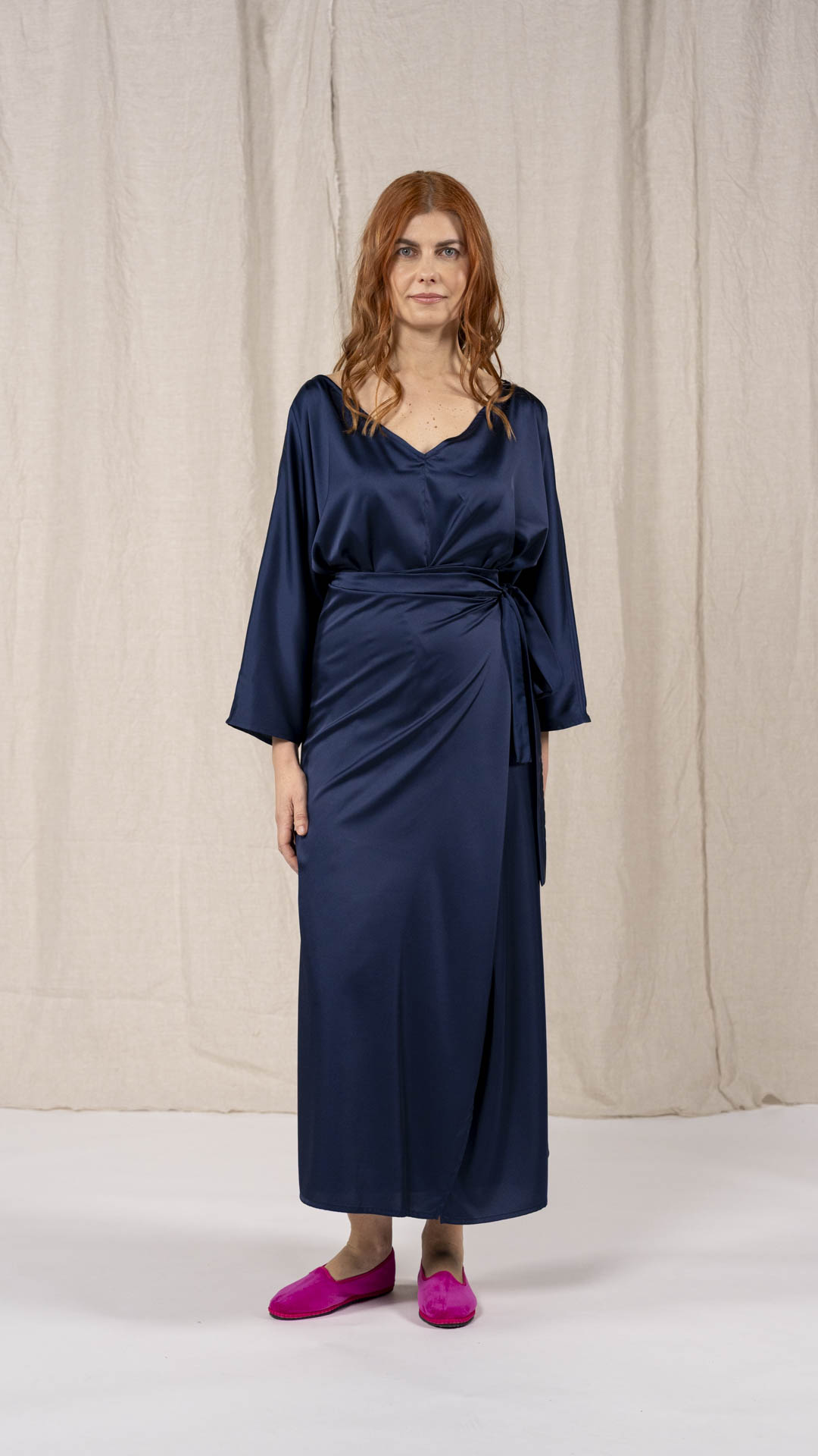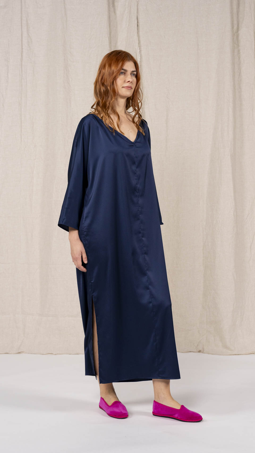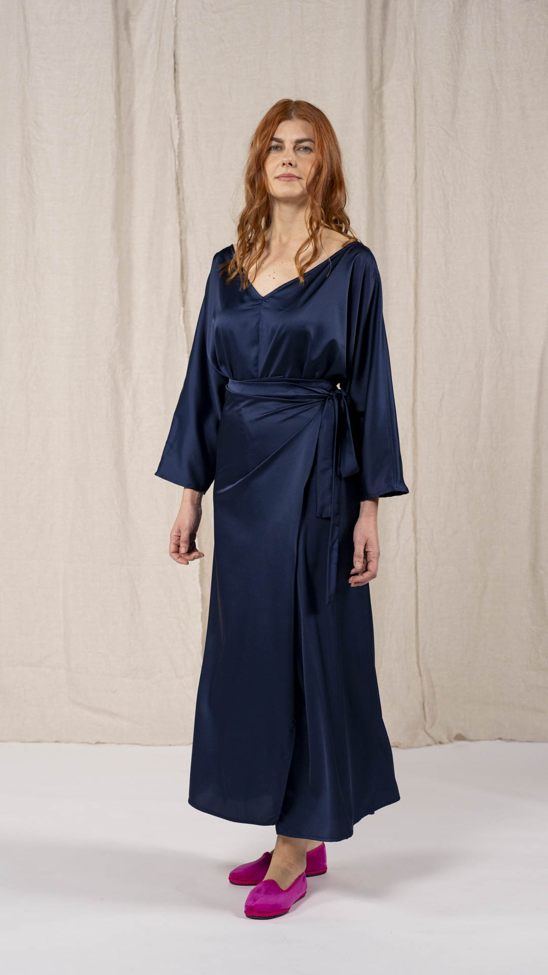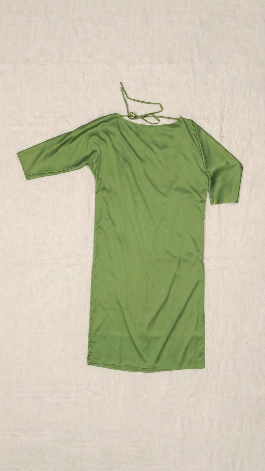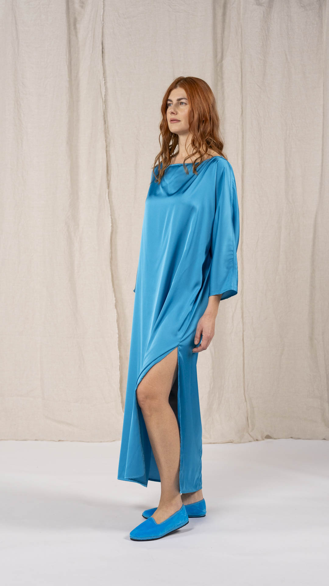 Abito composto da due pezzi distinti: una tunica con manica intera, scollatura asimmetrica, da un lato a V e dall’altro a barca, e uno stringhino in tessuto che può essere annodato al collo. Il capo presenta uno spacco laterale profondo. Un modello dalla forte versatilità e carattere, da interpretare anche in abbinamento alla gonna Palla.