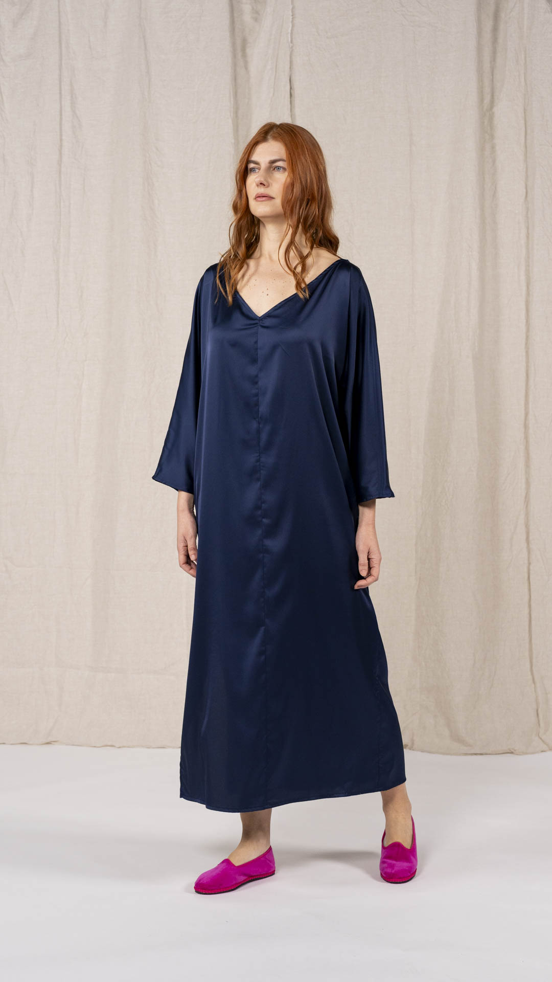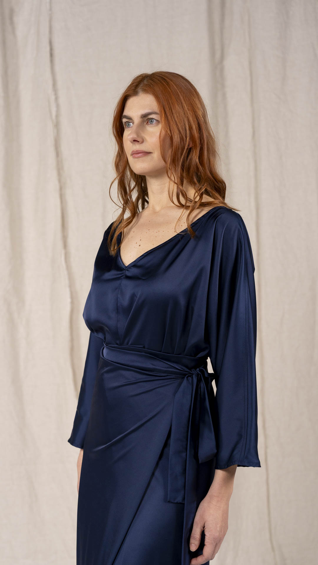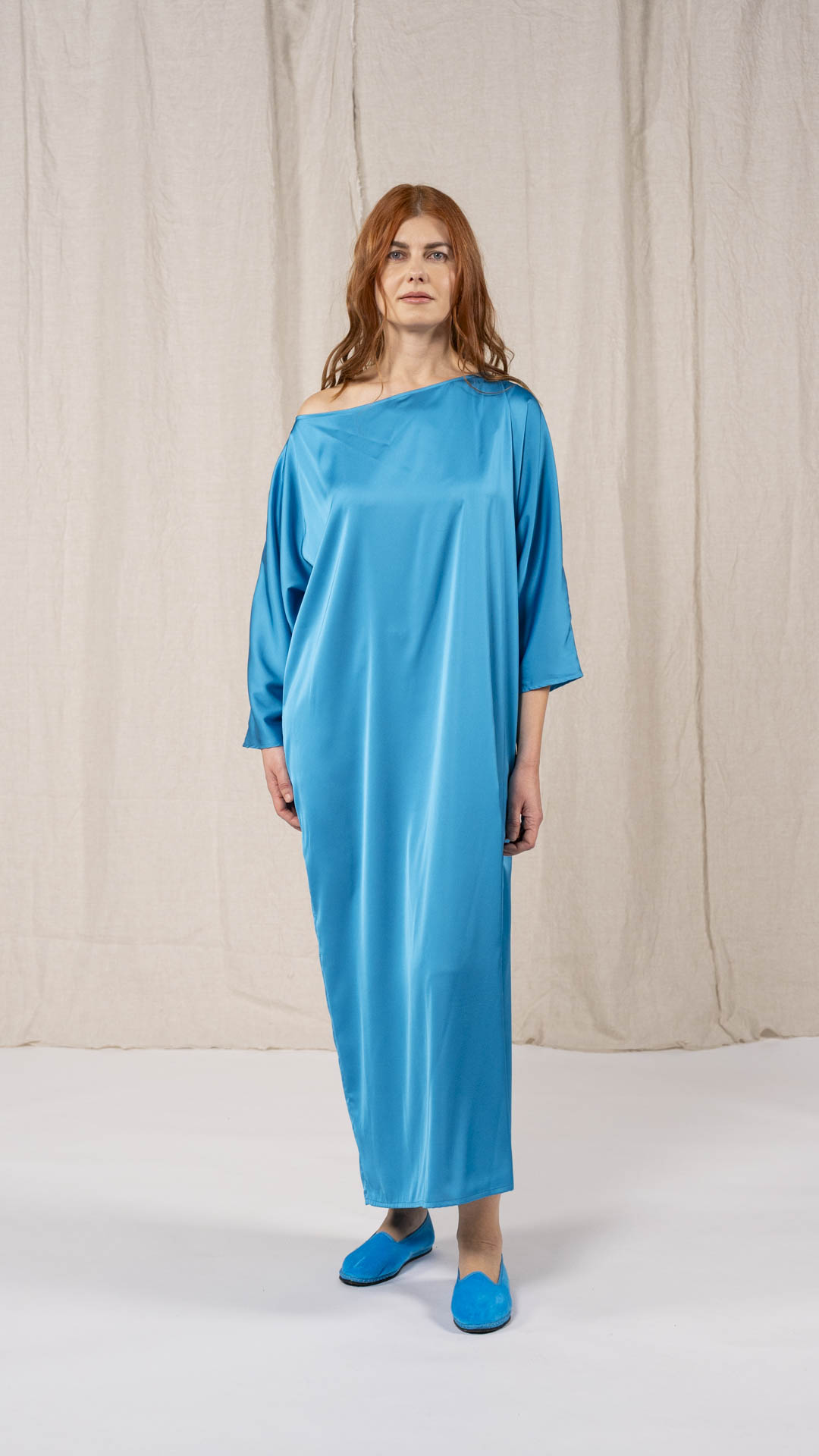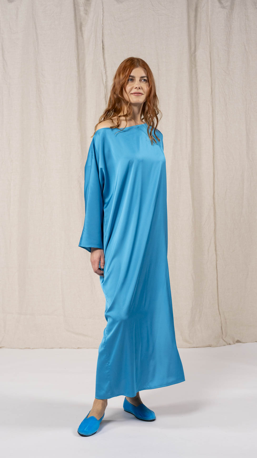 Abito composto da due pezzi distinti: una tunica con manica intera, scollatura asimmetrica, da un lato a V e dall’altro a barca, e uno stringhino in tessuto che può essere annodato al collo. Il capo presenta uno spacco laterale profondo. Un modello dalla forte versatilità e carattere, da interpretare anche in abbinamento alla gonna Palla.