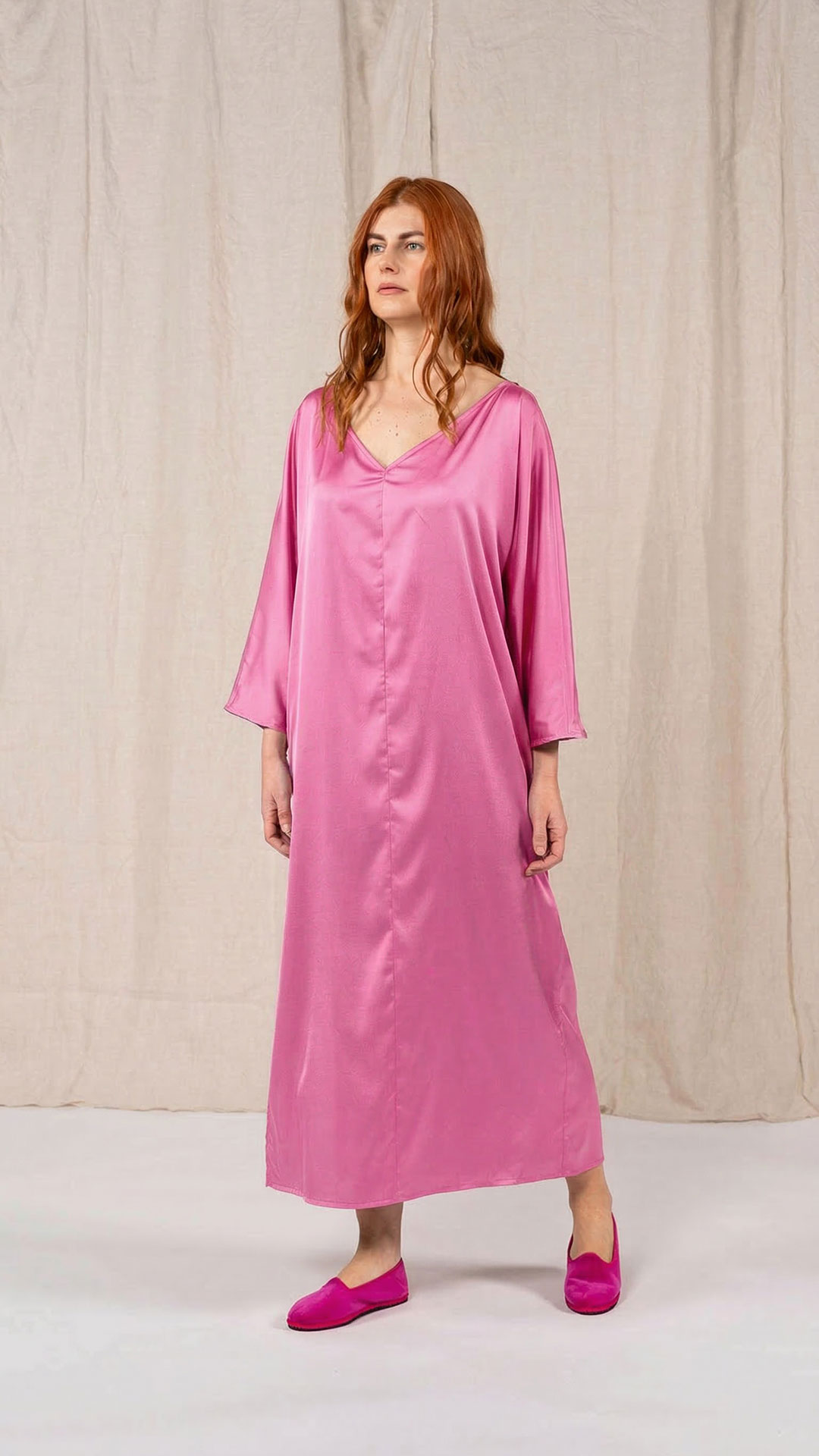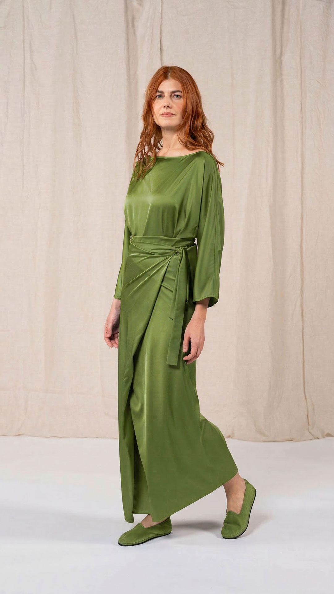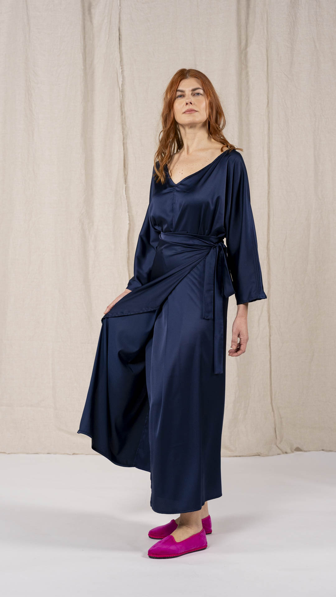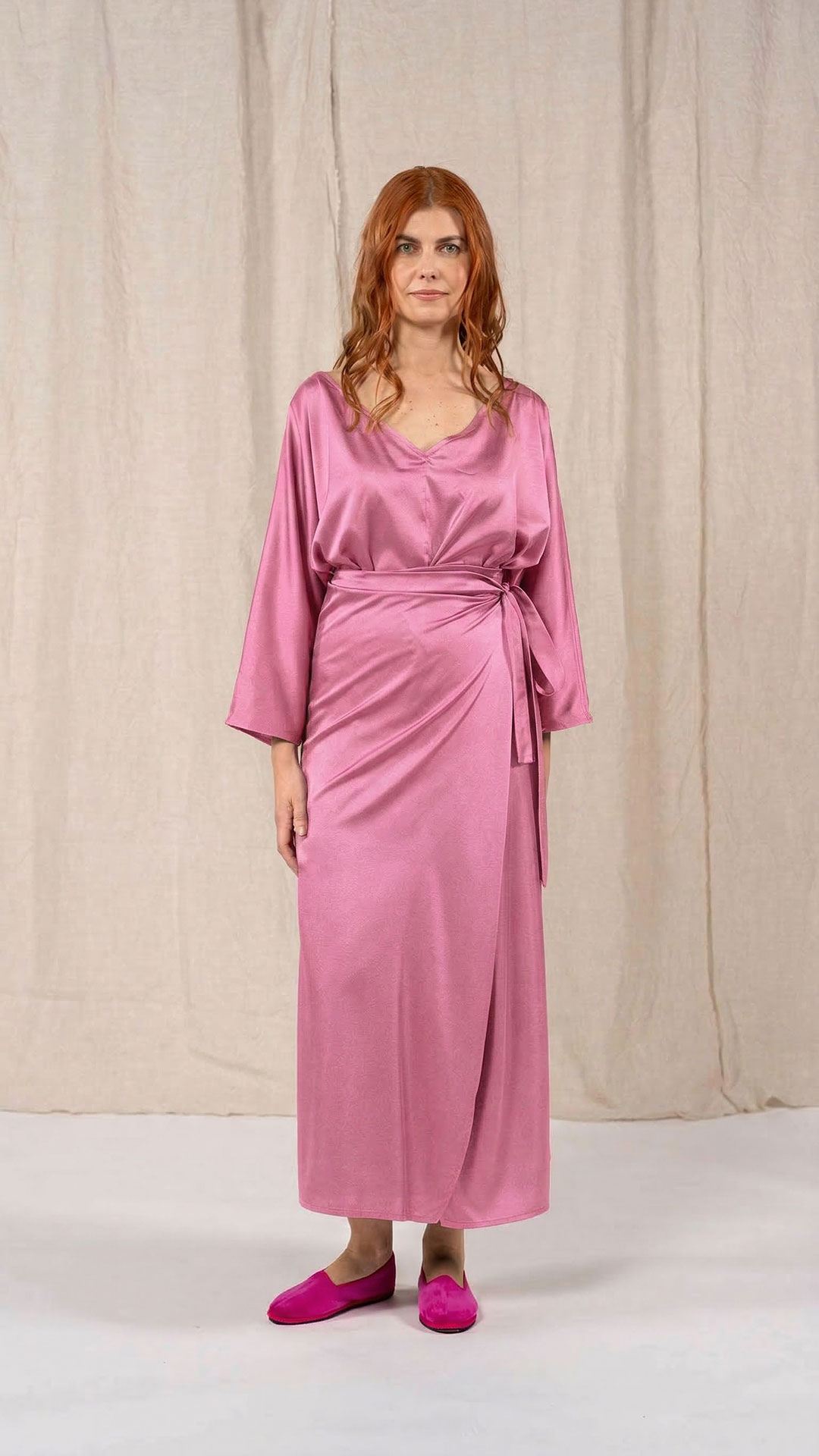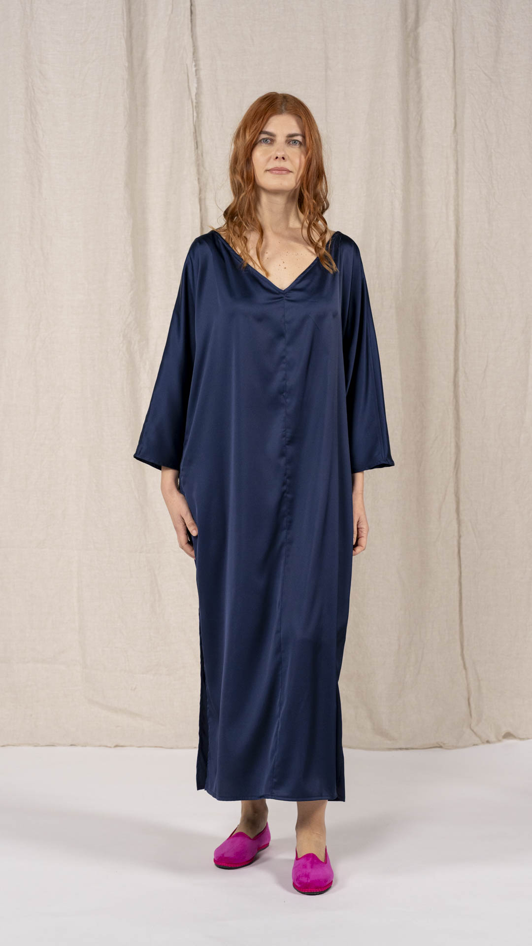 Abito composto da due pezzi distinti: una tunica con manica intera, scollatura asimmetrica, da un lato a V e dall’altro a barca, e uno stringhino in tessuto che può essere annodato al collo. Il capo presenta uno spacco laterale profondo. Un modello dalla forte versatilità e carattere, da interpretare anche in abbinamento alla gonna Palla.