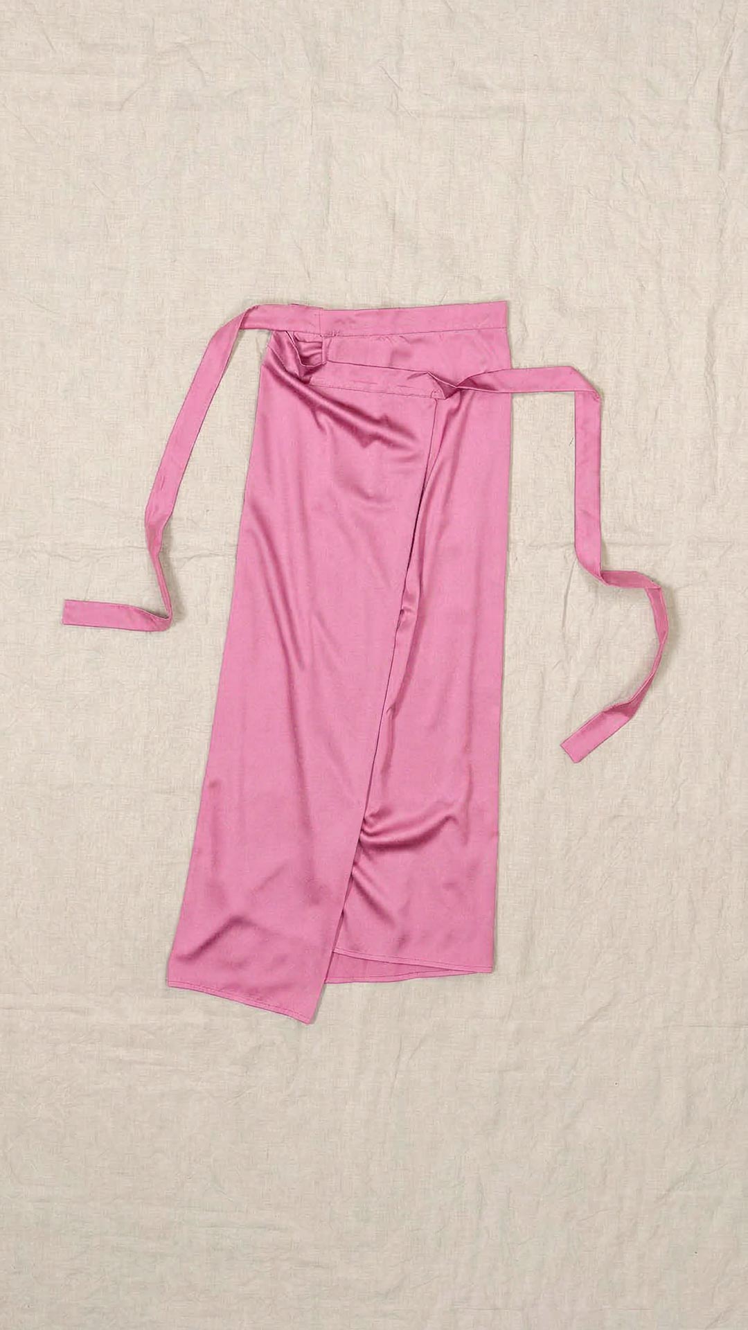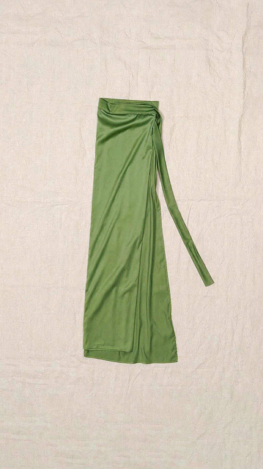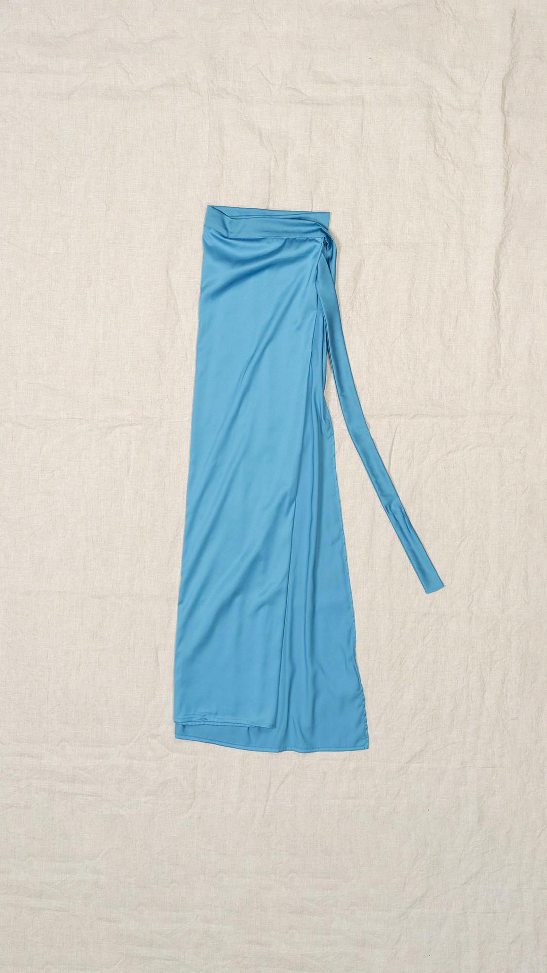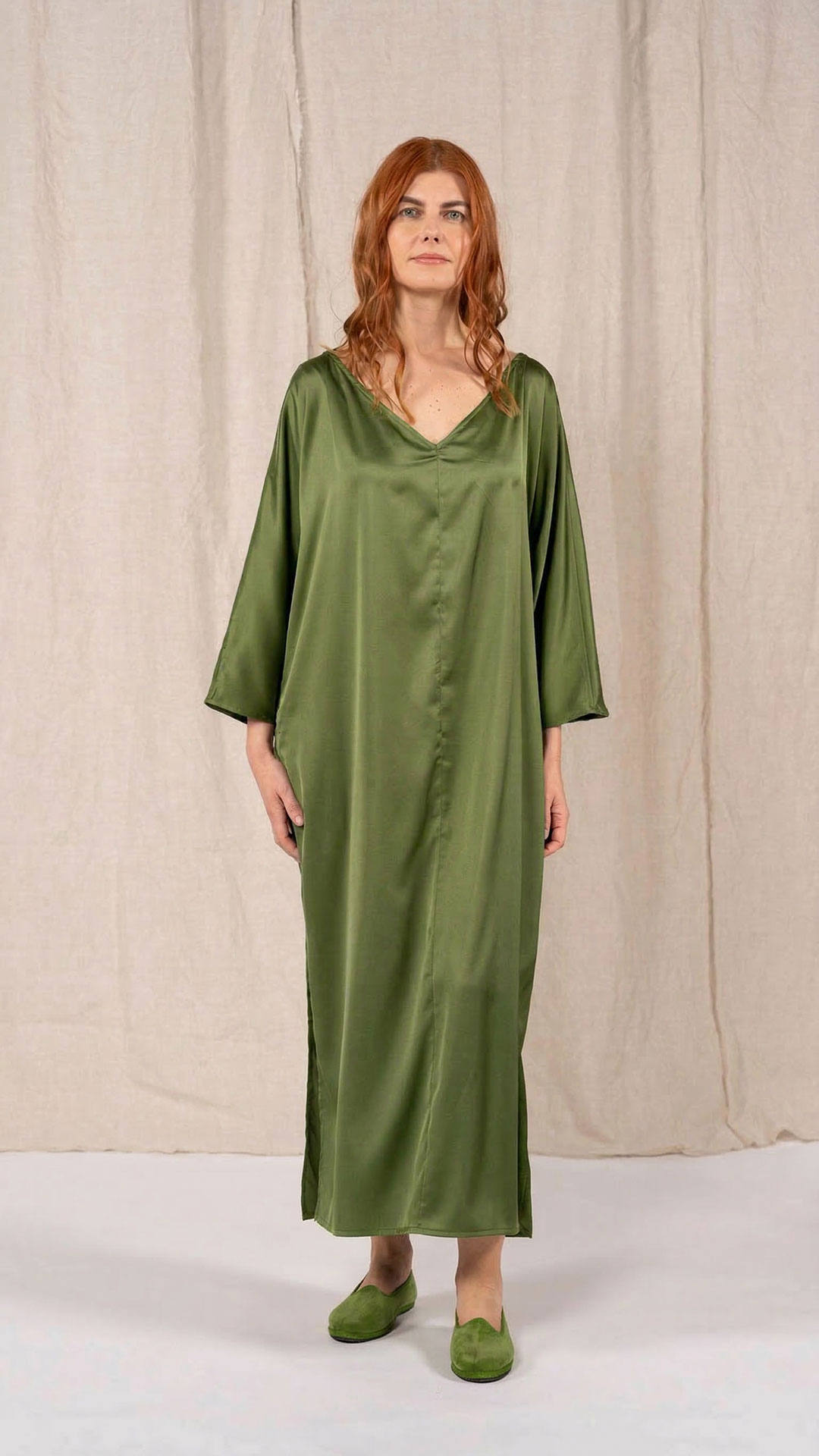 Abito composto da due pezzi distinti: una tunica con manica intera, scollatura asimmetrica, da un lato a V e dall’altro a barca, e uno stringhino in tessuto che può essere annodato al collo. Il capo presenta uno spacco laterale profondo. Un modello dalla forte versatilità e carattere, da interpretare anche in abbinamento alla gonna Palla.