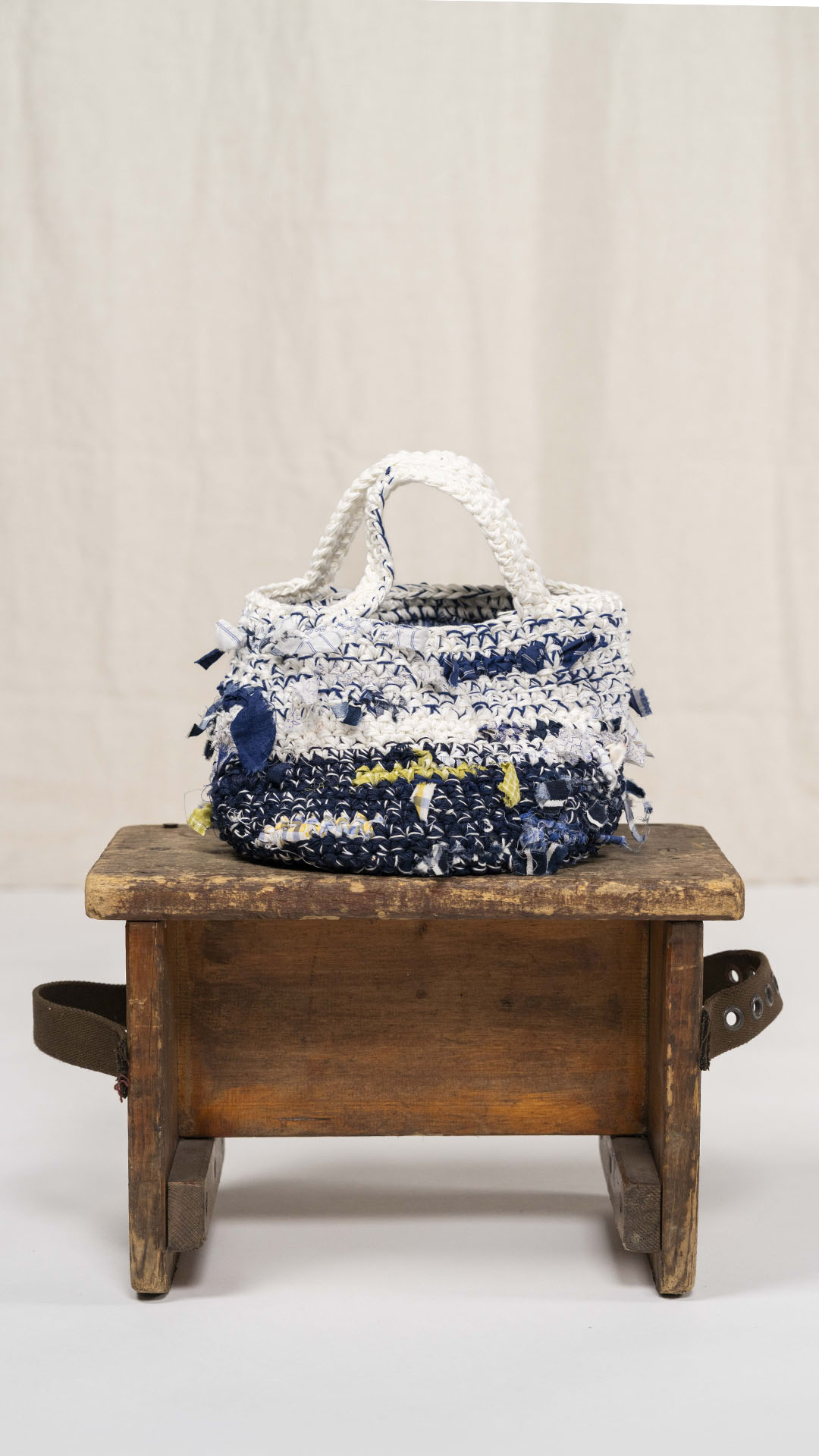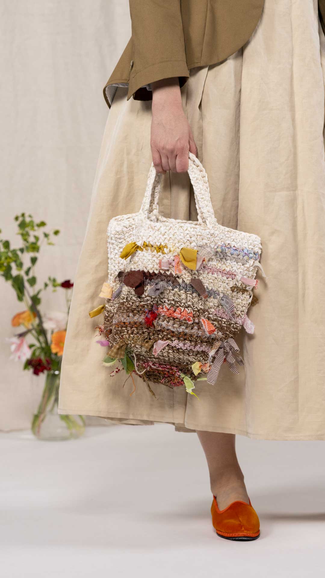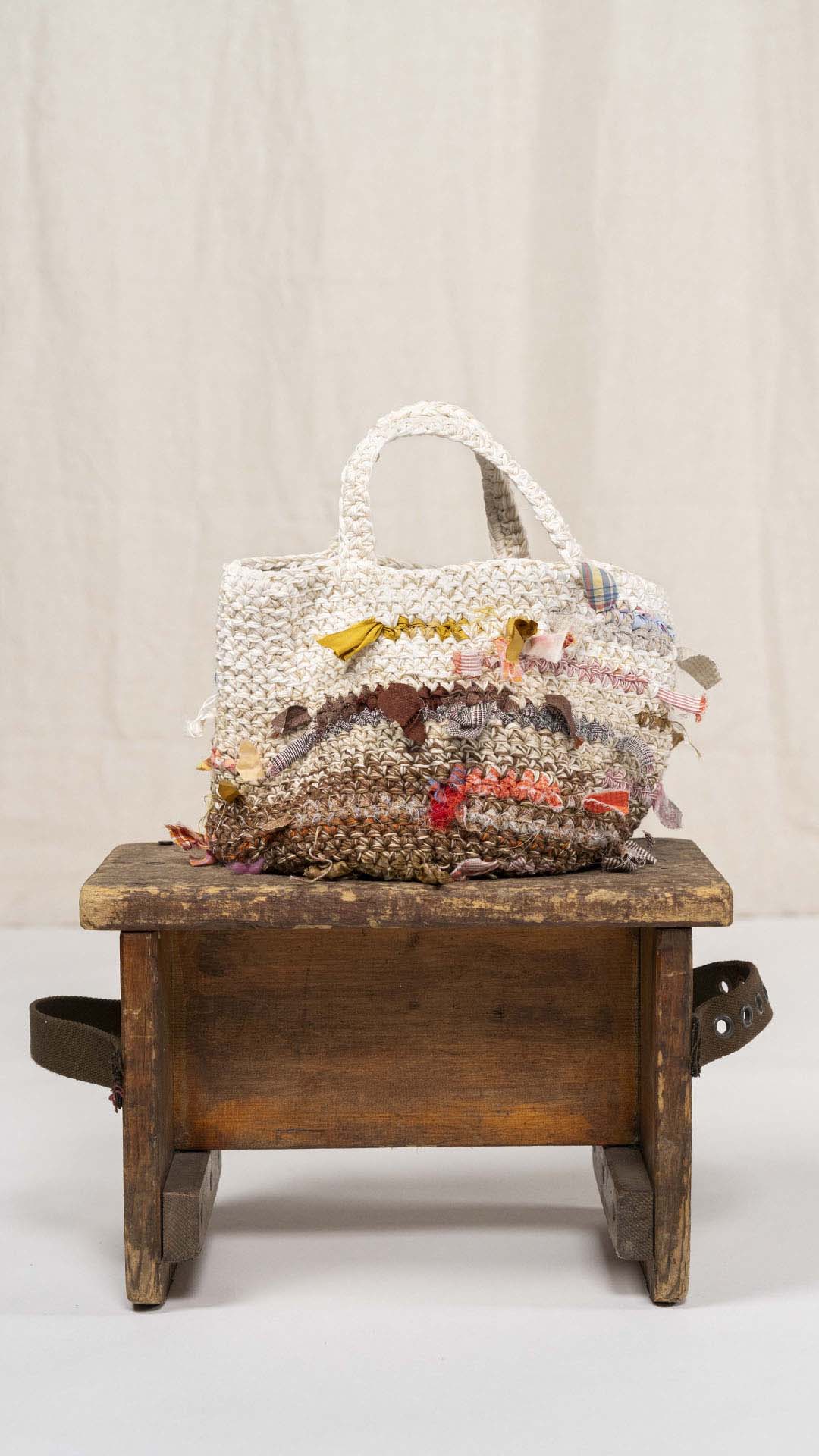 Borsa lavorata a uncinetto, con inserti di tessuto che seguono le gradazioni dei fili, come se fossero filati intrecciati tra loro. Ogni esemplare è unico nella sua composizione e nei dettagli.