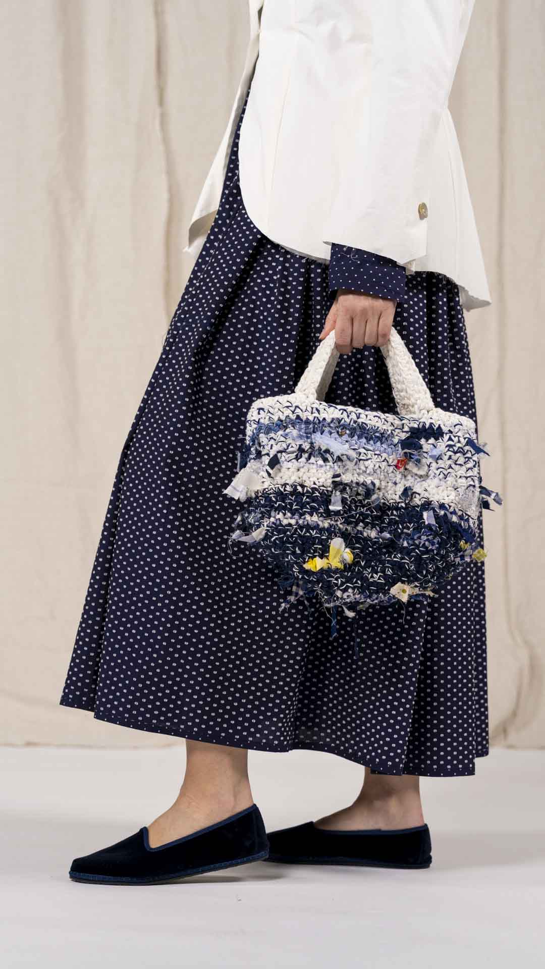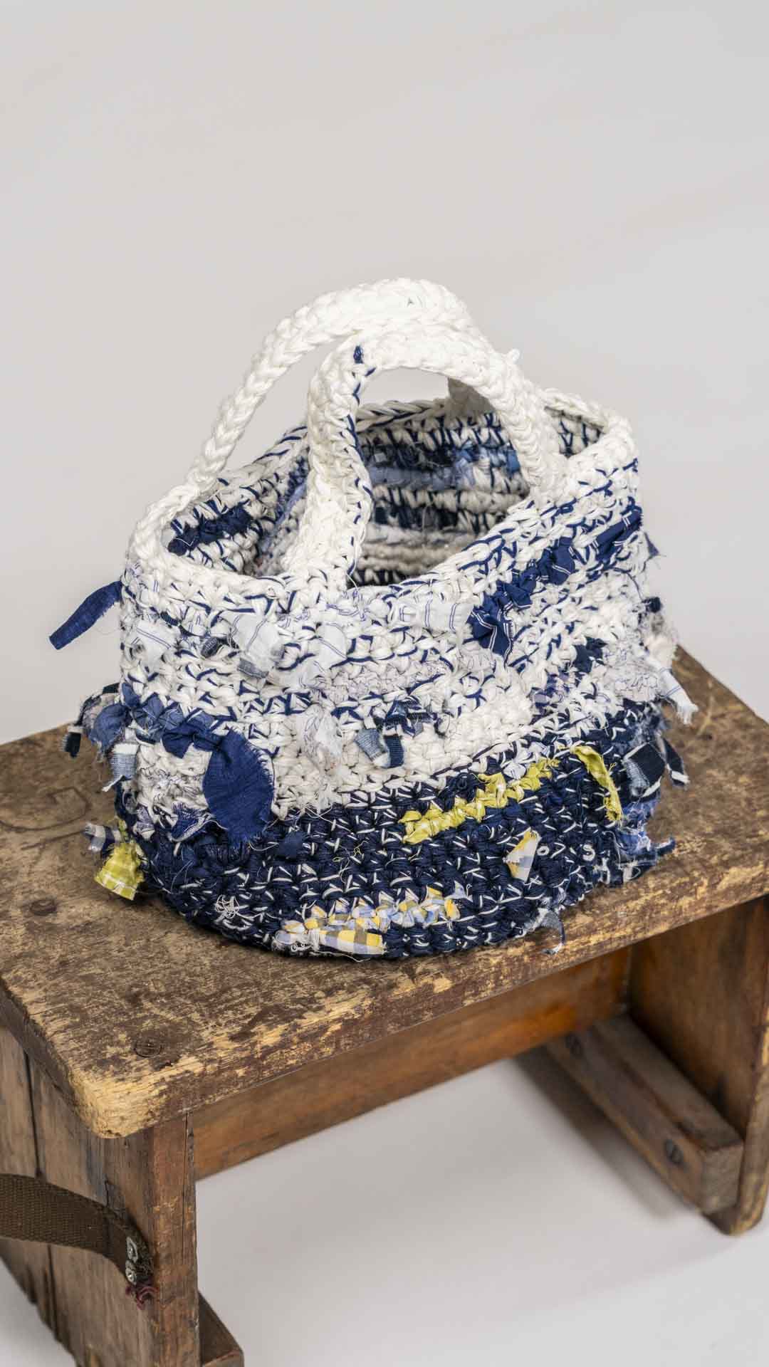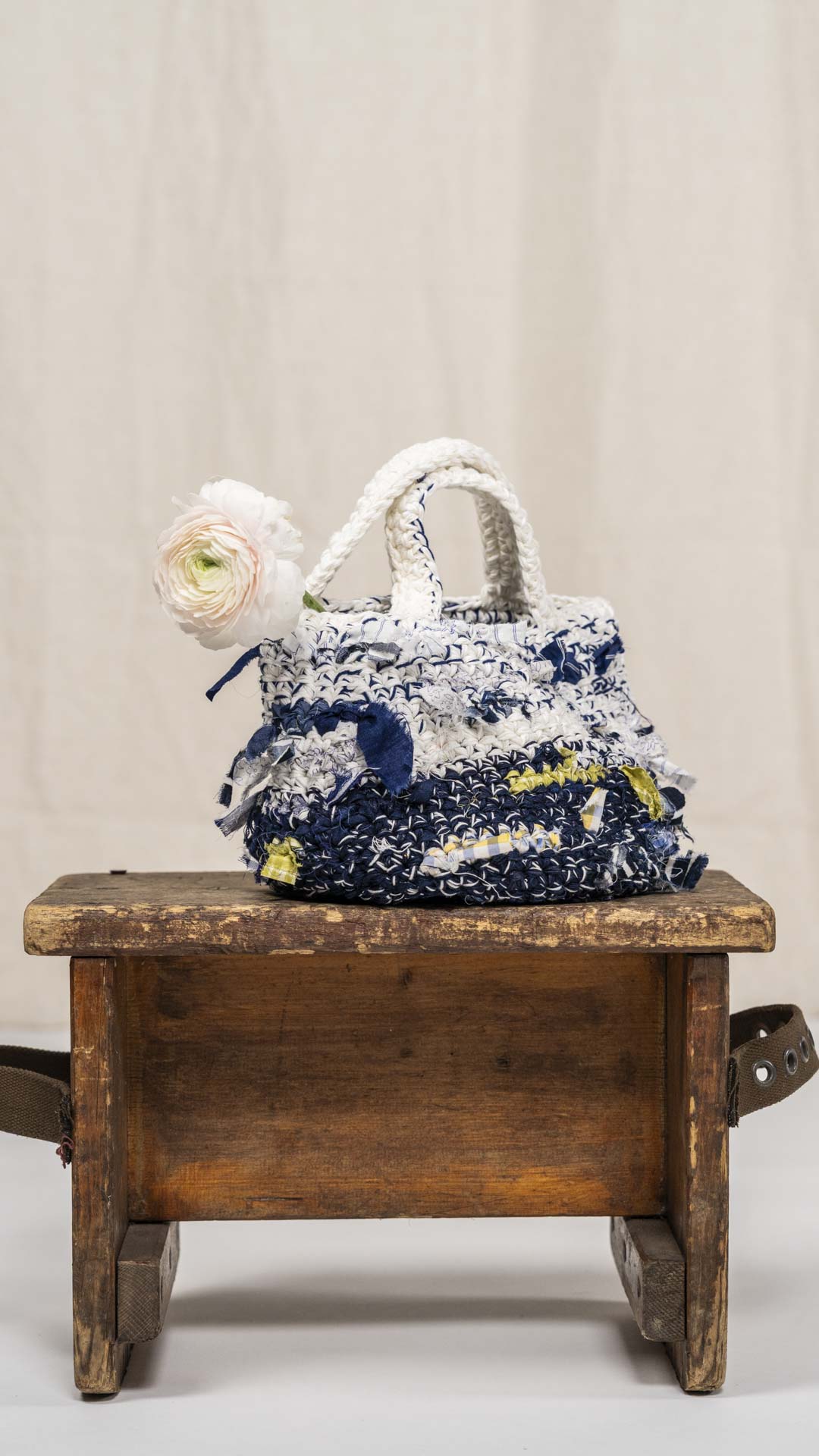 Borsa lavorata a uncinetto, con inserti di tessuto che seguono le gradazioni dei fili, come se fossero filati intrecciati tra loro. Ogni esemplare è unico nella sua composizione e nei dettagli.